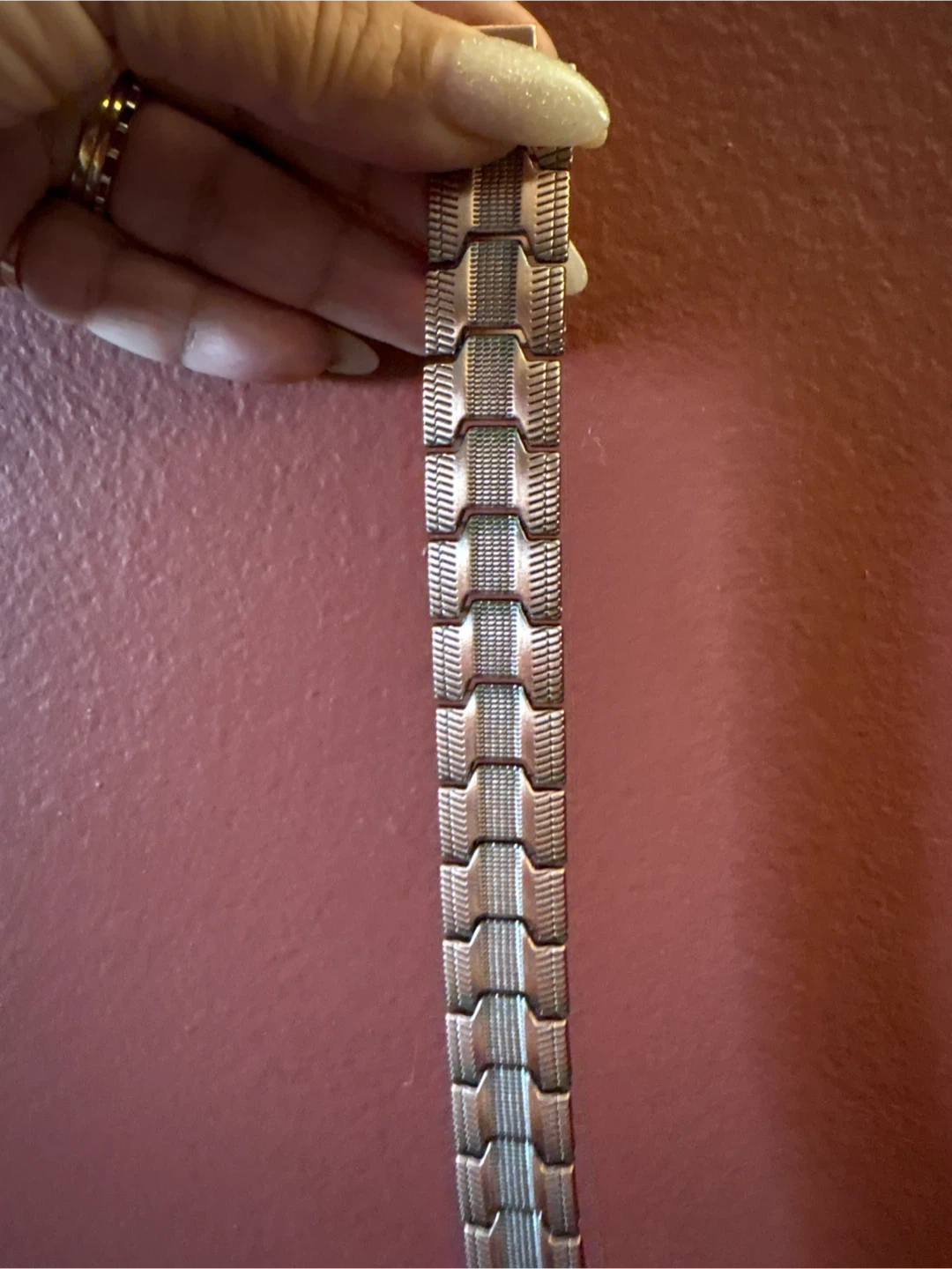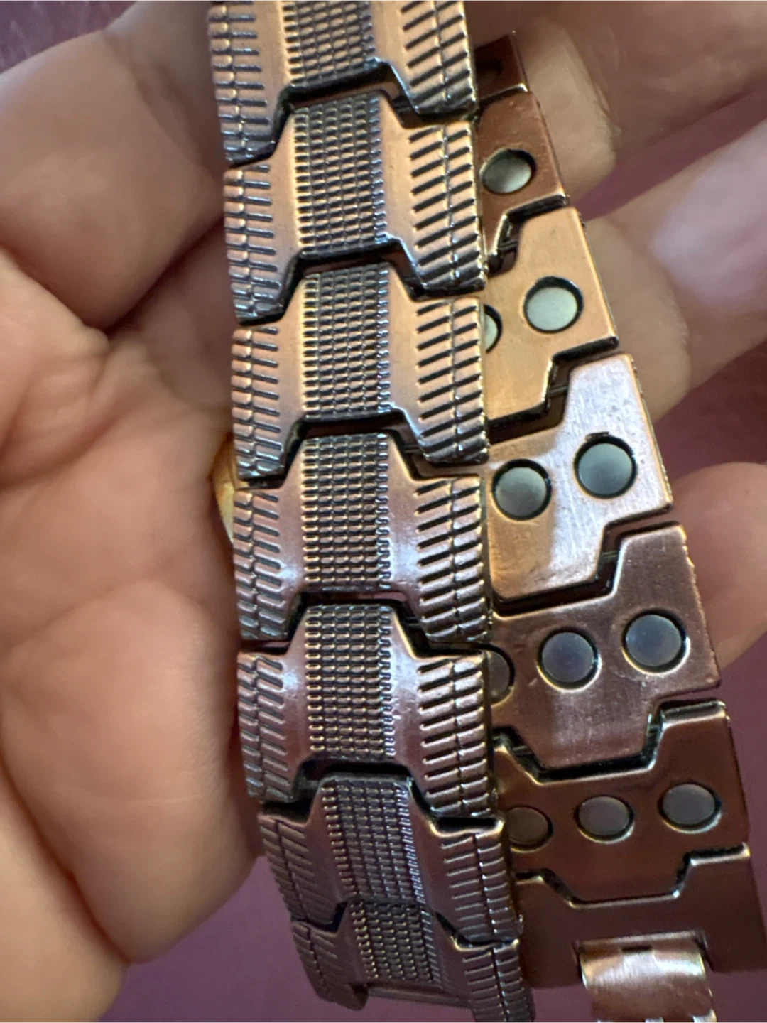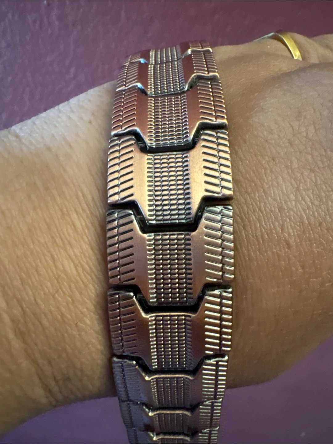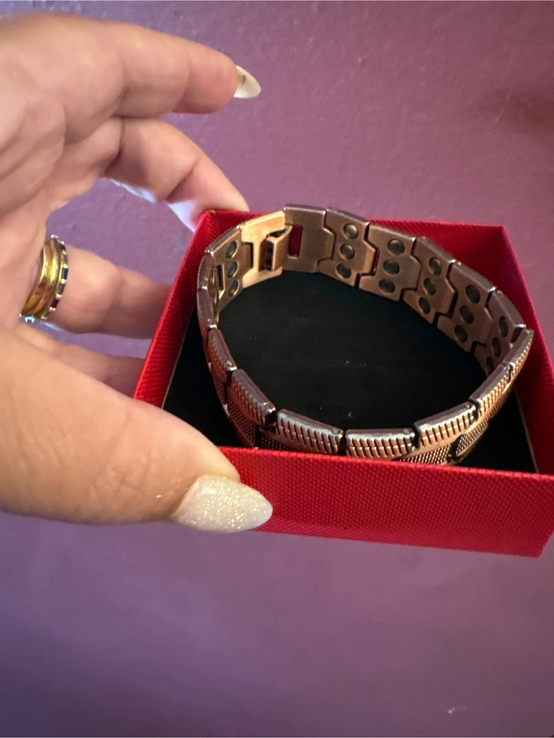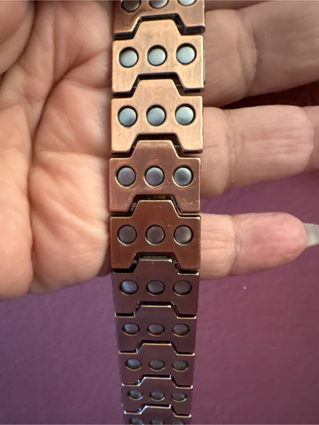 This copper bracelet features a segmented design with magnetic elements embedded on the inside. It's a stylish accessory that can be worn as a statement piece. New