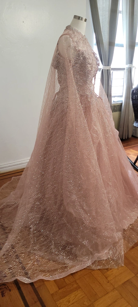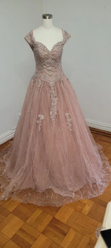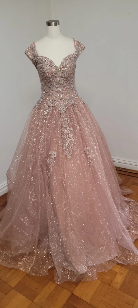 Selling a beautiful pink formal gown. It has a sweetheart neckline and intricate silver detailing on the bodice. The dress is made of a shimmering, textured fabric that catches the light beautifully. Perfect for a prom or special occasion