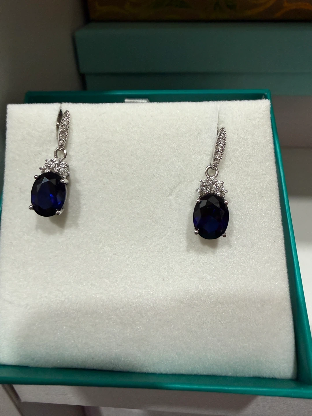 Elegant EFEY drop earrings featuring deep blue oval gemstones accented with small clear stones. These earrings have a classic dangle design. They're perfect for adding a touch of sparkle to any outfit!