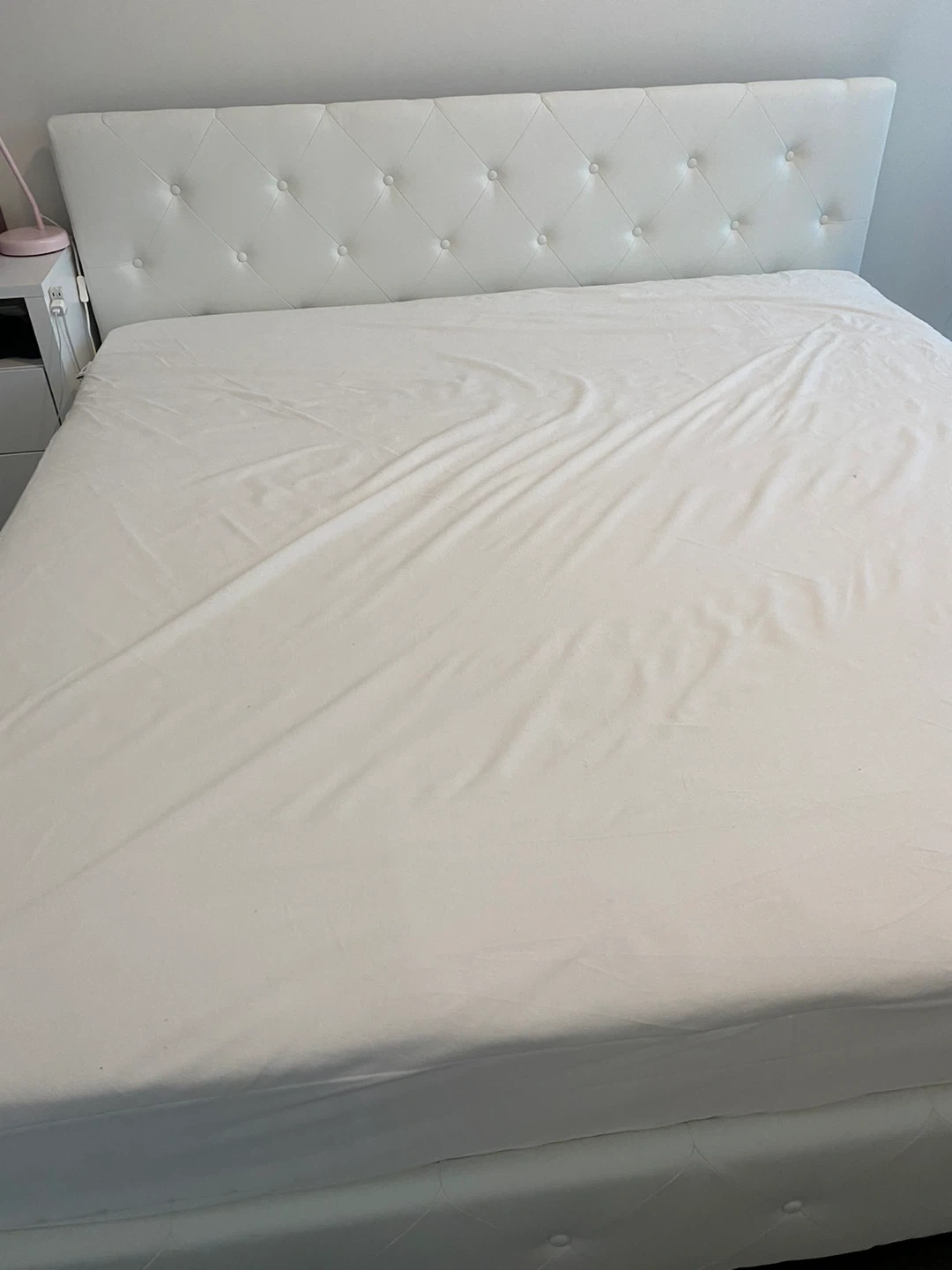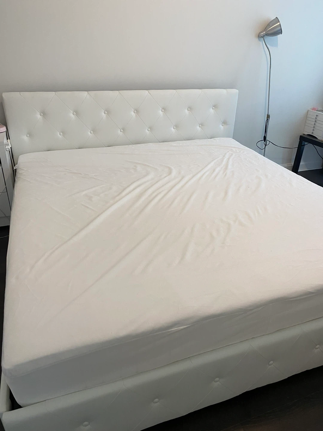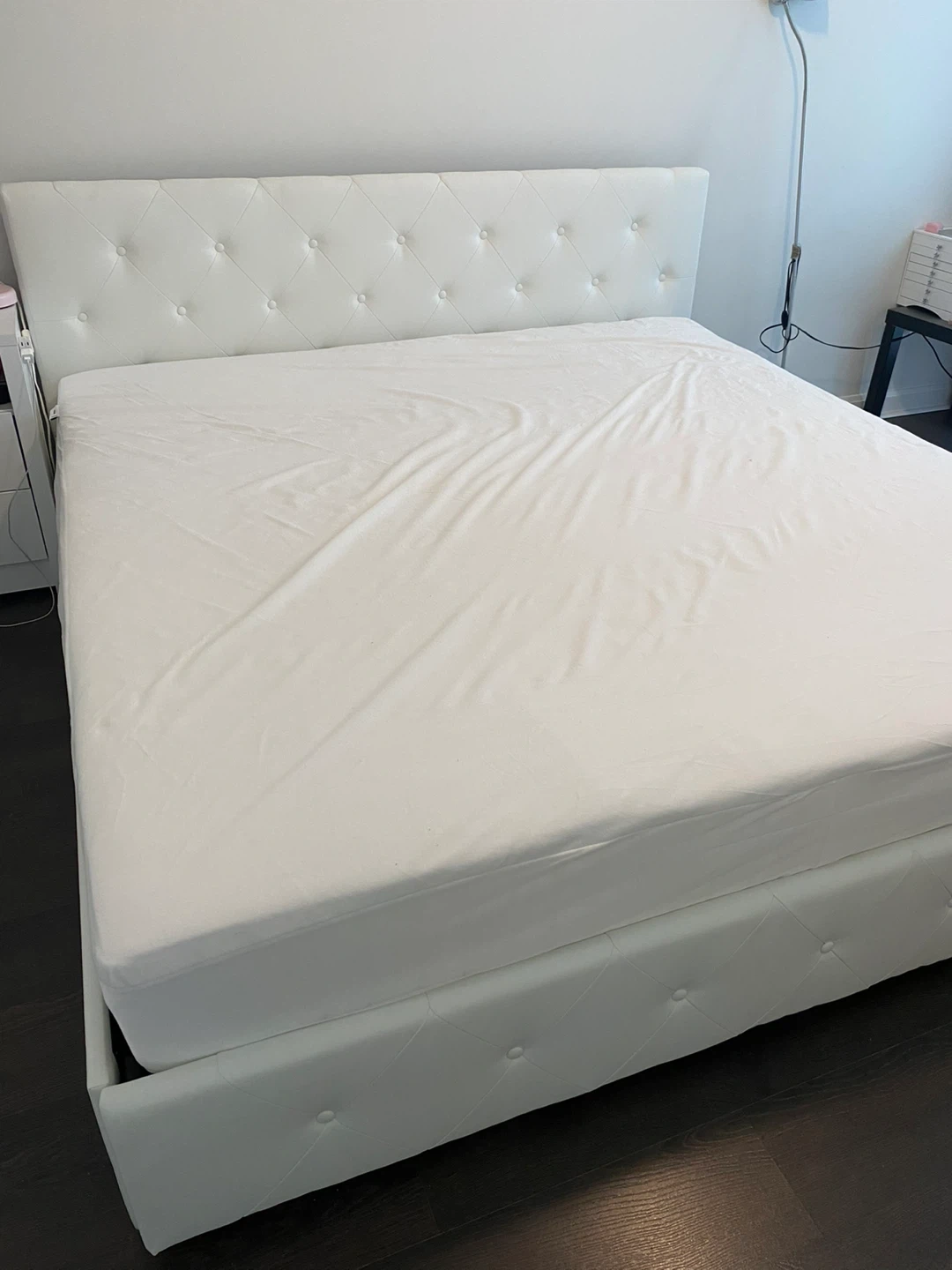 I'm selling a king size bed frame with a diamond tufted headboard and matress, offering both style and comfort to any bedroom. It has a clean and modern design, with 4 drawers. The neutral colour ensures it fits seamlessly with any decor. It is in great like new condition.