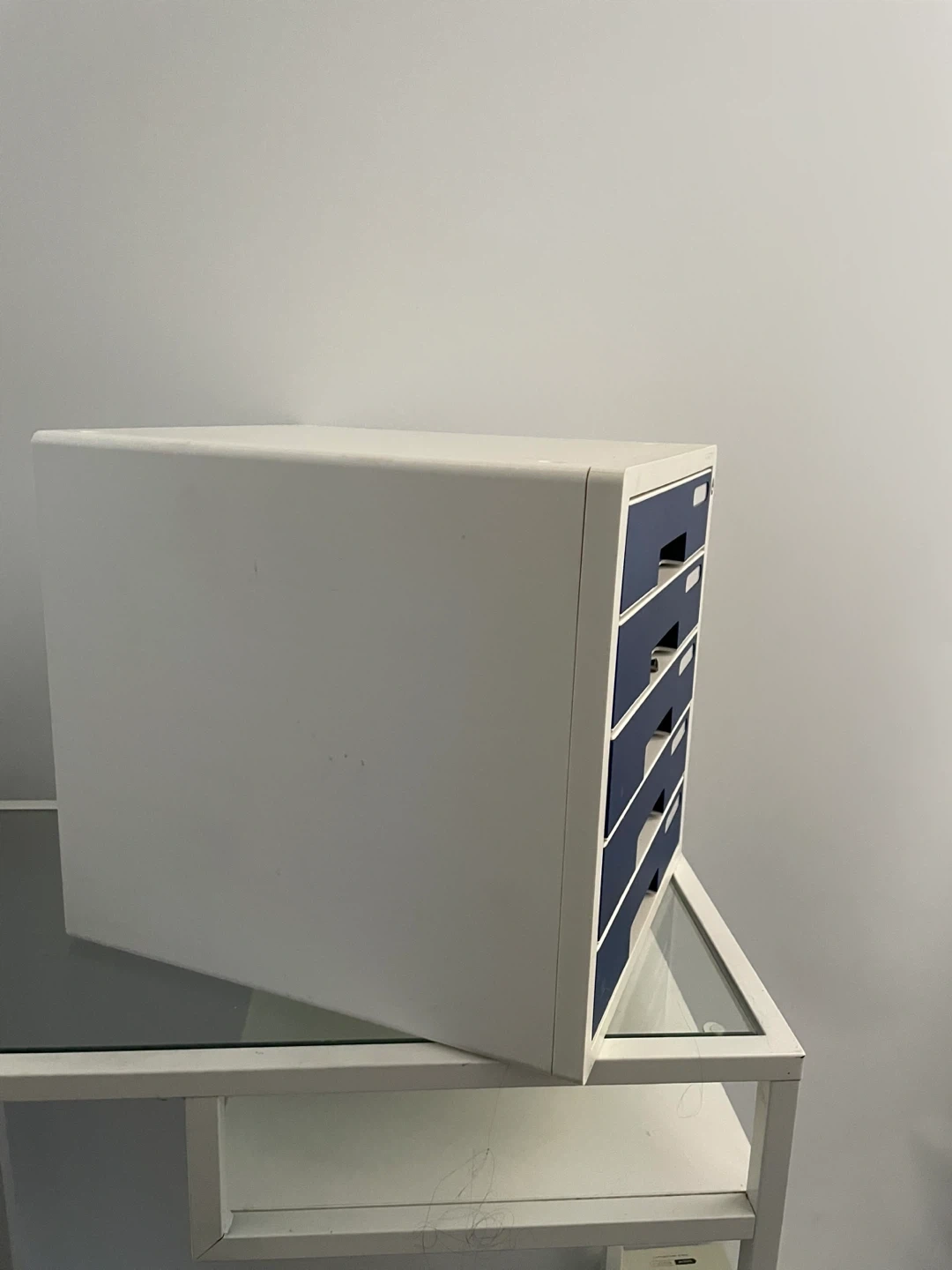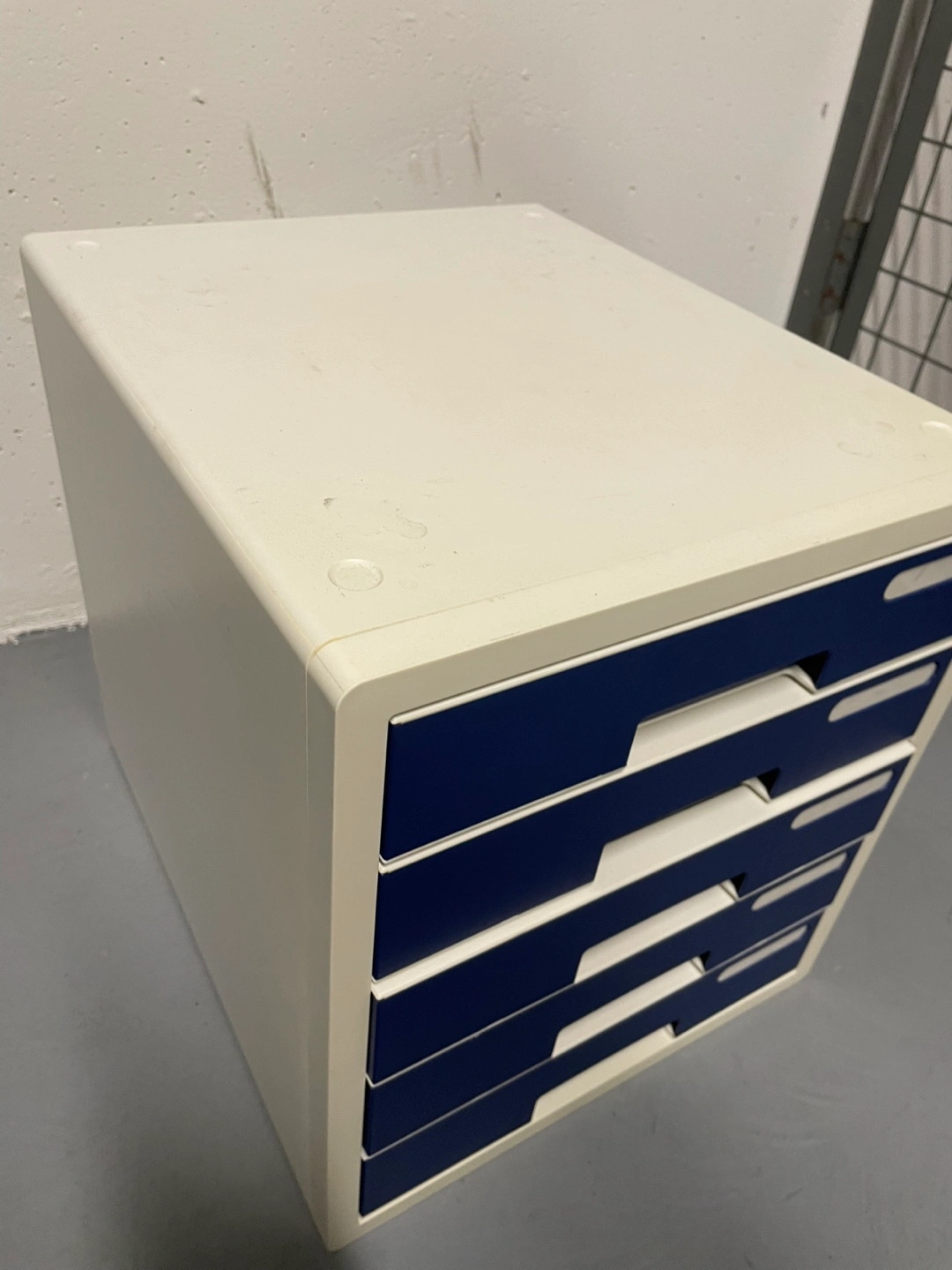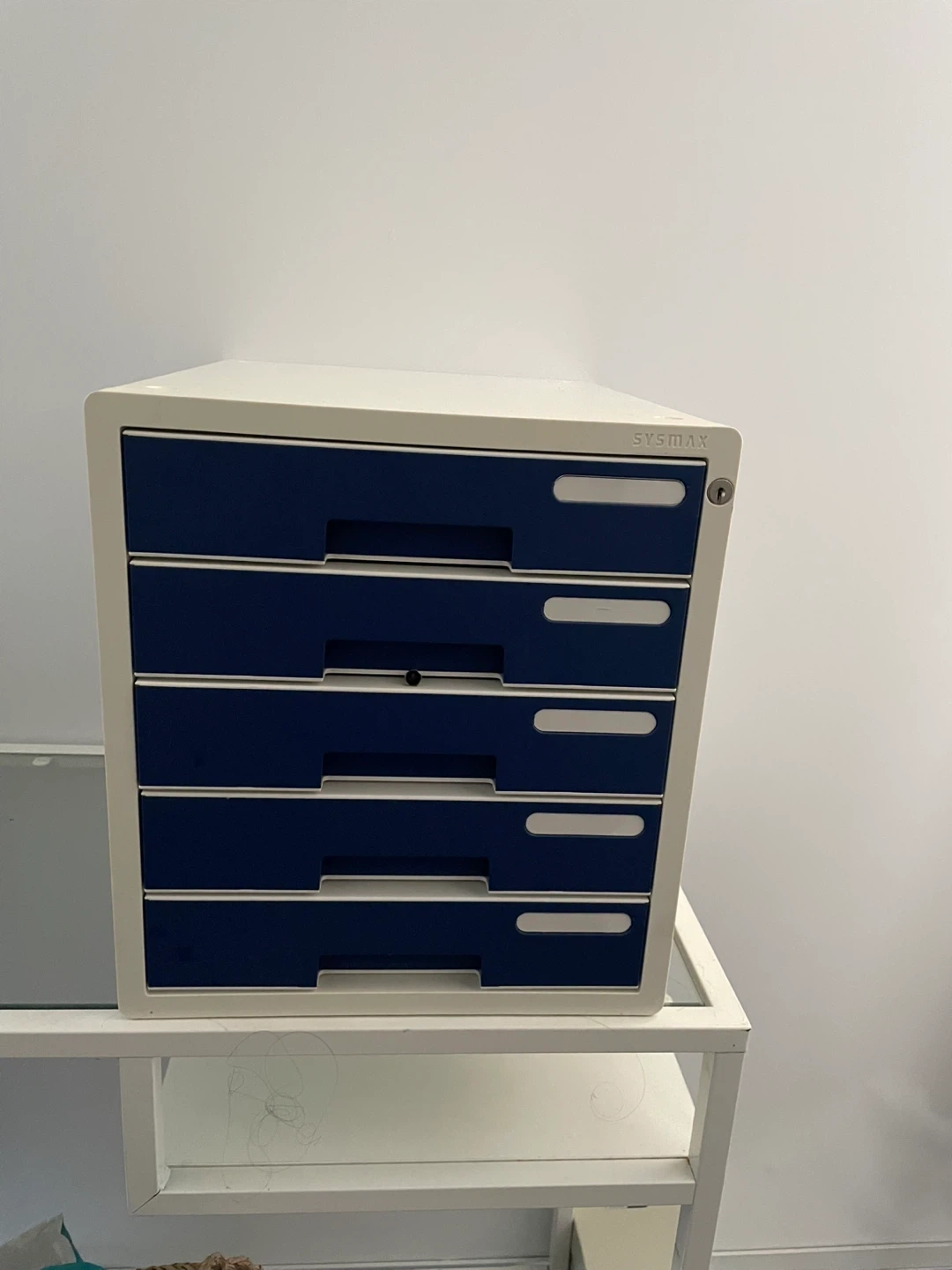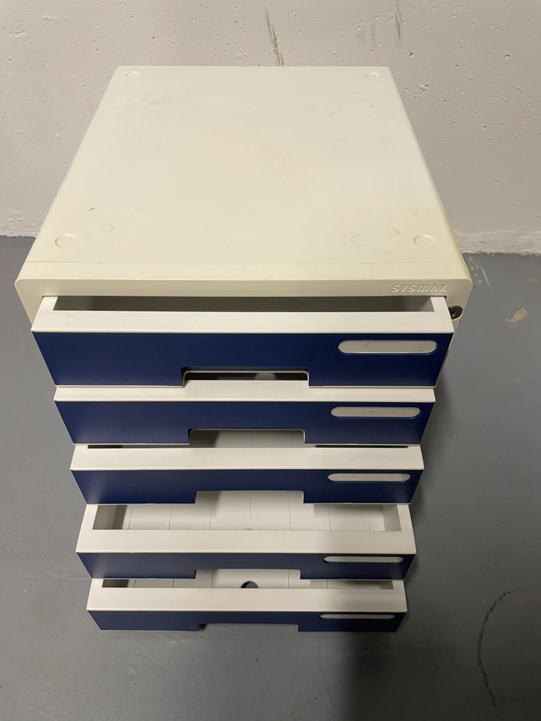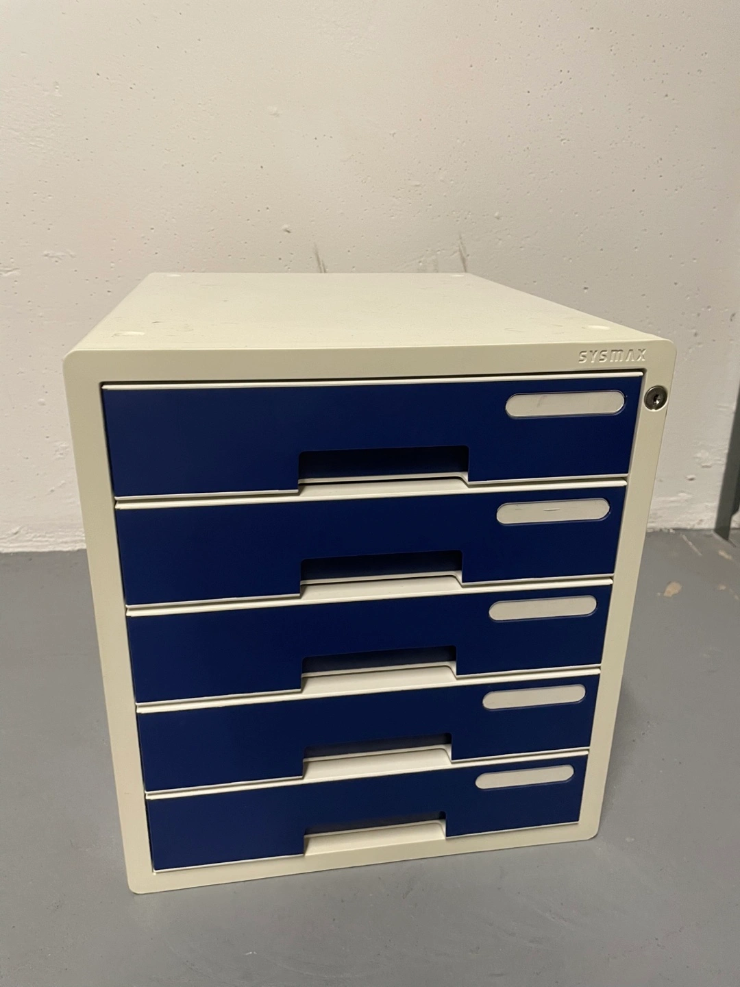 Looking to sell this SYSMAX filing cabinet! It features five drawers and is perfect for organizing your documents or office supplies. The cabinet is in good condition and ready for a new home. It has blue drawer fronts and a cream-coloured body