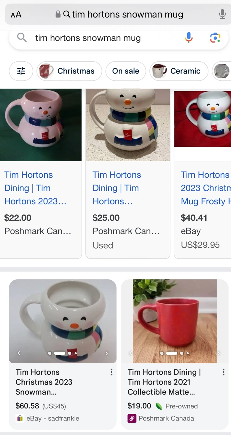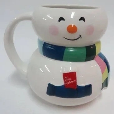 57A ceramic mug shaped like a snowman with a Tim Hortons logo on the front. He has timbits in his little back pocket. π New. Never Used.