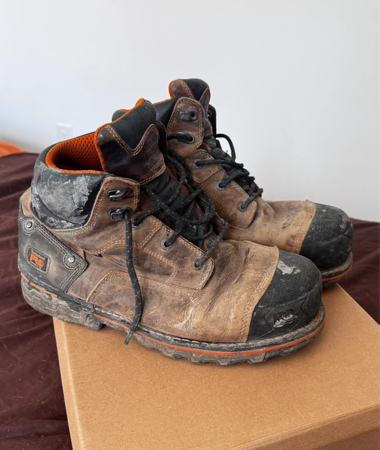 Selling a pair of Timberland PRO work boots with anti-fatigue technology. Size 12W. They show signs of wear, but they're still sturdy and ready for work!