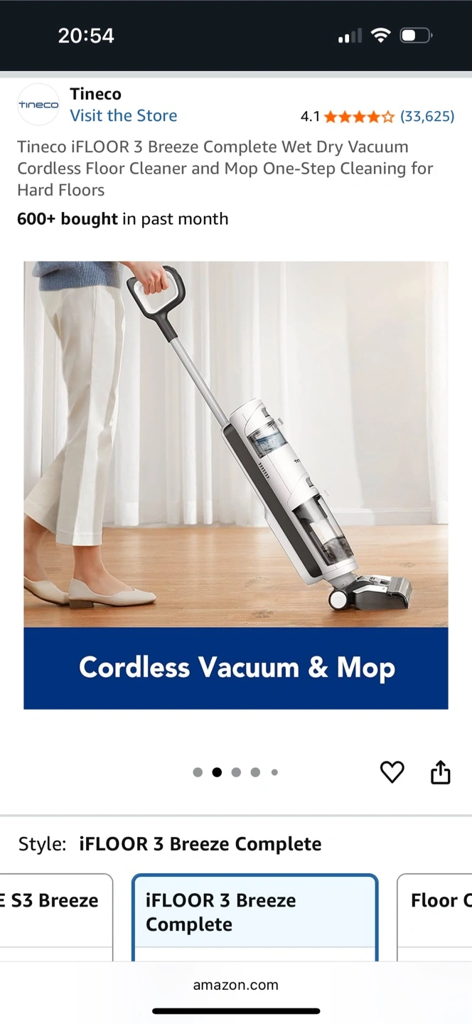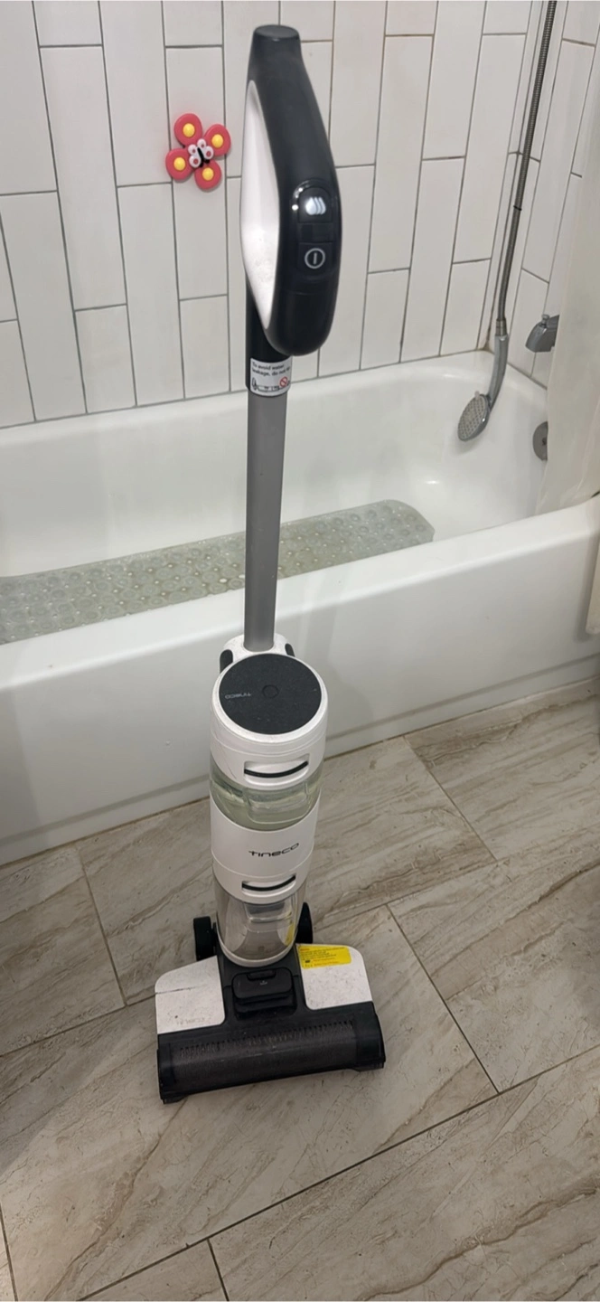 Selling a Tineco iFLOOR 3 Breeze Complete Wet Dry Vacuum Cordless Floor Cleaner and Mop. It's a one-step cleaning solution for hard floors. Includes 2 brush rollers, 2 bottles of cleaning solution, a charging base, and a dry filter