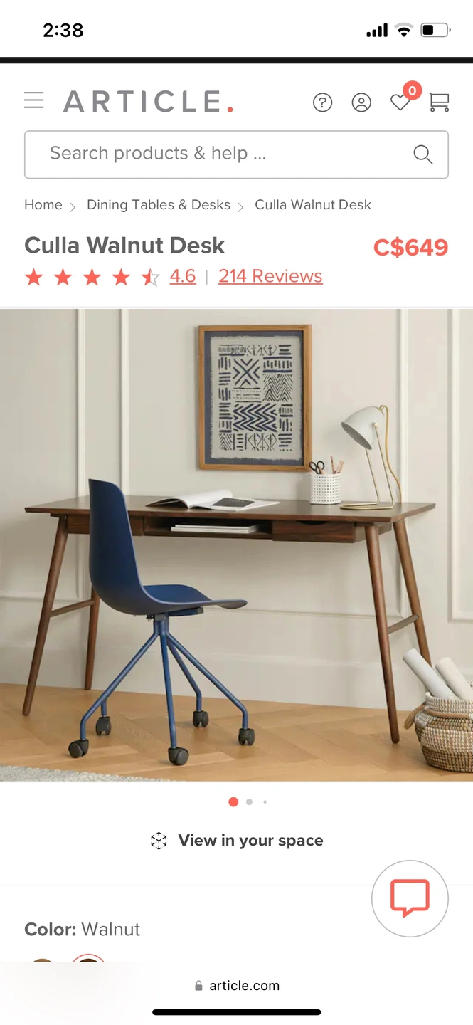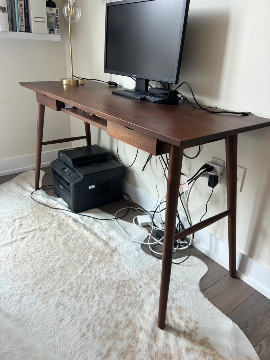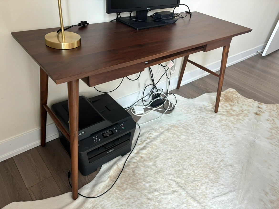Slim profile but spacious. Two drawers and a shelf. We paid $649 plus tax and shipping. No scratches or stains.