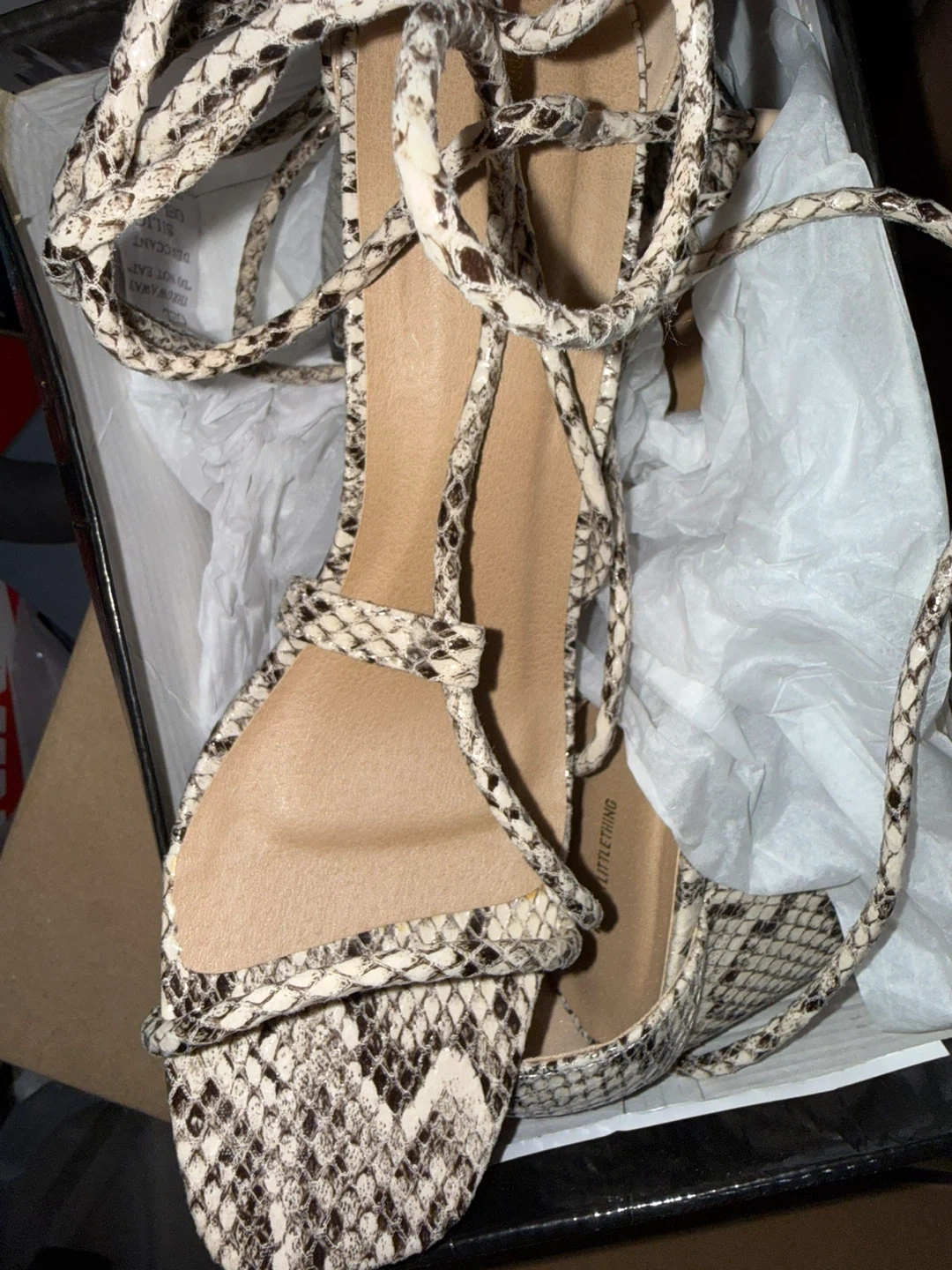 These PrettyLittleThing heeled sandals come in a natural snake print PU. They're a size 4 (UK) / 37 (EU). Lace-up detailing around the ankle.