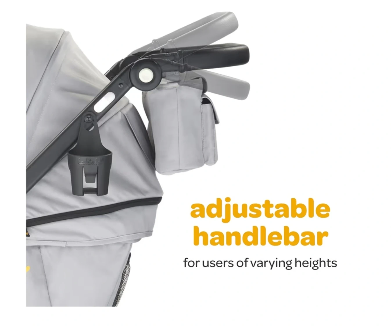 This Larktale double stroller is the Caravan Coupe Quad V2 model. It's black with a tan leather handle grip. It has an adjustable handlebar for users of varying heights. The stroller weighs 46.3 lbs and measures 49.5" L x 30" W x 42.5" H when open.