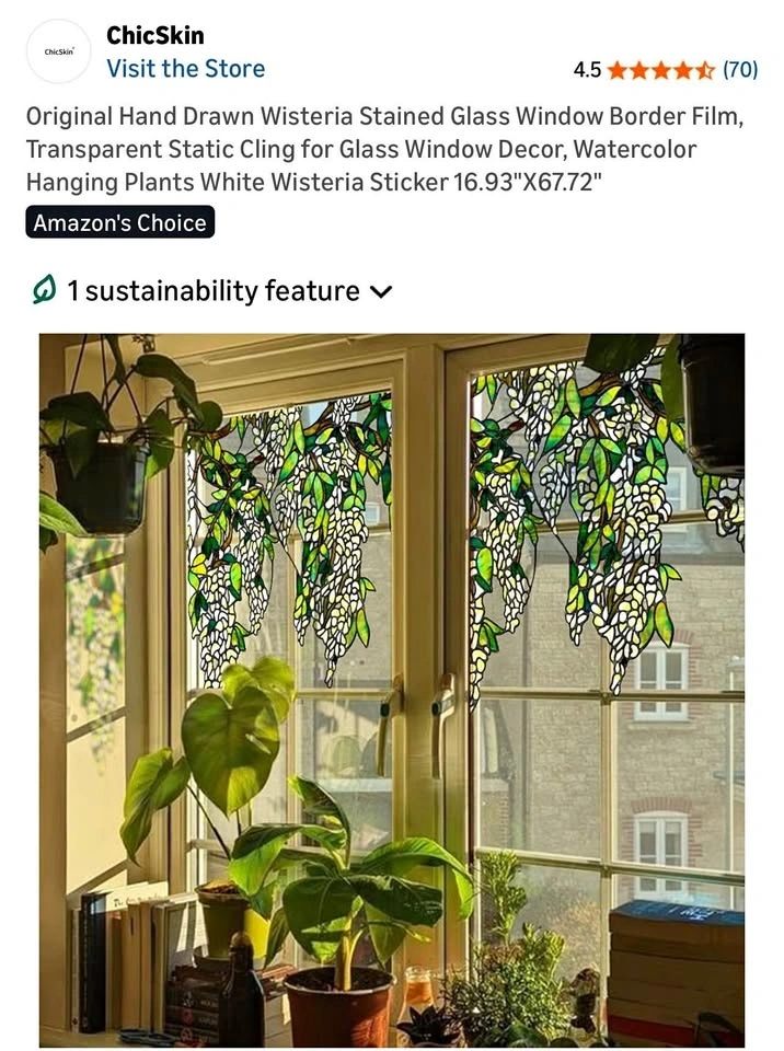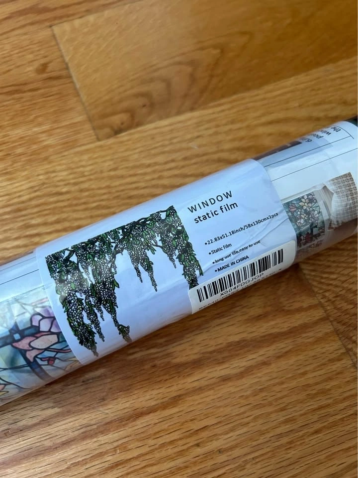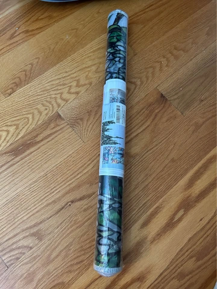 Never opened! Stained glass static film cling that easily sticks to your window without adhesive and adds a really pretty watercolor mural design to the top of your window.