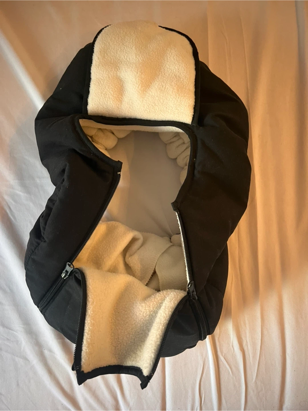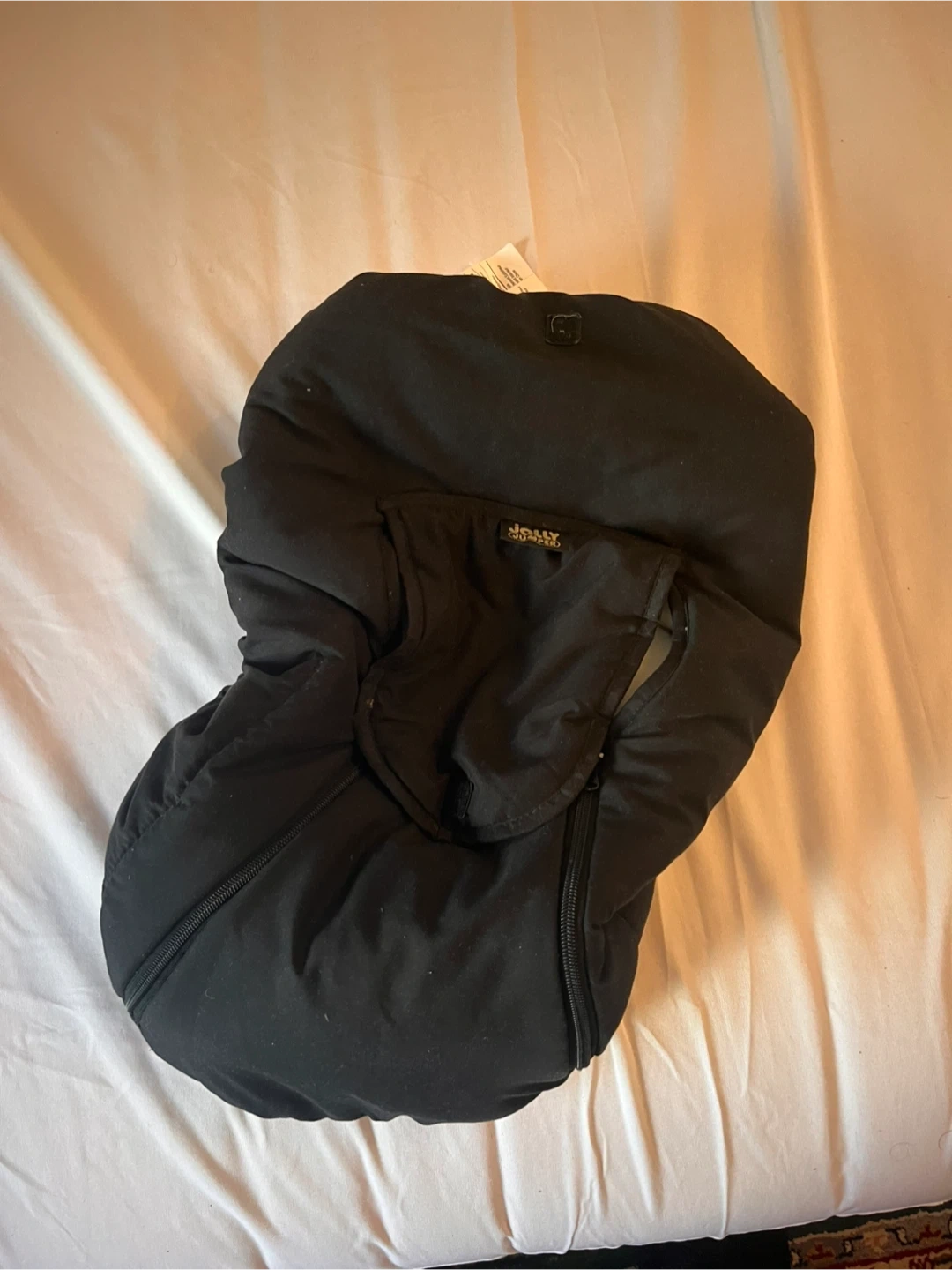 This black Jolly Jumper footmuff for car seat is designed for infants. It features a cozy fleece lining and a zippered front for easy access. Keep your little one warm and snug during chilly outings!