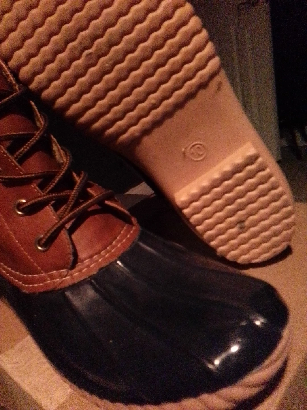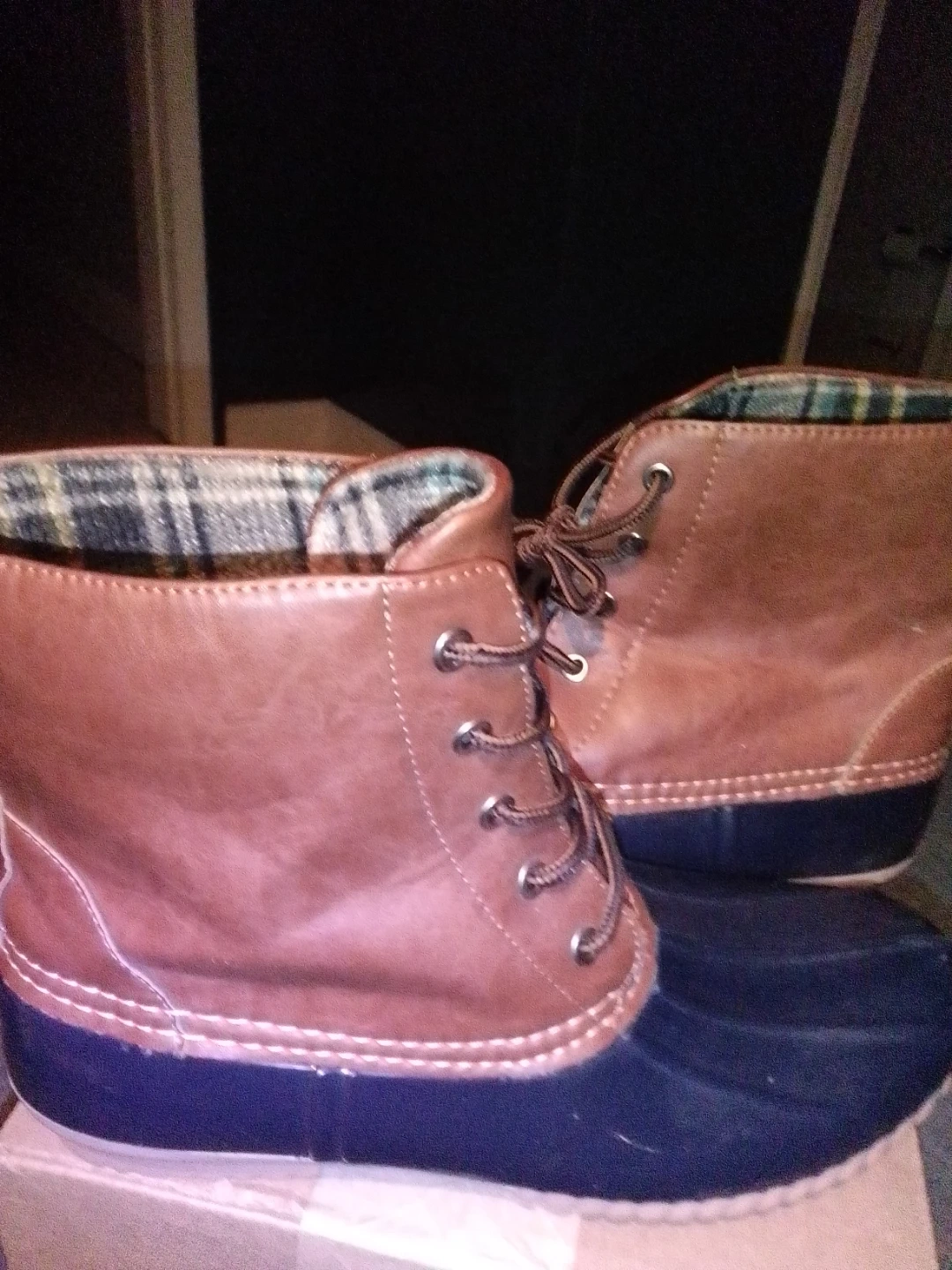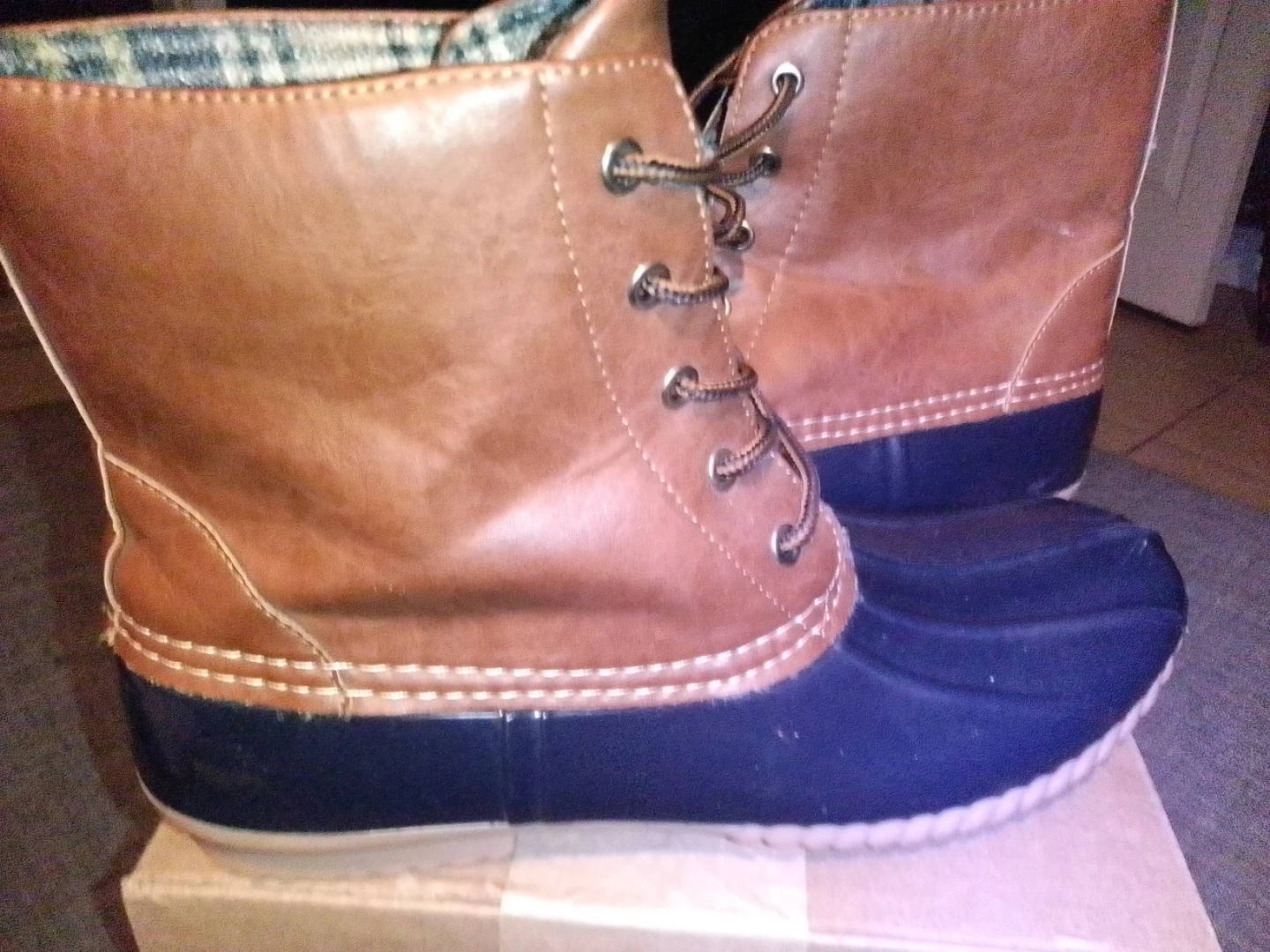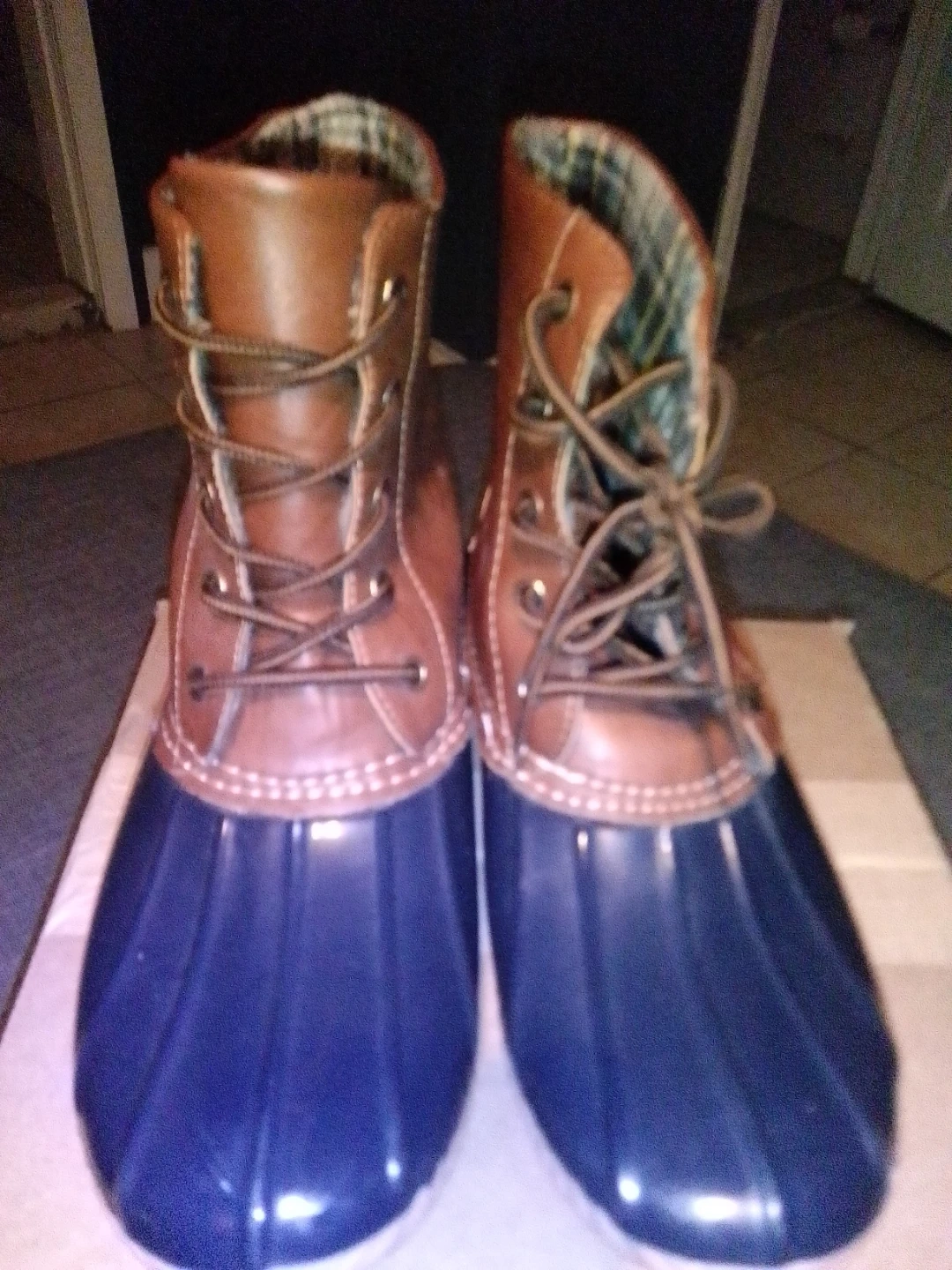 Classic duck boots featuring a brown leather upper with a navy blue waterproof rubber toe and sole. They have a cozy plaid fabric lining and lace-up closure. Perfect for keeping your feet dry and warm!