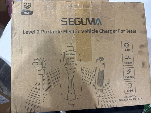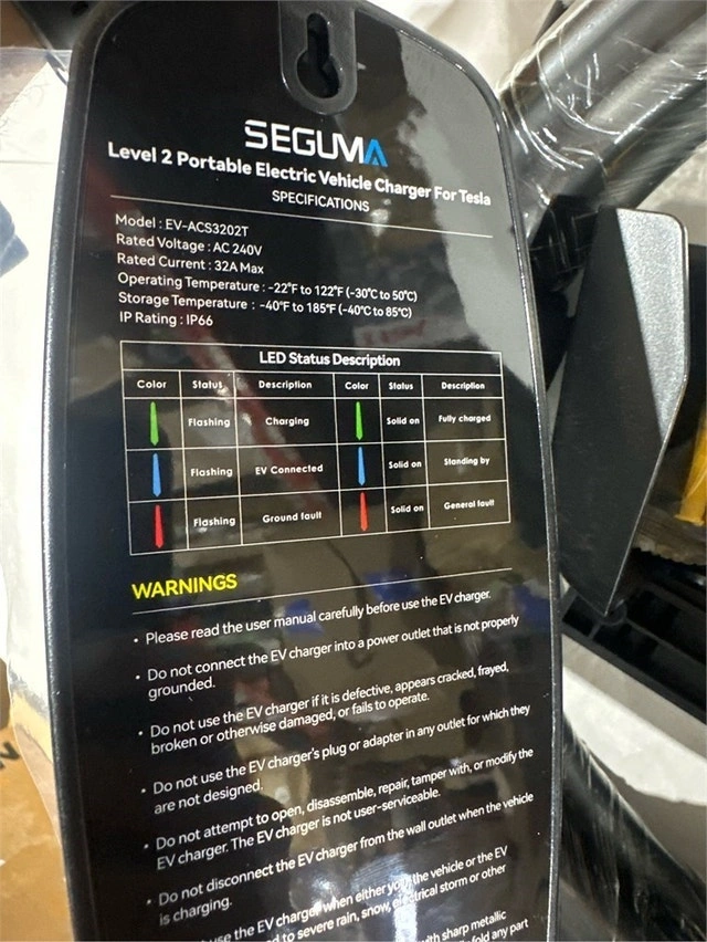 Brand new, box opened for inspection, never used. Complete. This Seguma 32amp Level 2 EV charger with NEMA 14-50 plug offers high-speed charging up to 7.68kW, which is 6X faster than Level 1 chargers. You can adjust the charging current from 10A to 32A to suit your needs. It's compatible with all NACS connectors, including Tesla Model Y, 3, S, and X. The charger features an intelligent 1.77" TFT display showing real-time charging data like amperage, voltage, power (kWh), and charging time. LED indicators also show charging status. It has built-in safety features including protection against leakage, over/undervoltage, overcurrent, overheating, and short circuits. With an IP66 waterproof rating and a wide working temperature range (-22°F to +122°F), it's suitable for various environments. The charger automatically shuts off when the vehicle is fully charged. The 23ft cable provides flexibility. It comes with a cable holder, control box holder, and a carry bag, making it usable as a wall connector or a portable charger. Pickup is near Kipling and Evans.