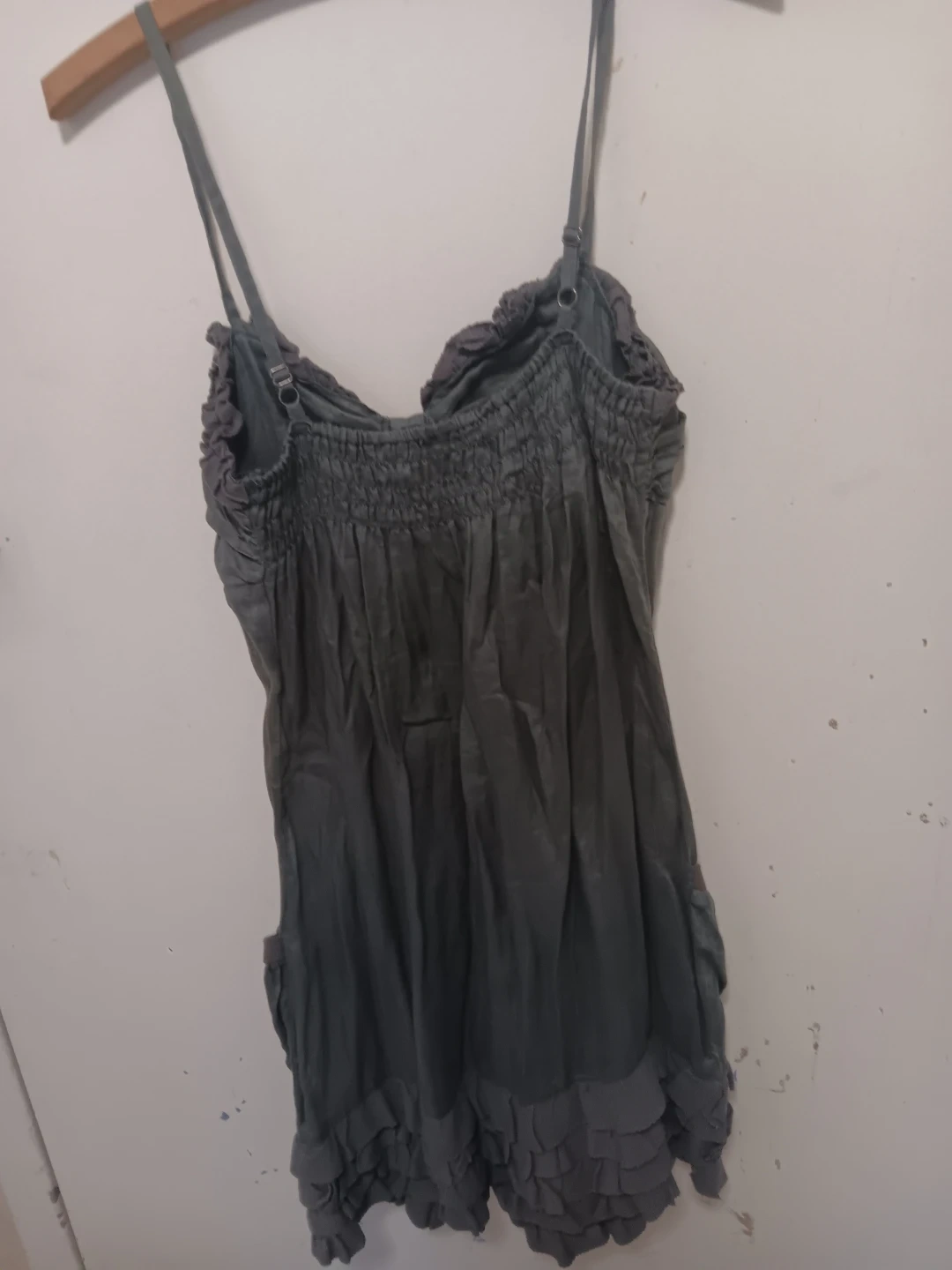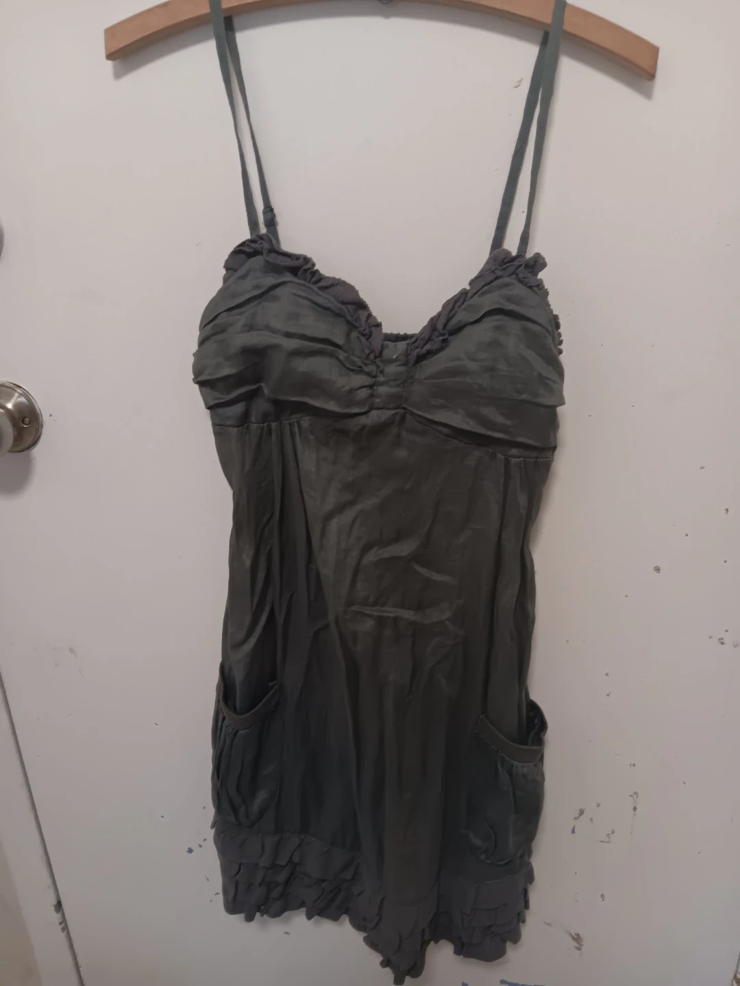 This is a green silky mini summer dress with adjustable spaghetti straps. It features smocking on the bodice and ruffled trim along the hem and neckline. Two pockets are located on the front.