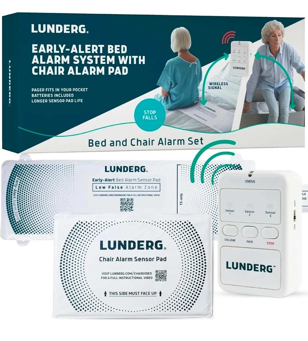 Lunderg Early-Alert Bed and Chair Alarm System with bed sensor pad and chair sensor pad. Includes monitor, wall mount bracket, AA batteries, bed clips and bands. Wireless signal.