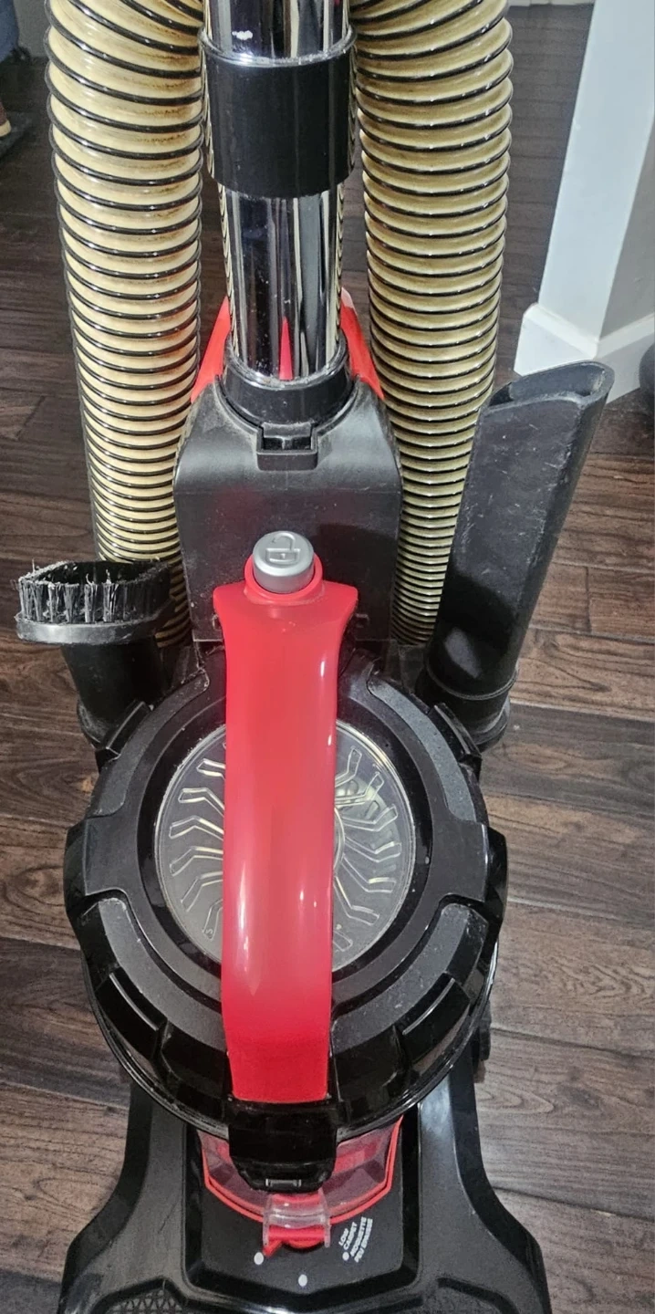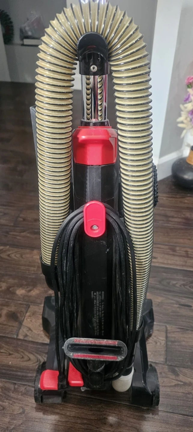 This Eureka PowerSpeed upright vacuum cleaner is black and red. It features a bagless design with a large capacity dustbin. The flexible hose and brush roll make it versatile for different cleaning tasks.