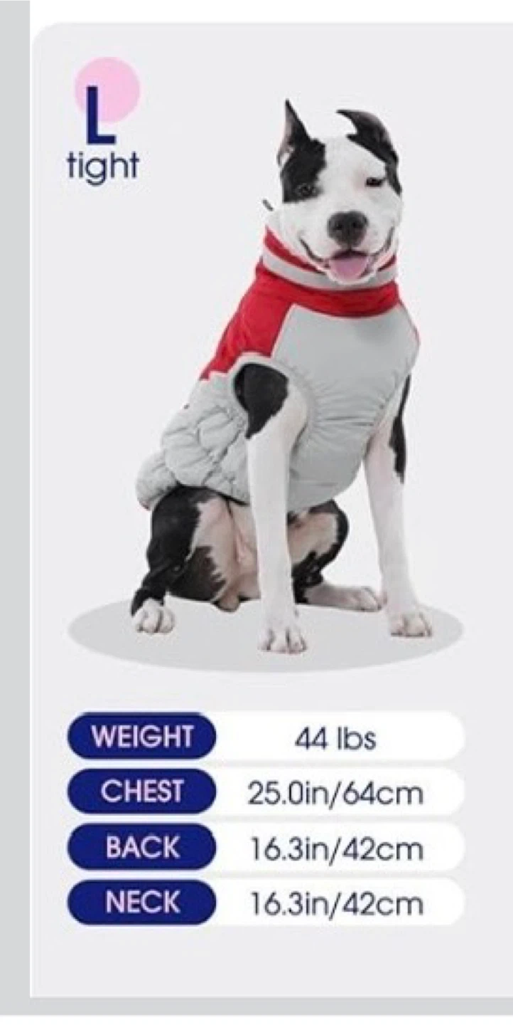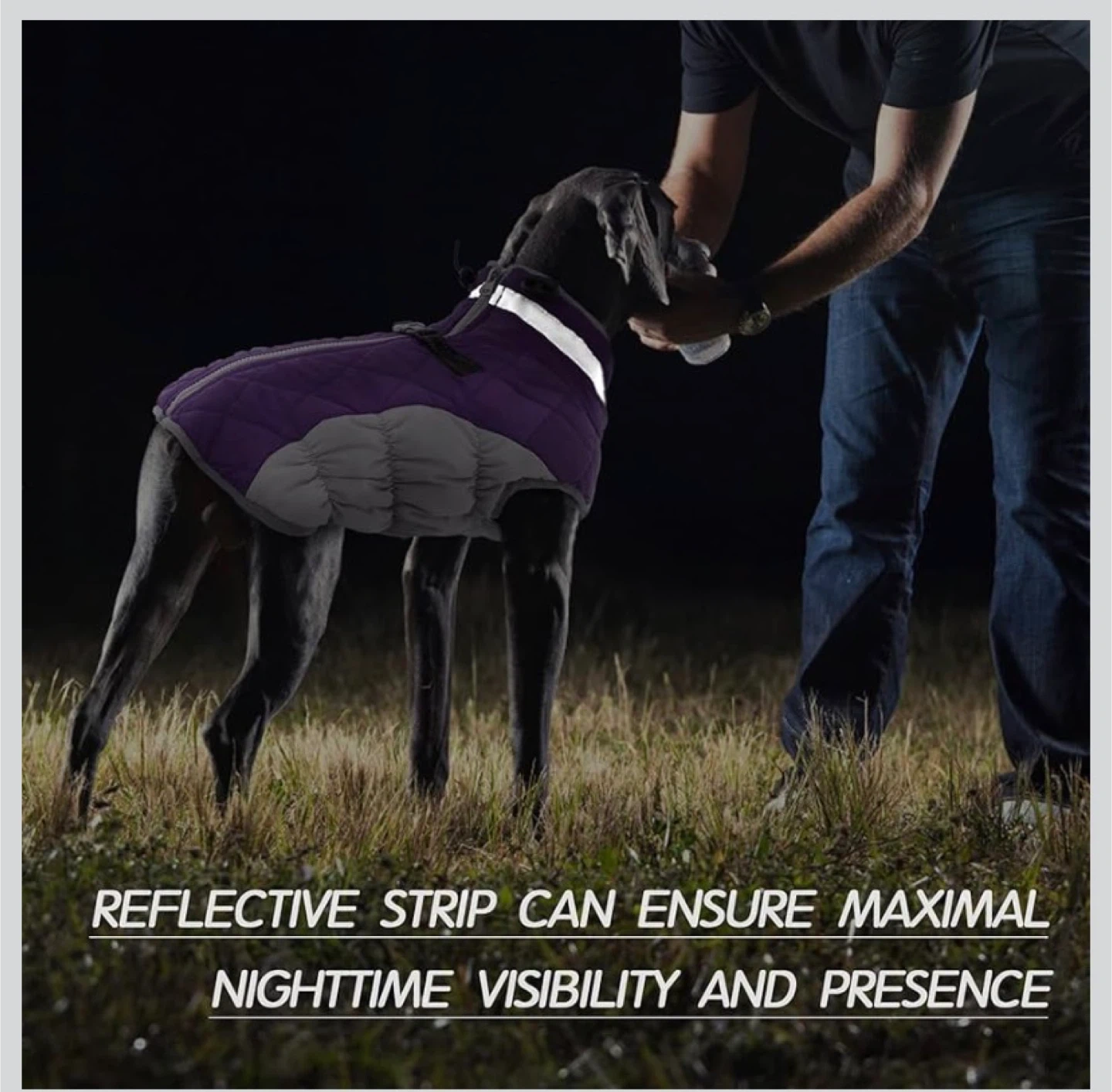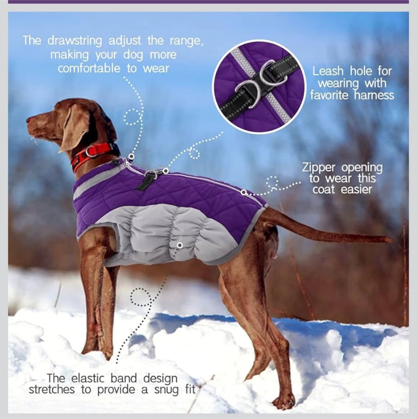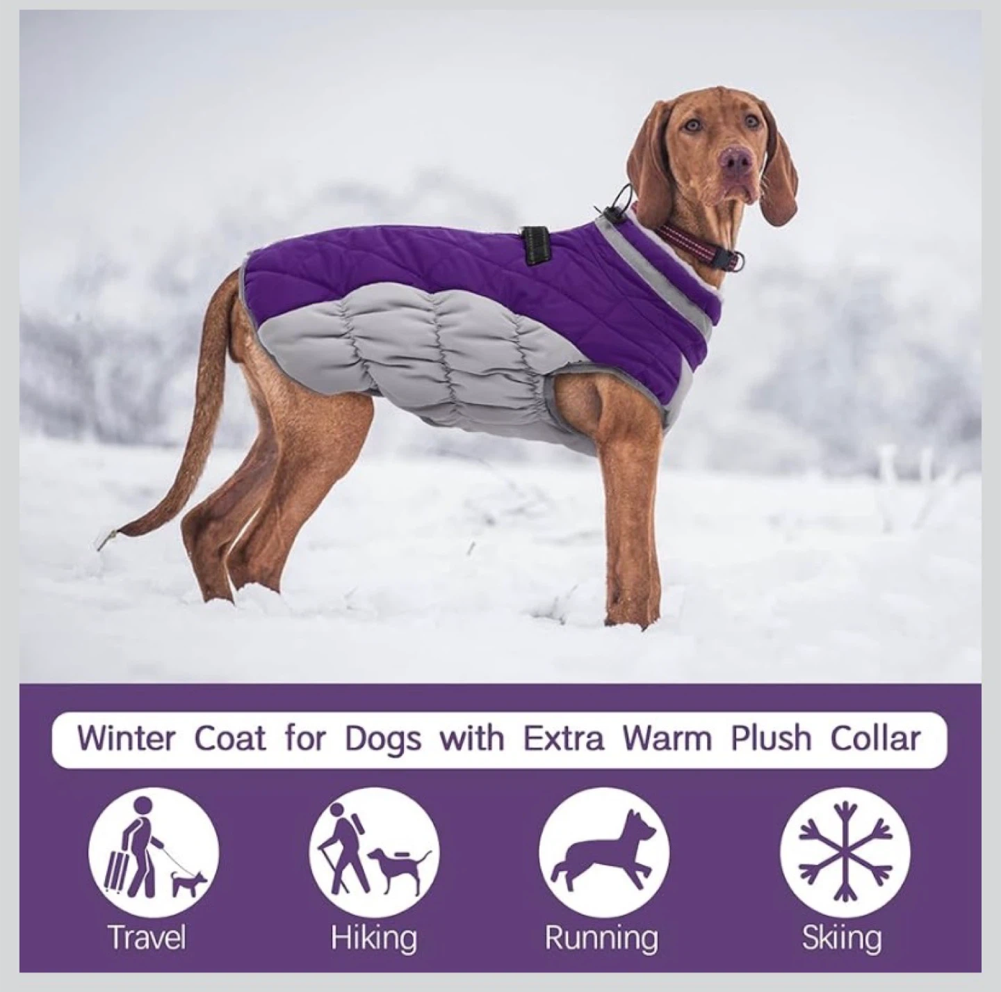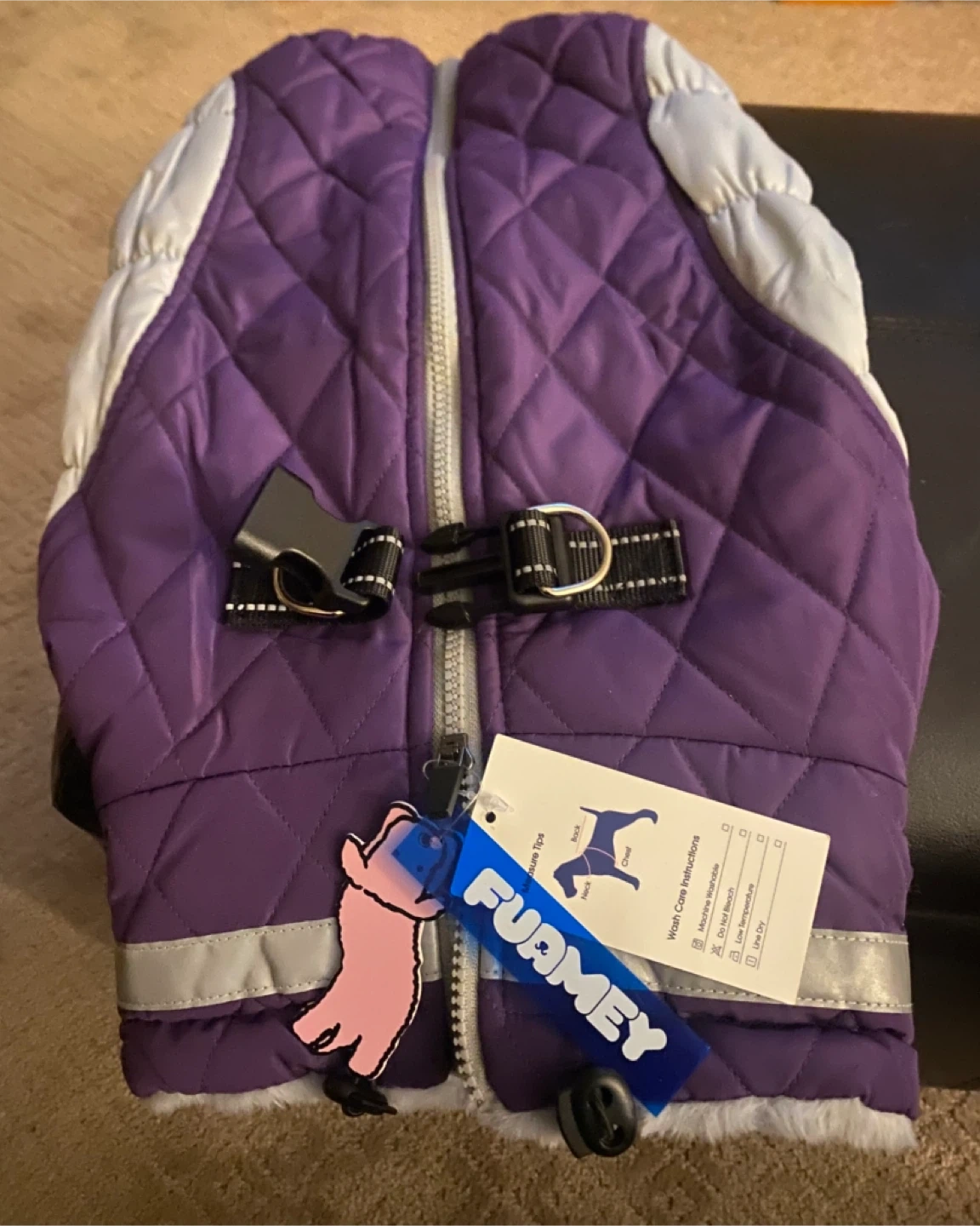 This new Furmey dog winter coat is purple and grey with reflective strips for nighttime visibility. It has a zipper opening, adjustable drawstring, and an elastic band design for a snug fit. The leash hole allows for easy harness attachment. Size large. Check pictures for sizing