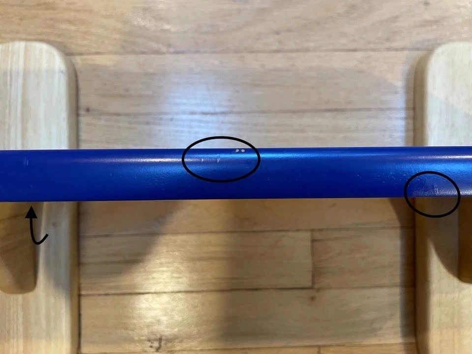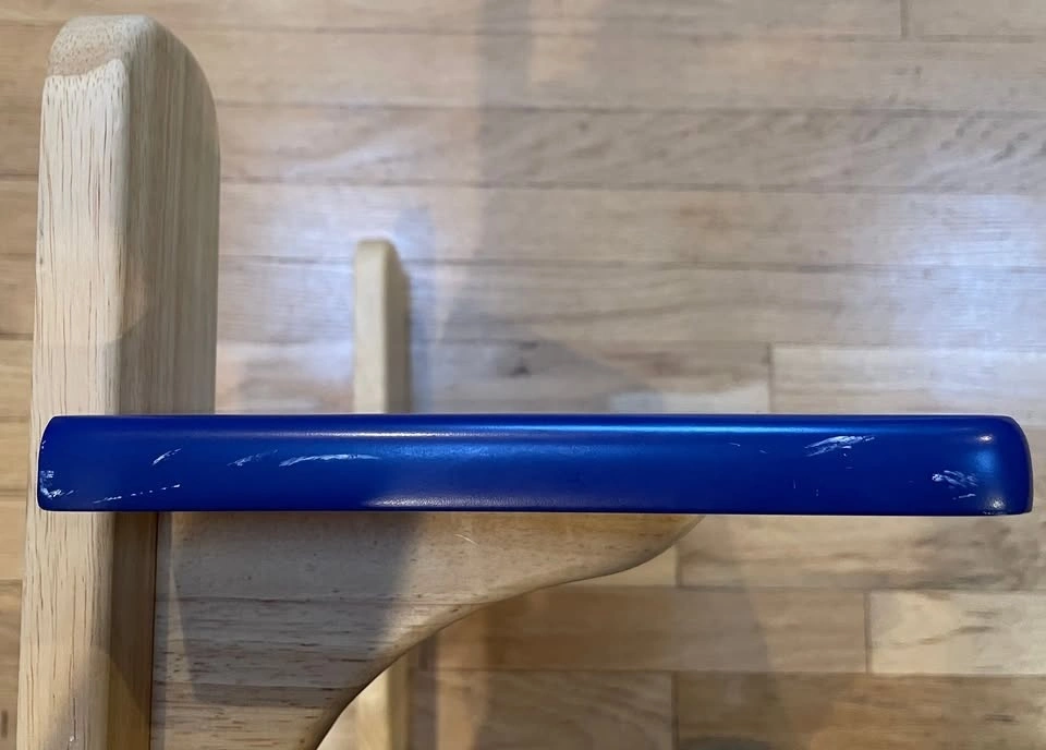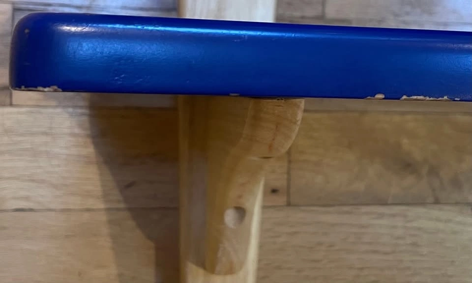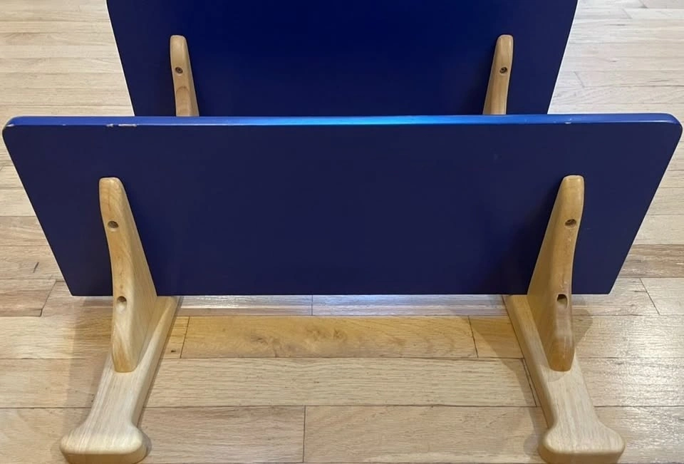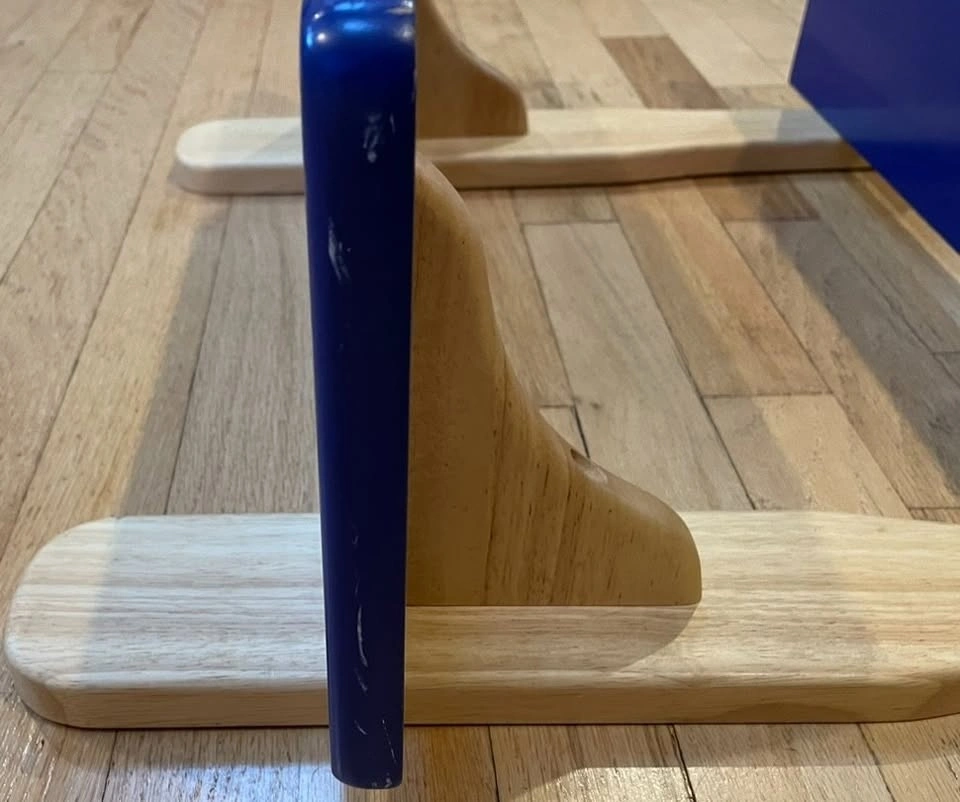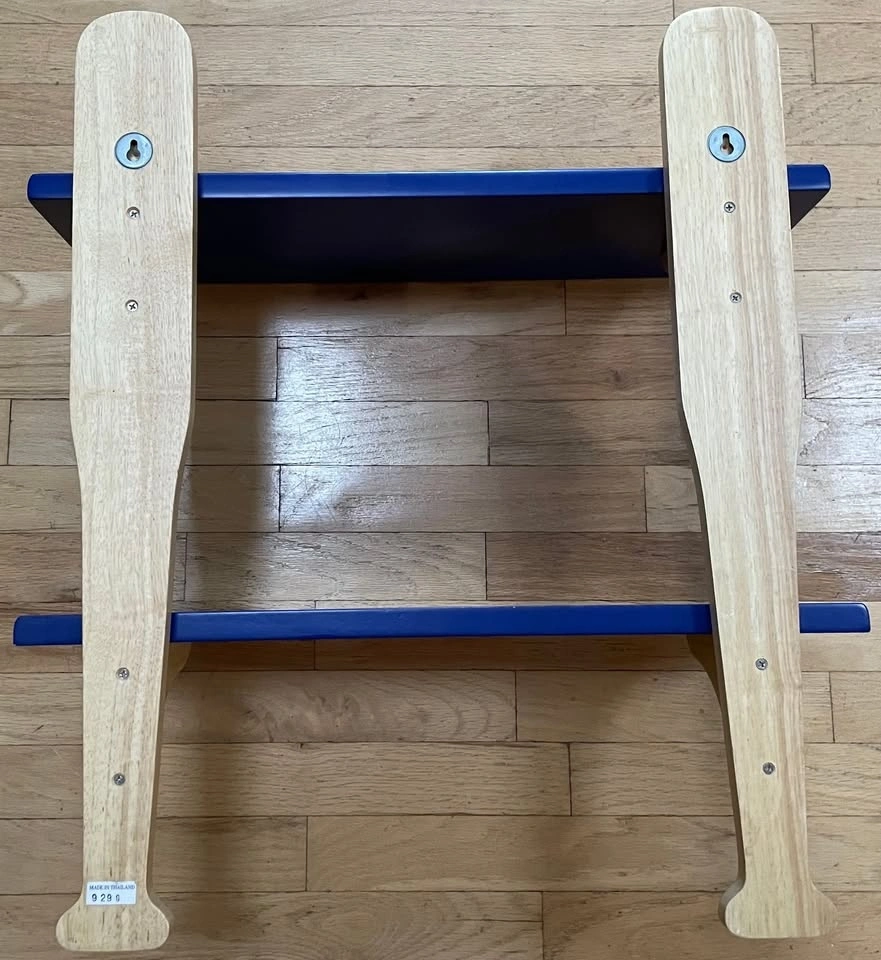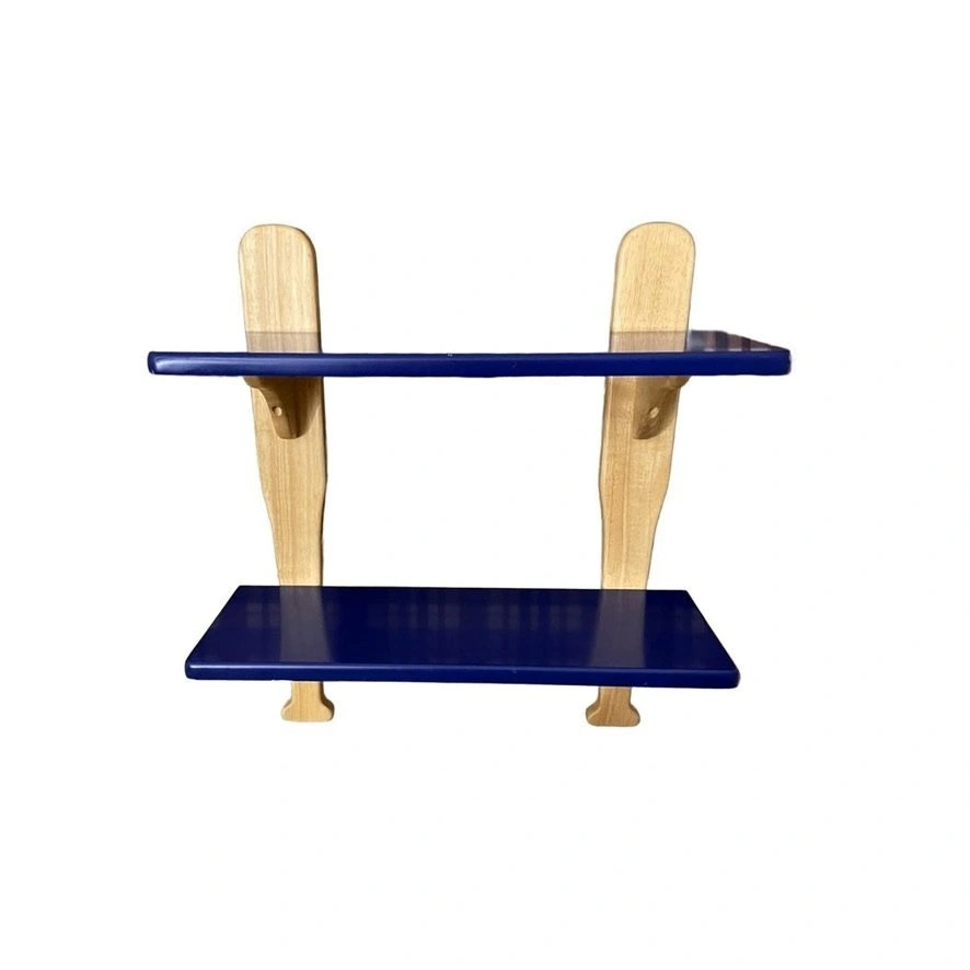 This wood shelf features two baseball bat style wooden supports posts with a horizontal shelf attached to each. The shelves are painted a deep navy/royal blue while the bat shaped supports are a natural light wood color. Shelf is designed to be mounted on a wall.