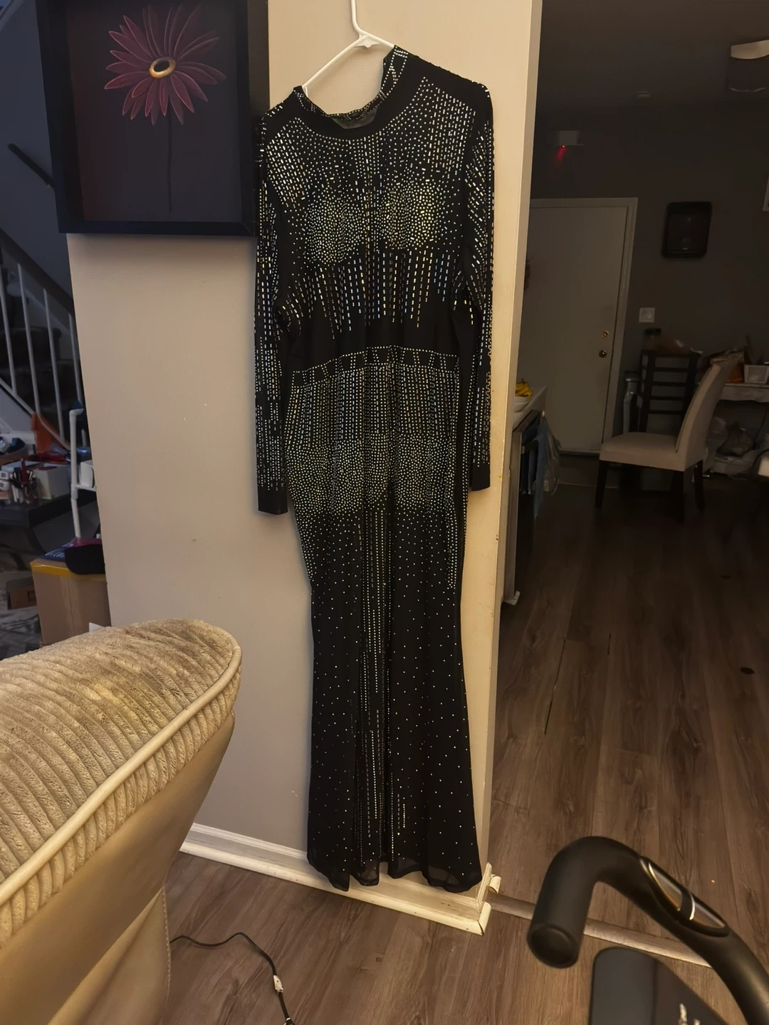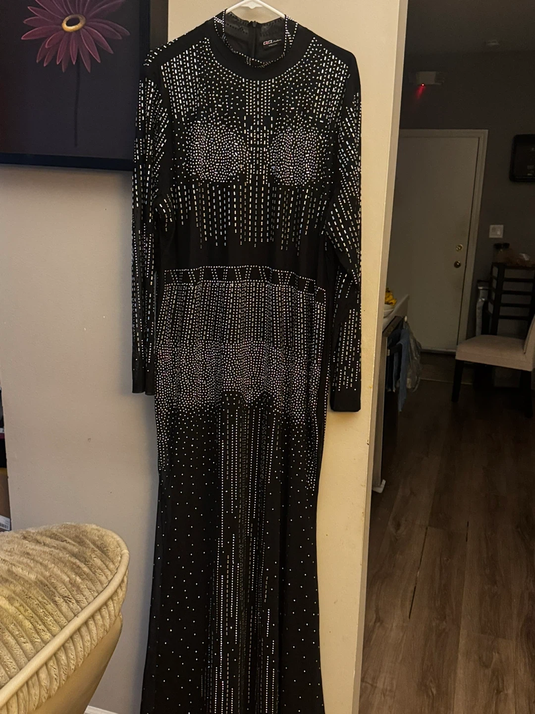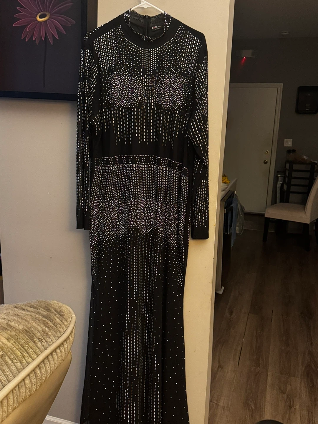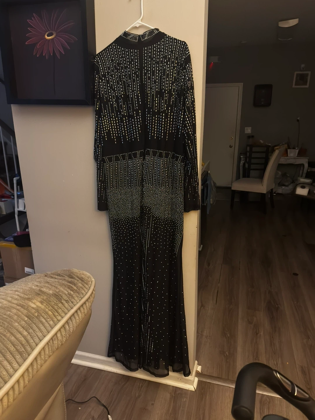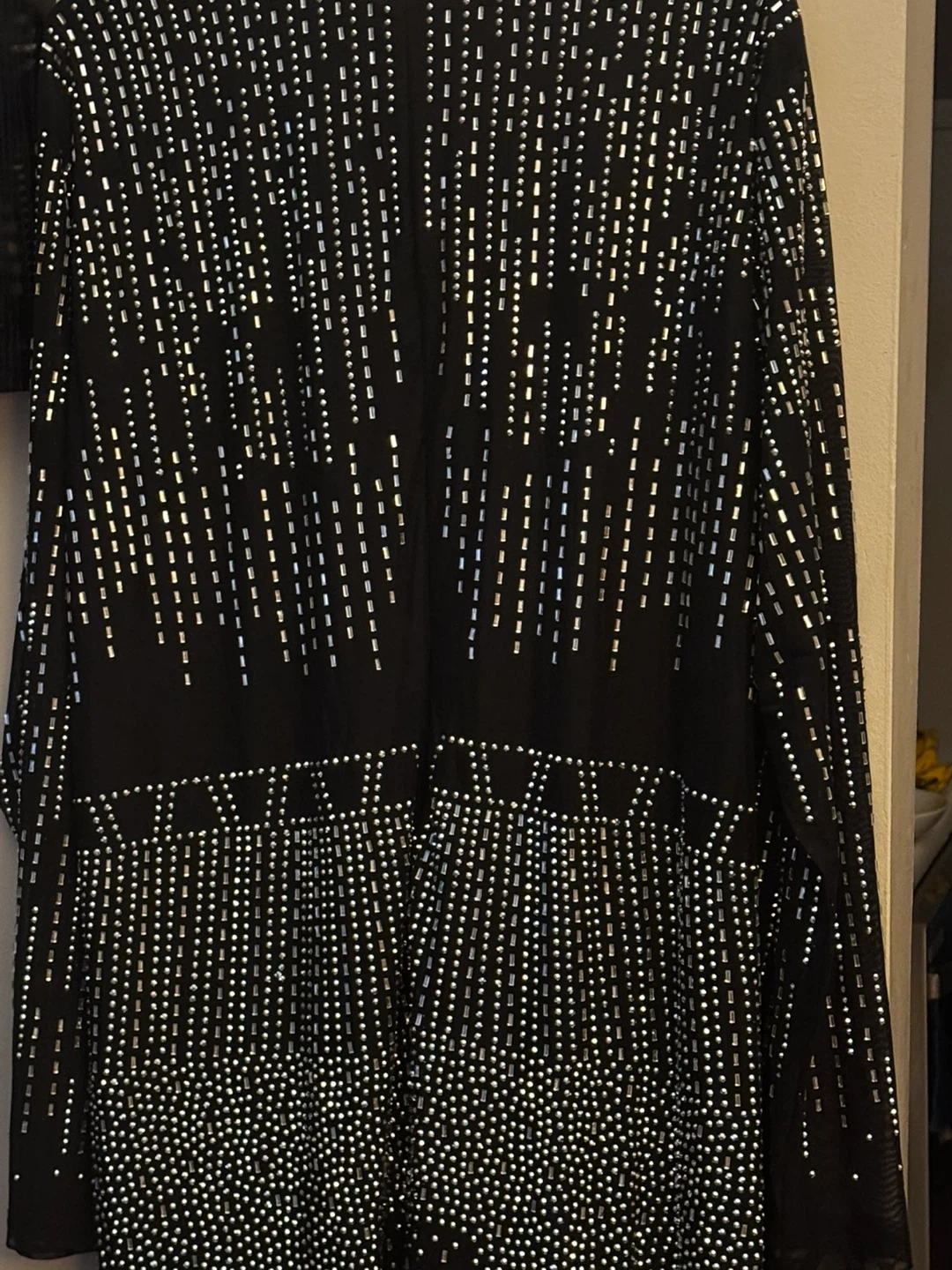Selling a black dress with rhinestone embellishments. It's a long-sleeved dress with a high neckline and a fitted silhouette. Great for a night out or special occasion!
