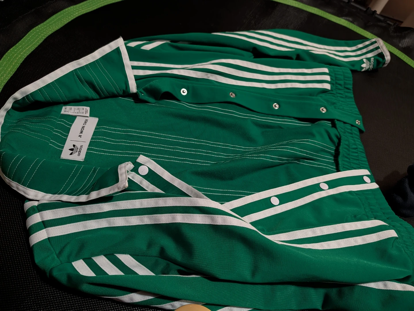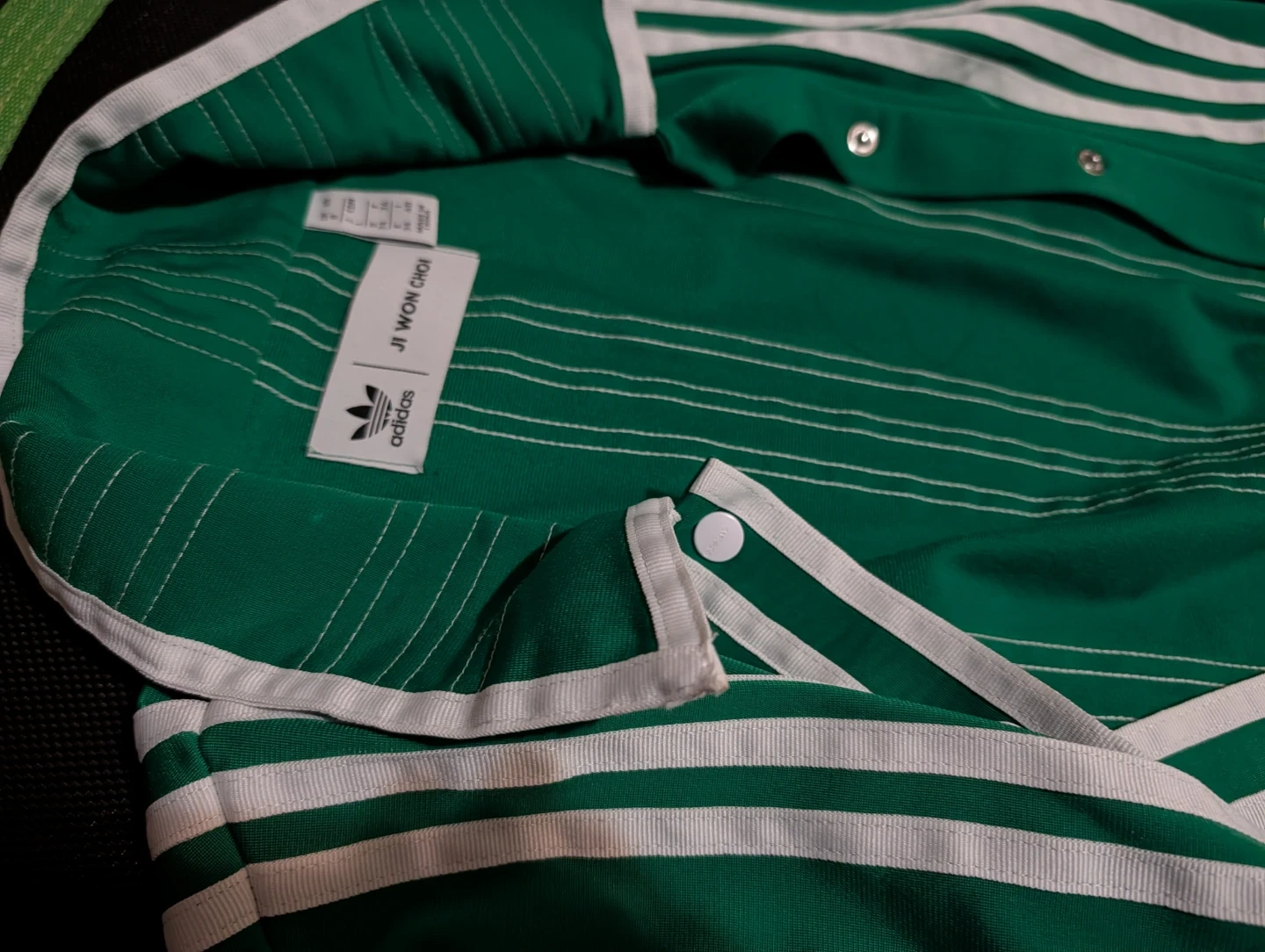 This is an Adidas track jacket in green with white stripes. It features snap buttons for closure. The jacket is made of a polyester blend.Size UK 8 . Looks like S/M