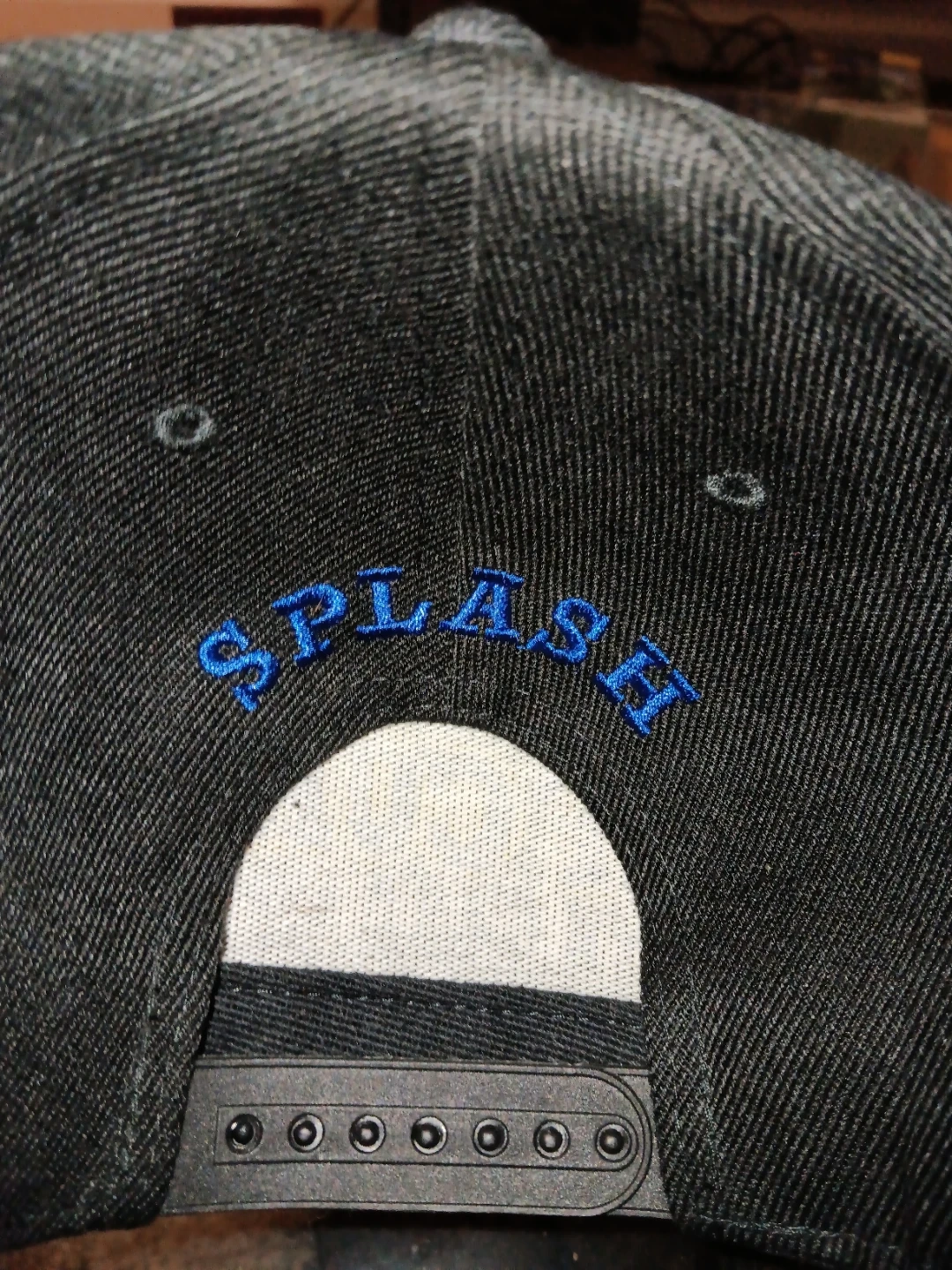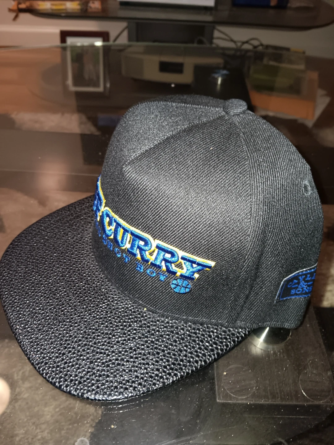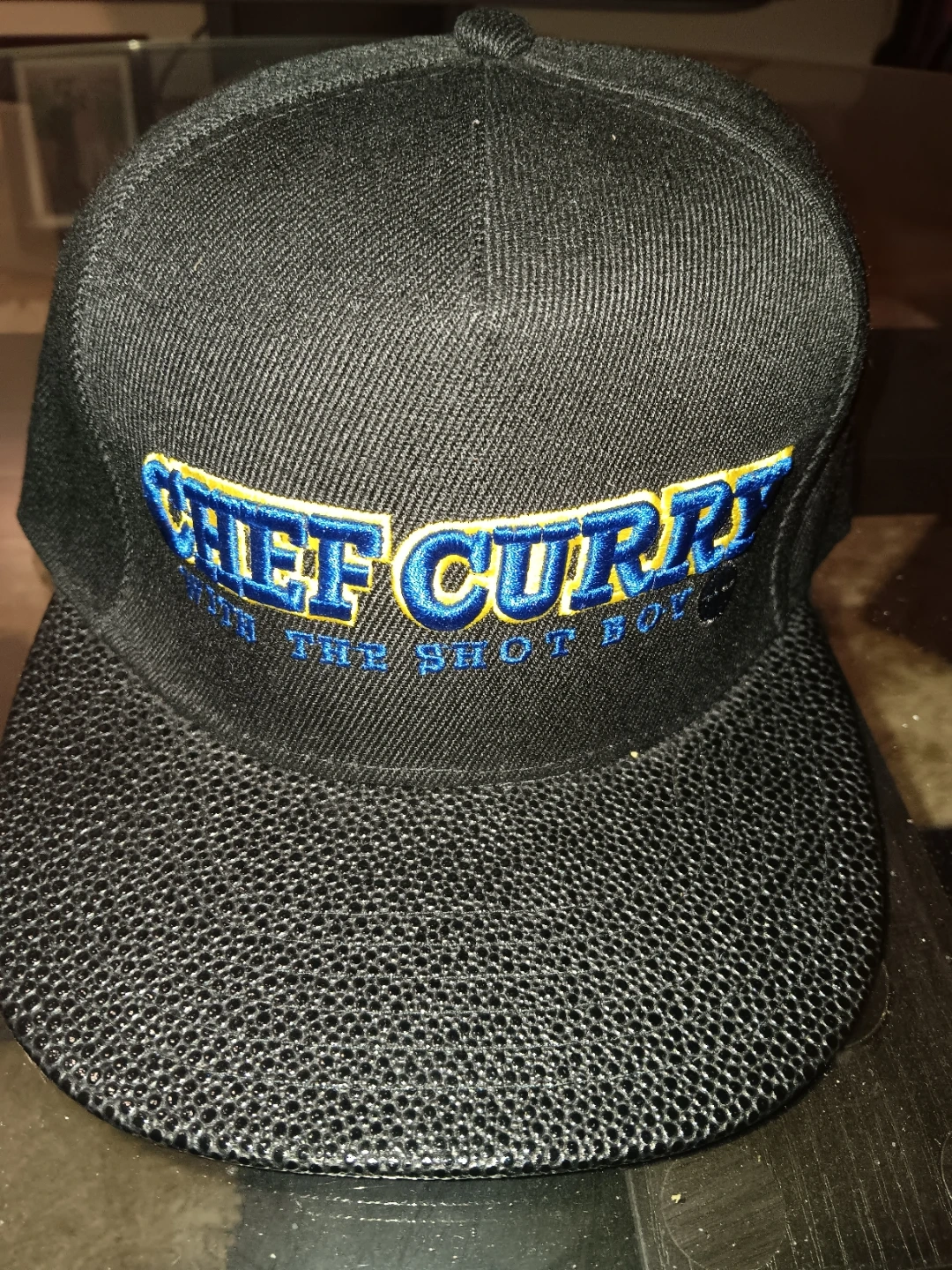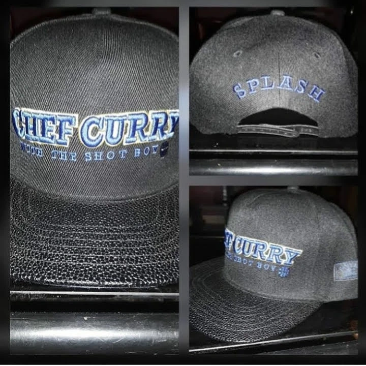 This is a black snapback hat with "CHIEF CURRY" and "WITH THE SHOT BOY" embroidered in blue and yellow. The word "SPLASH" is embroidered in blue on the back. It has a textured brim.