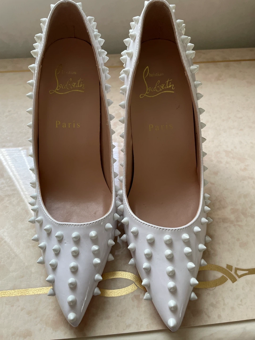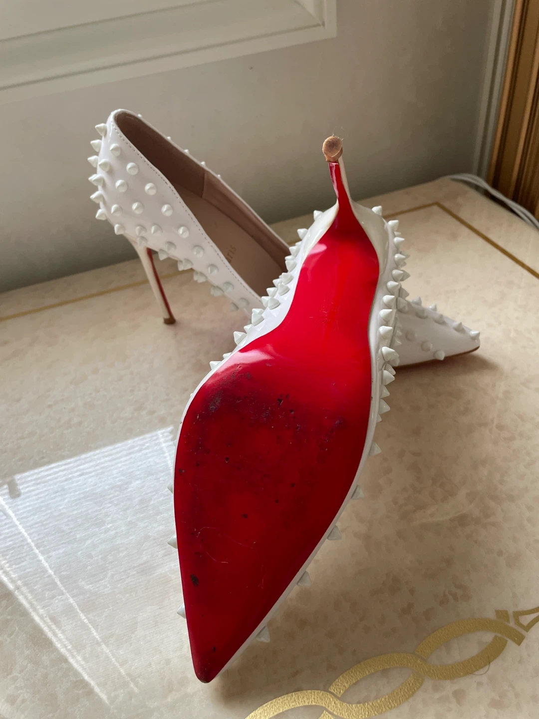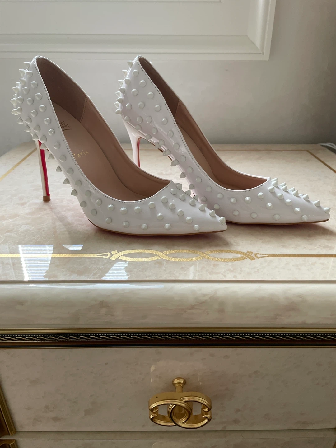 These iconic Christian Louboutin heels feature a white patent leather finish adorned with silver spikes. The signature red sole adds a bold contrast. These statement shoes are perfect for making an entrance!