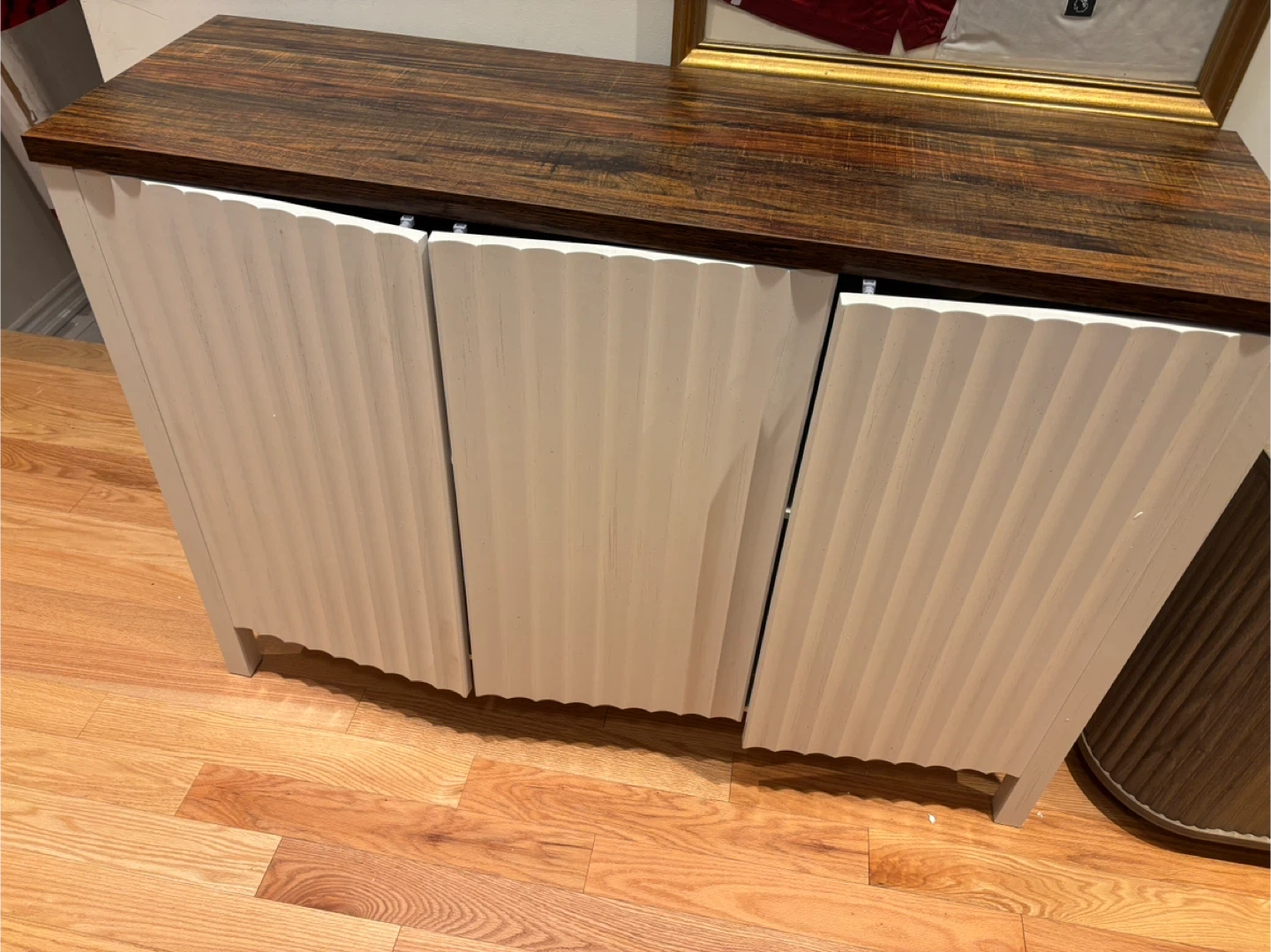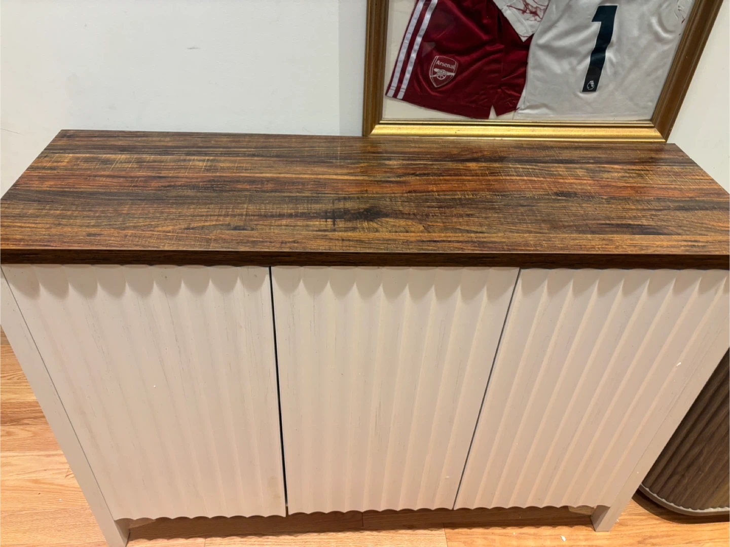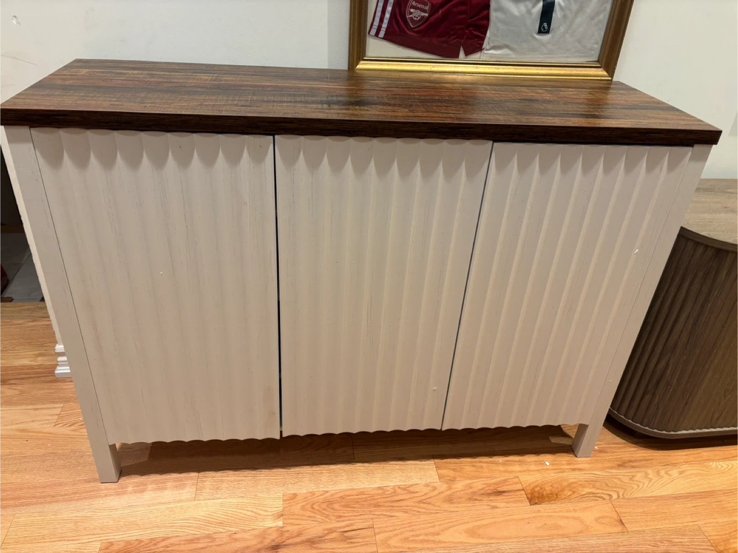 This shoe storage cabinet offers a stylish solution for your home organization needs. It features three doors and adjustable shelves, providing ample space for various items. The cabinet's dimensions are 47.2 inches wide, 15 inches deep, and 33.5 inches high. Its design includes a rustic wood-grain top and white fluted cabinet fronts, making it a versatile addition to entryways or living areas.available for pickup and delivery