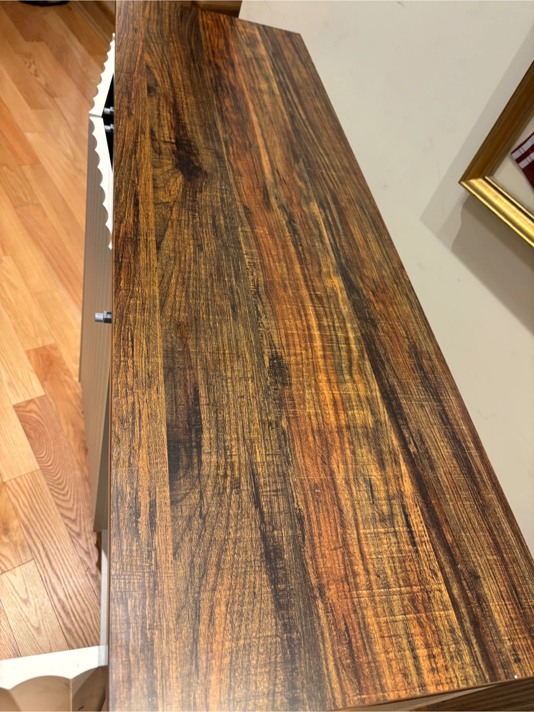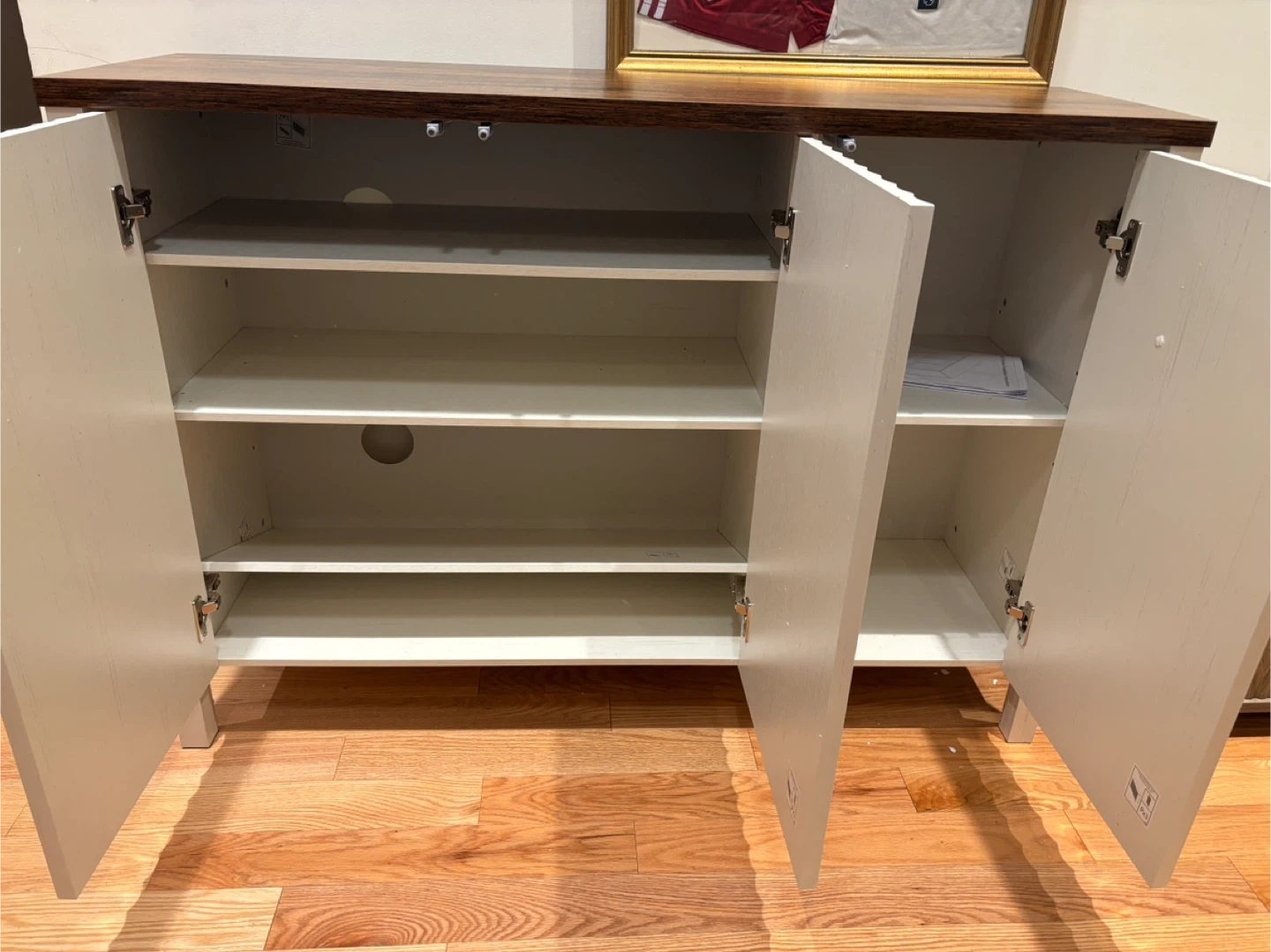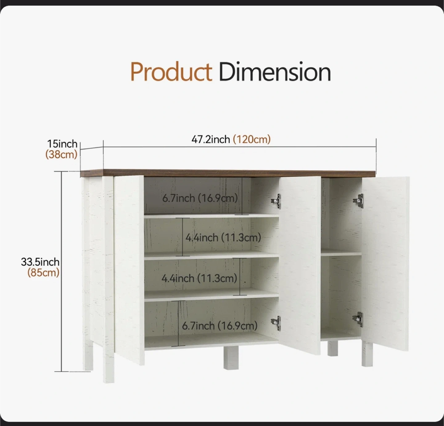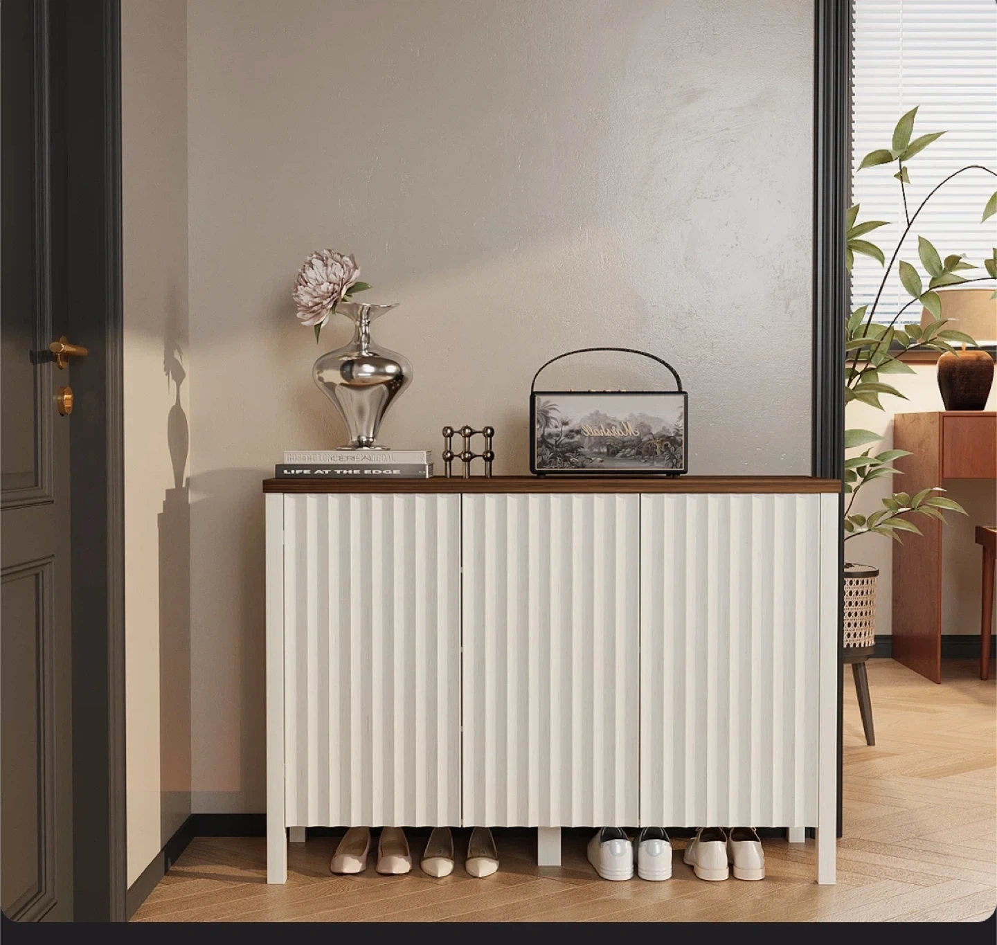 This shoe storage cabinet offers a stylish solution for your home organization needs. It features three doors and adjustable shelves, providing ample space for various items. The cabinet's dimensions are 47.2 inches wide, 15 inches deep, and 33.5 inches high. Its design includes a rustic wood-grain top and white fluted cabinet fronts, making it a versatile addition to entryways or living areas.available for pickup and delivery