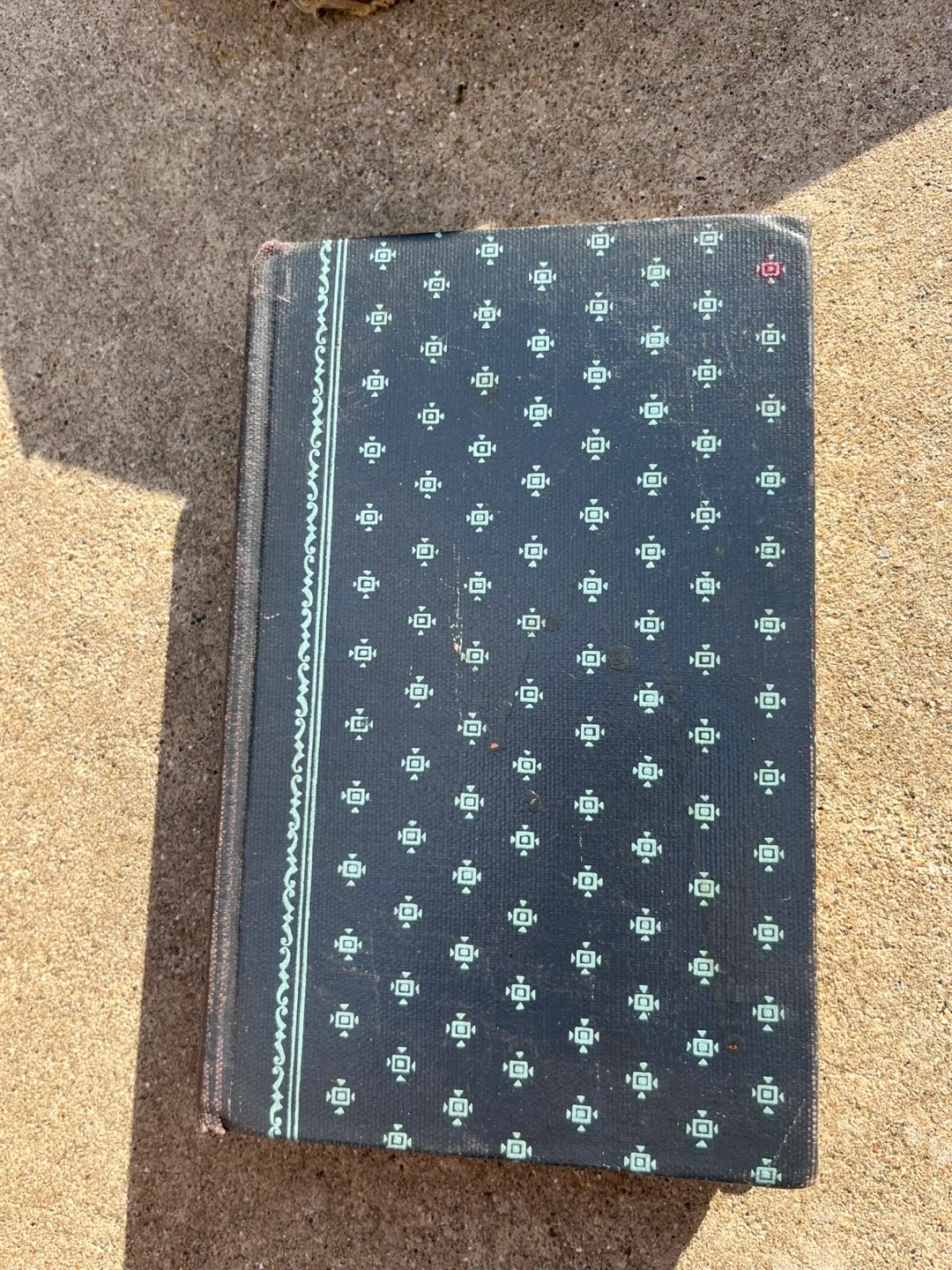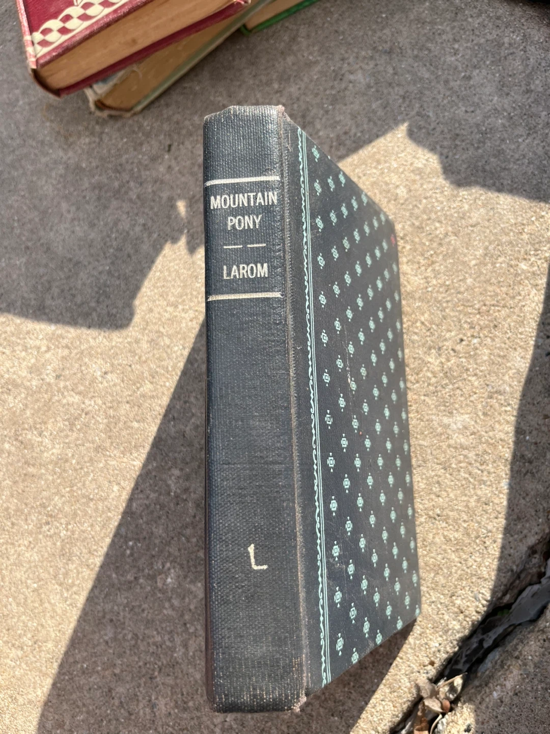 This is a hardcover edition of "Mountain Pony" by Larom. The cover features a decorative navy blue pattern with a light blue border. It's a classic book for collectors.