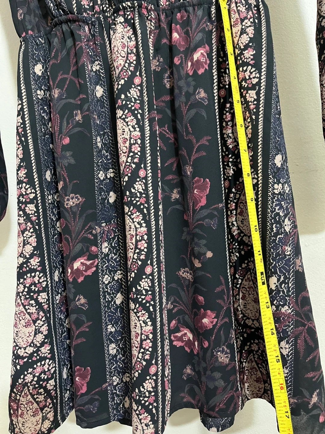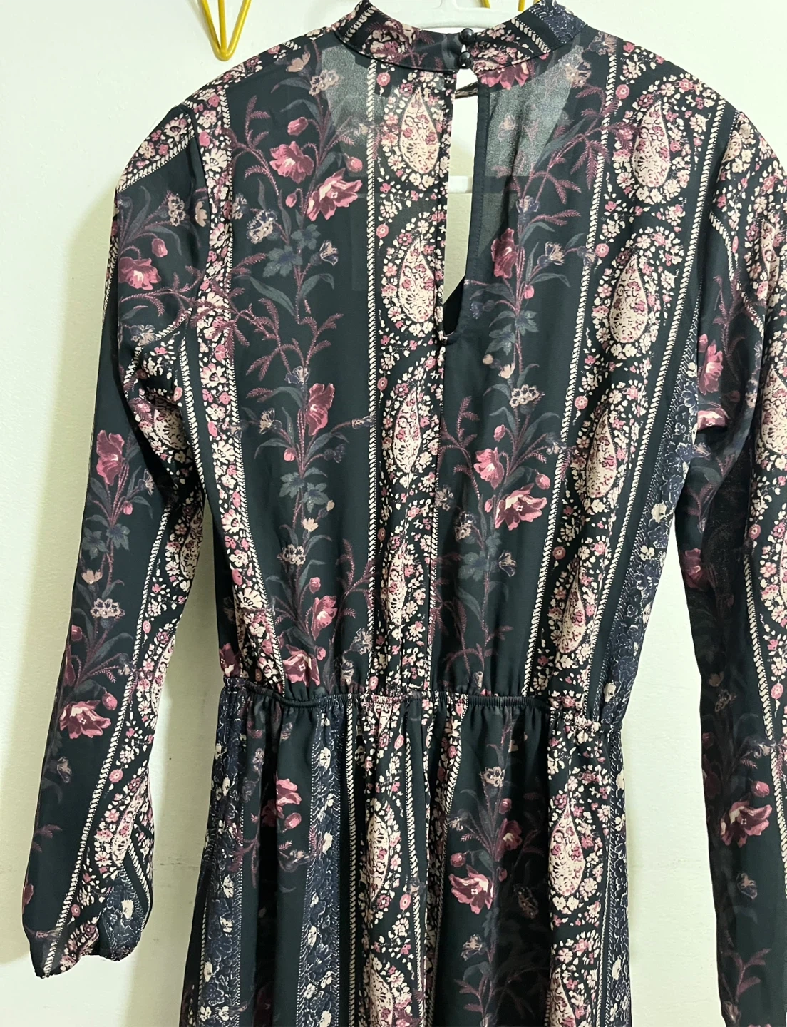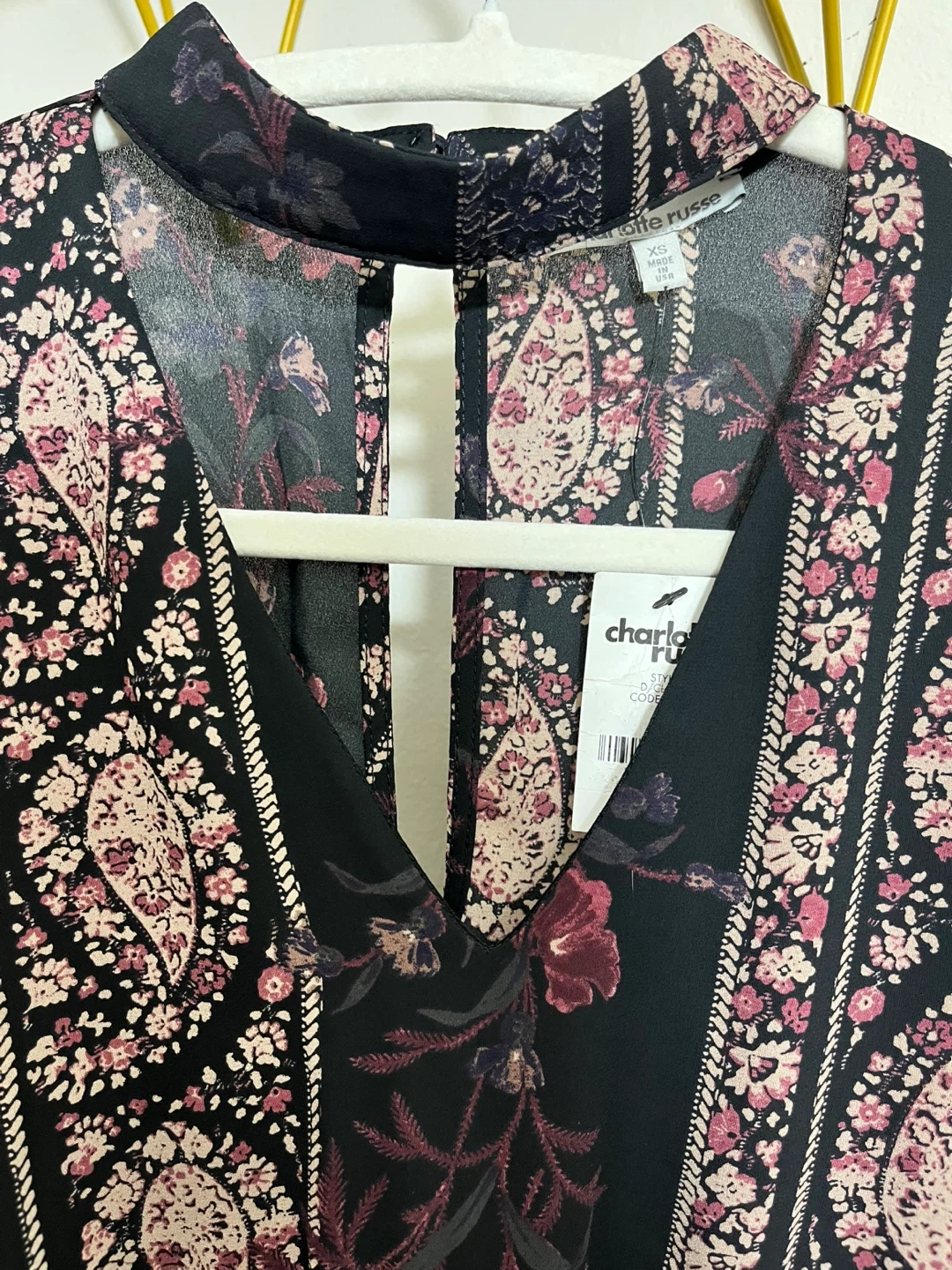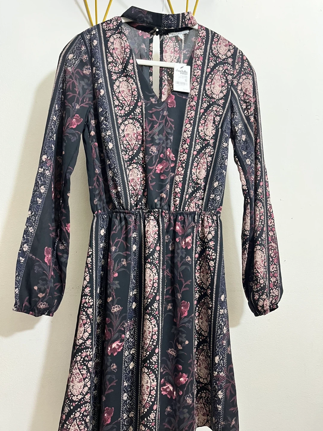 This is a Charlotte Russe floral print mini dress. It's a size XS. The dress features a V-neck and long sleeves with elastic cuffs. It has an elastic waist for a comfortable fit. This dress would be great for a casual outing!