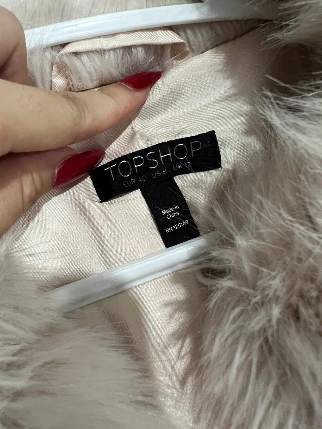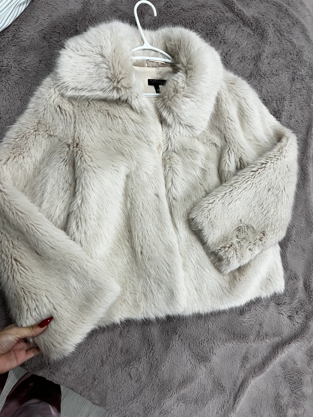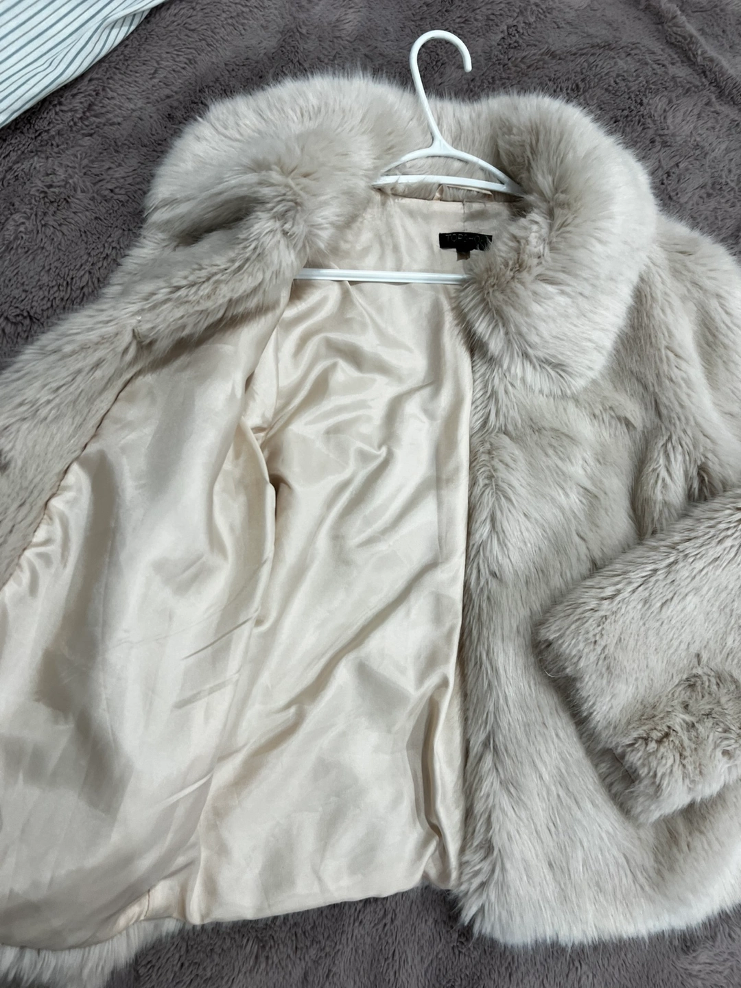 Cream coloured faux fur jacket, size 8. The jacket has a large collar. The lining is a smooth satin. The jacket has a zipper closure at the front.