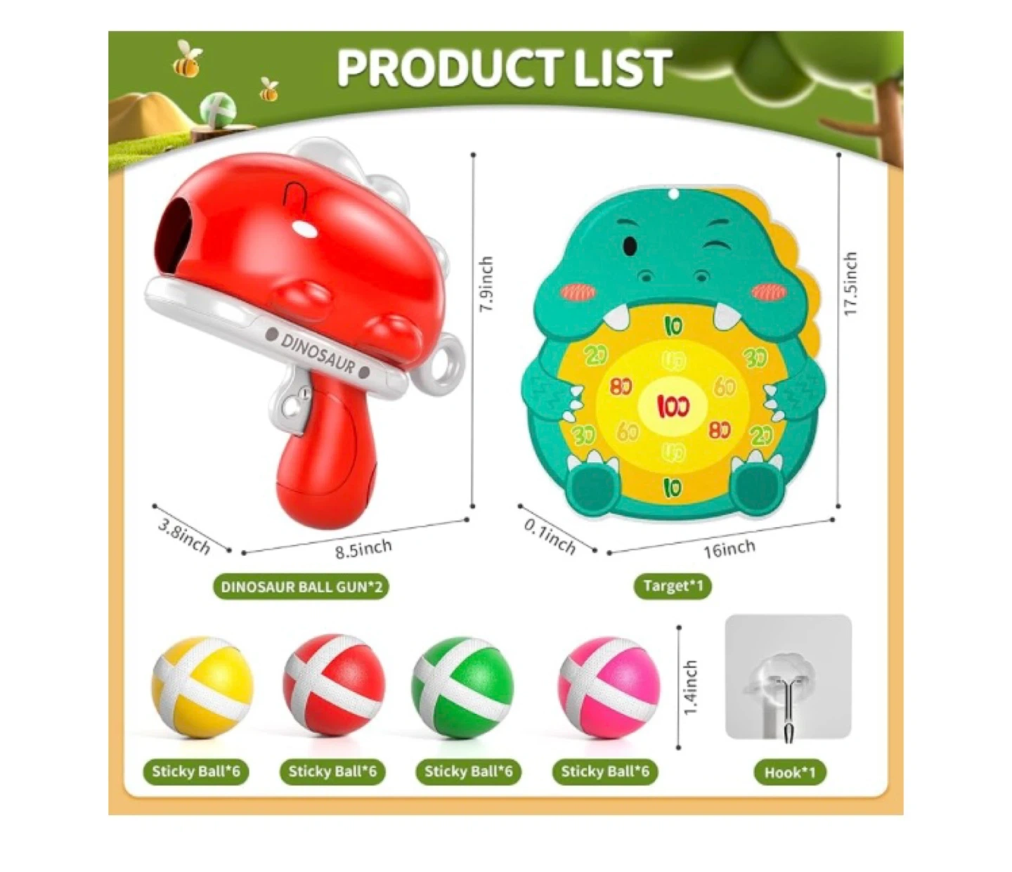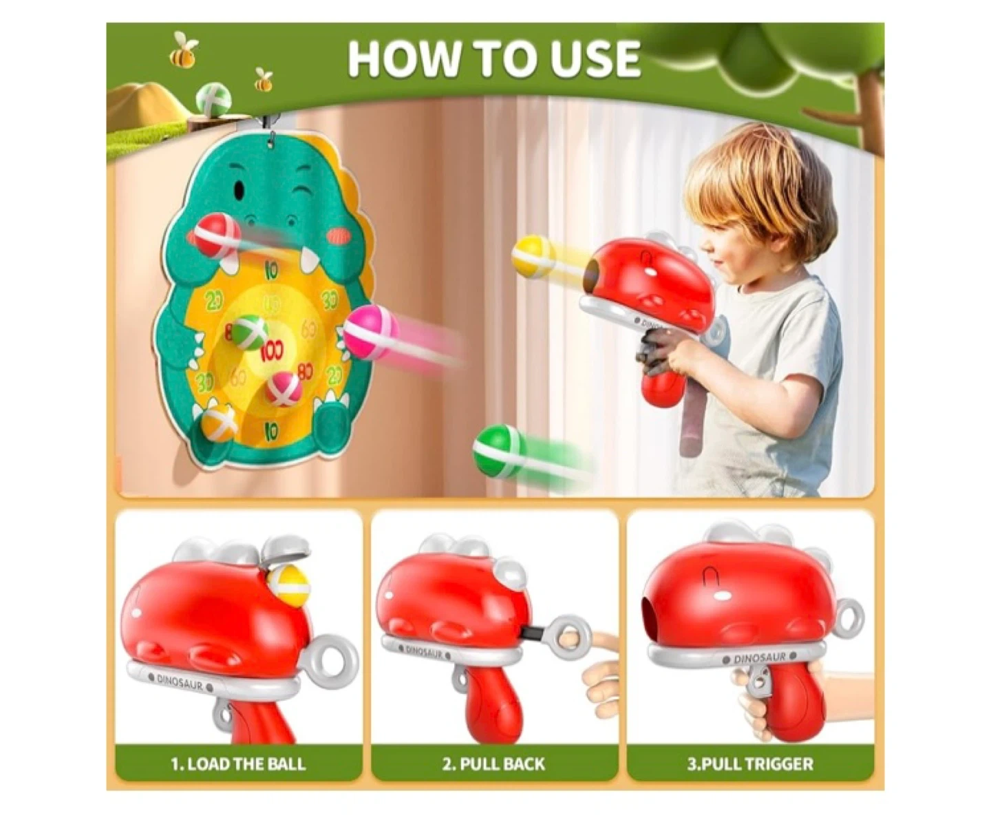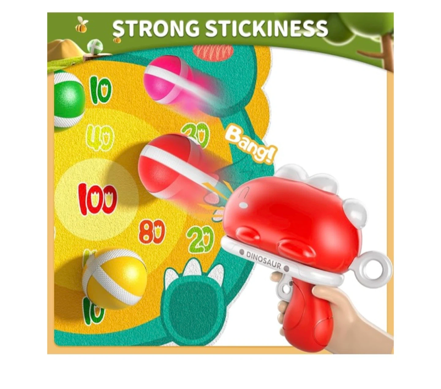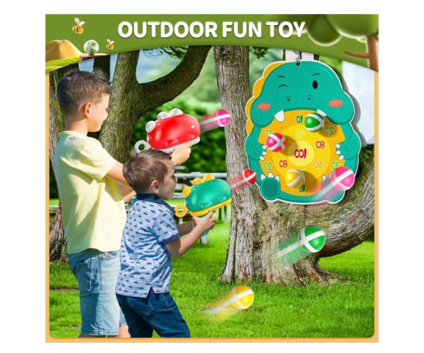 This set includes two dinosaur-themed ball guns and a dart board. It's recommended for ages 3+ and helps with hand-eye coordination. Includes 2 guns, 1 dart board, and 24 balls. Let the children have fun!