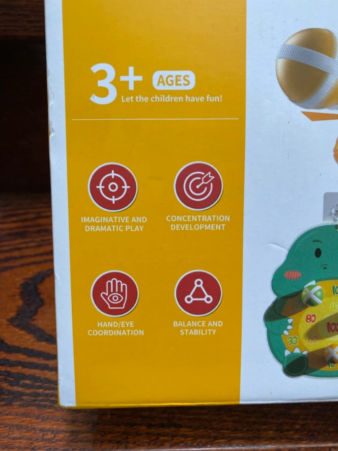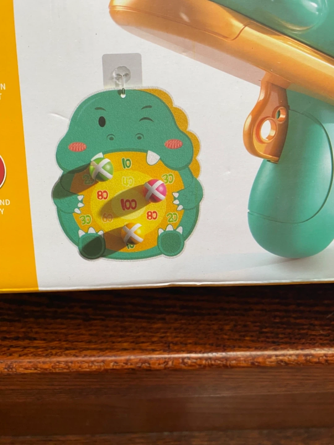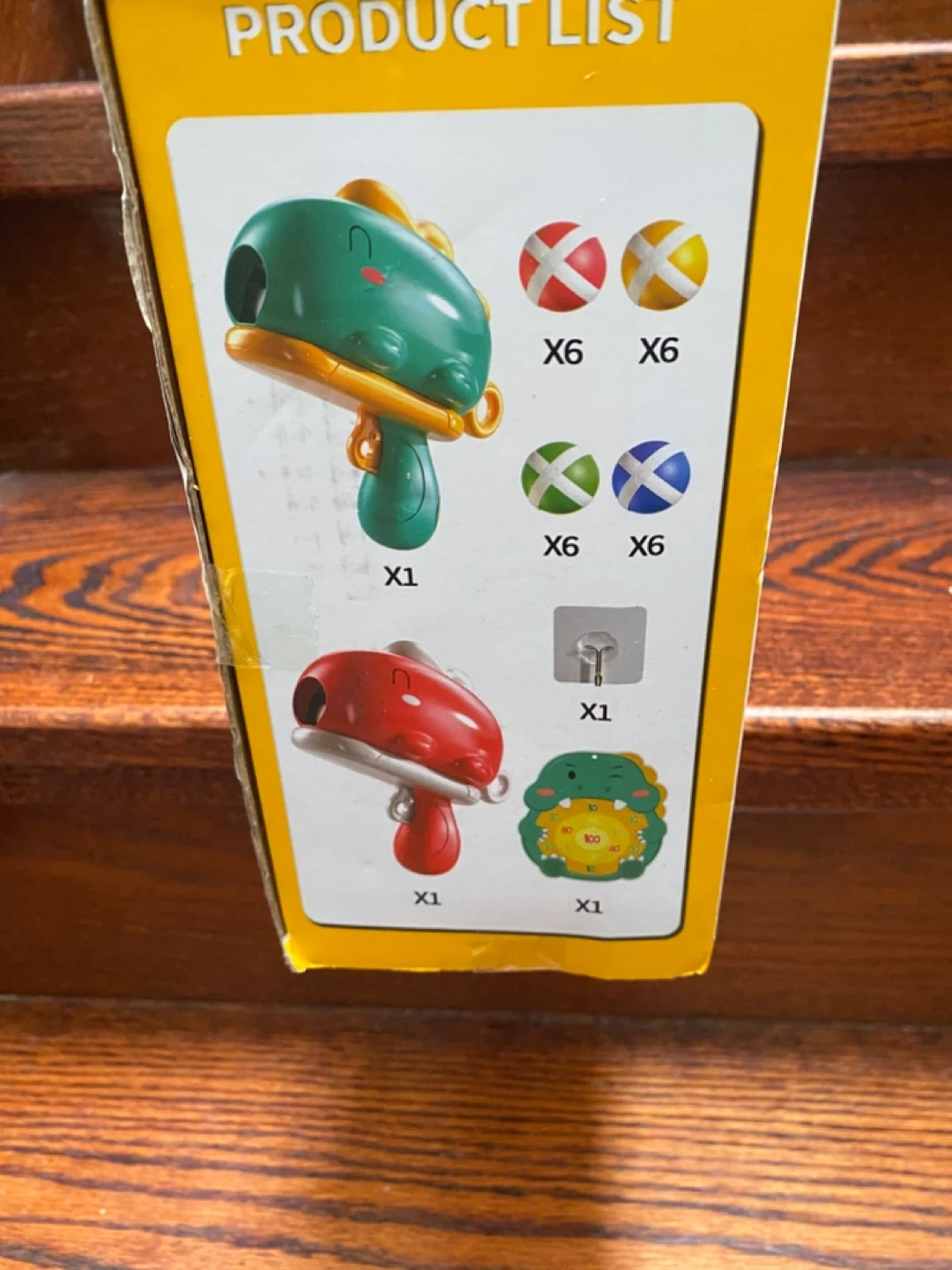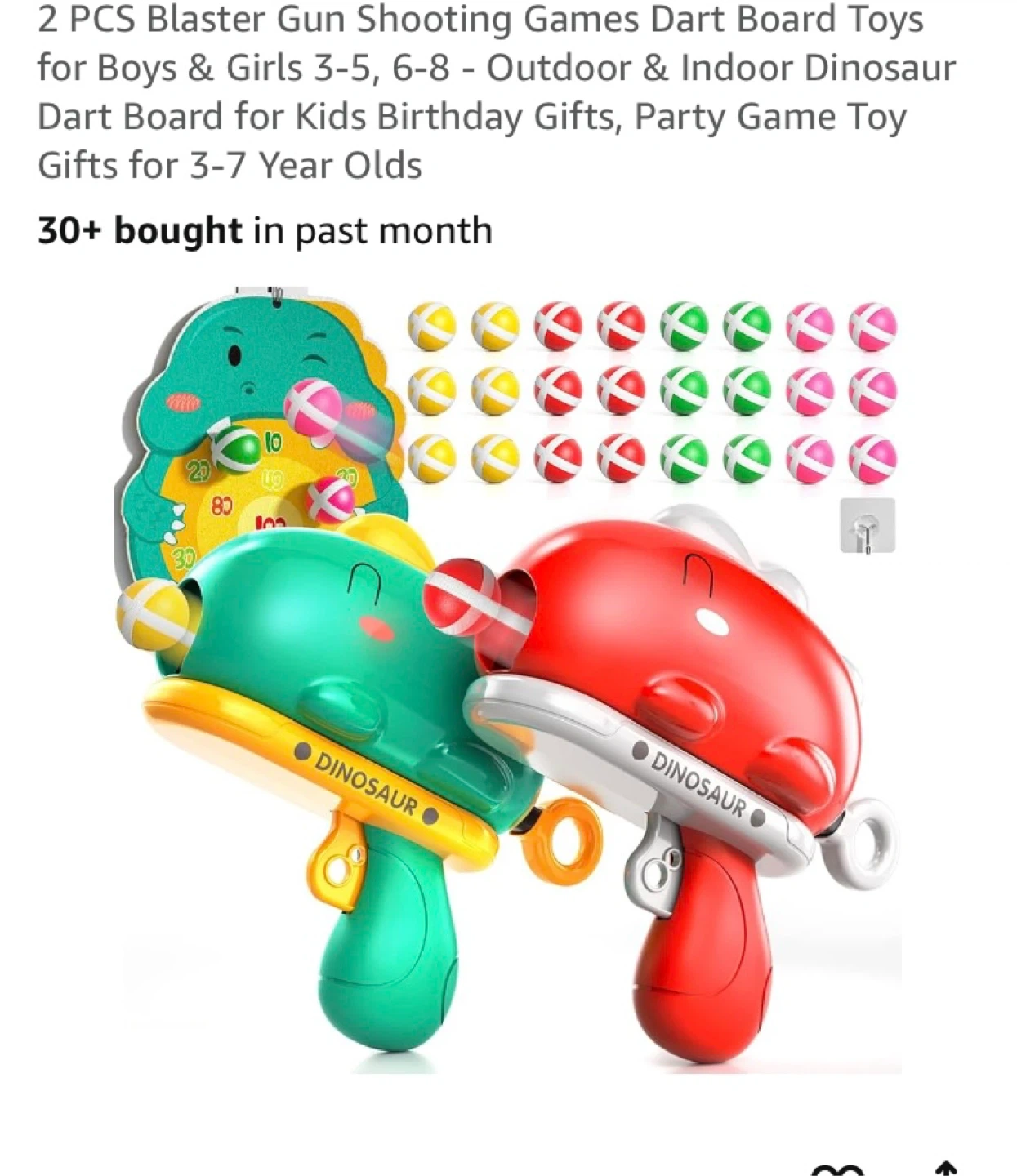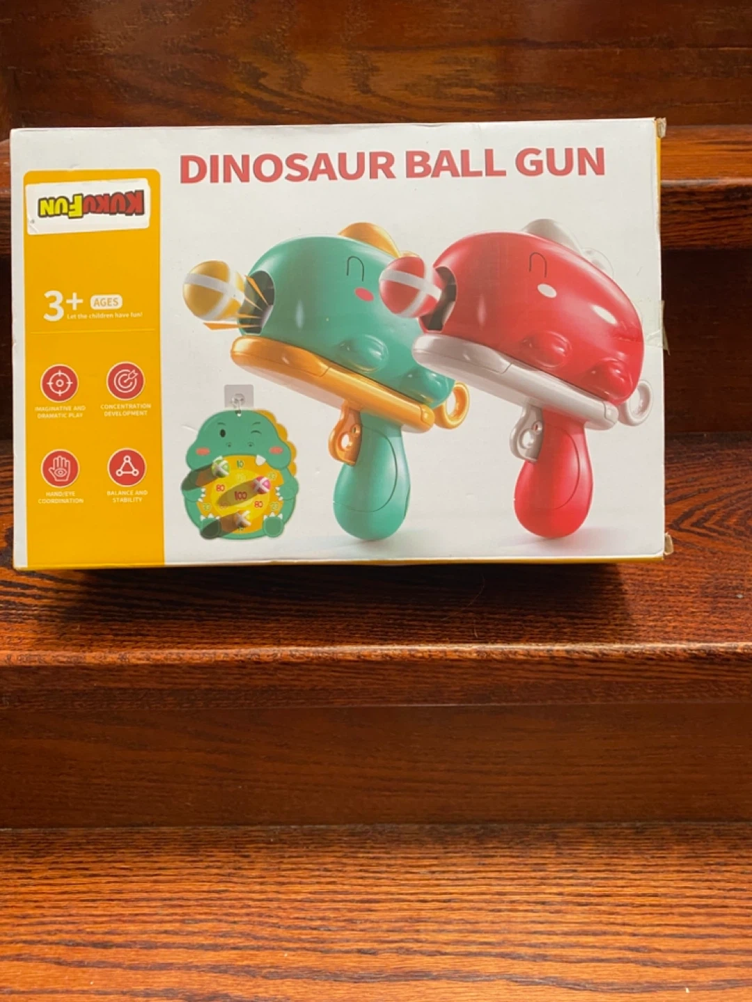 This set includes two dinosaur-themed ball guns and a dart board. It's recommended for ages 3+ and helps with hand-eye coordination. Includes 2 guns, 1 dart board, and 24 balls. Let the children have fun!