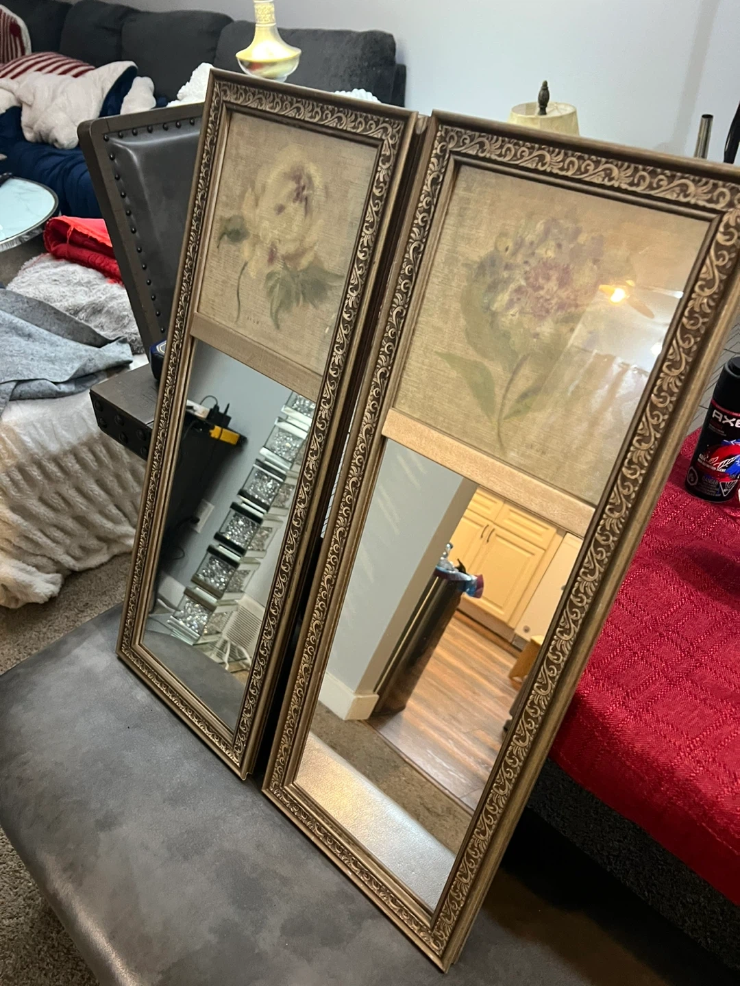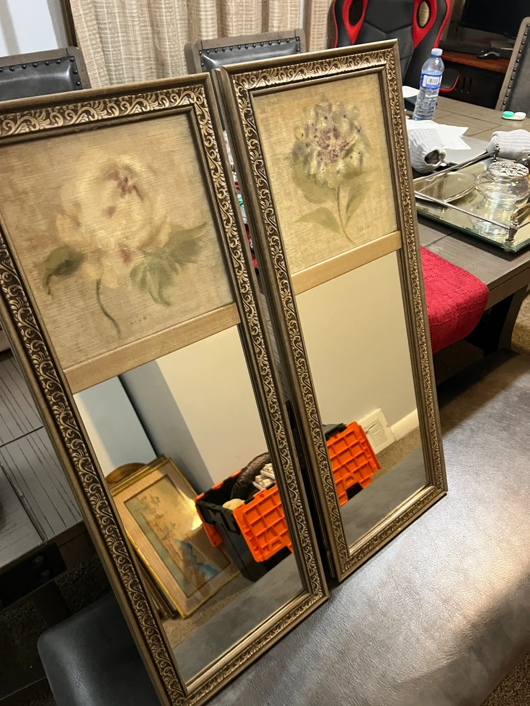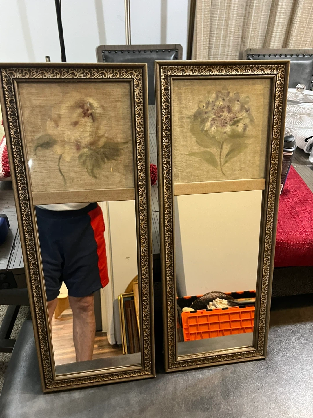 Set of two decorative mirrors featuring framed floral prints. Each mirror has a vintage gold-tone ornate frame. These would add a charming touch to any room!