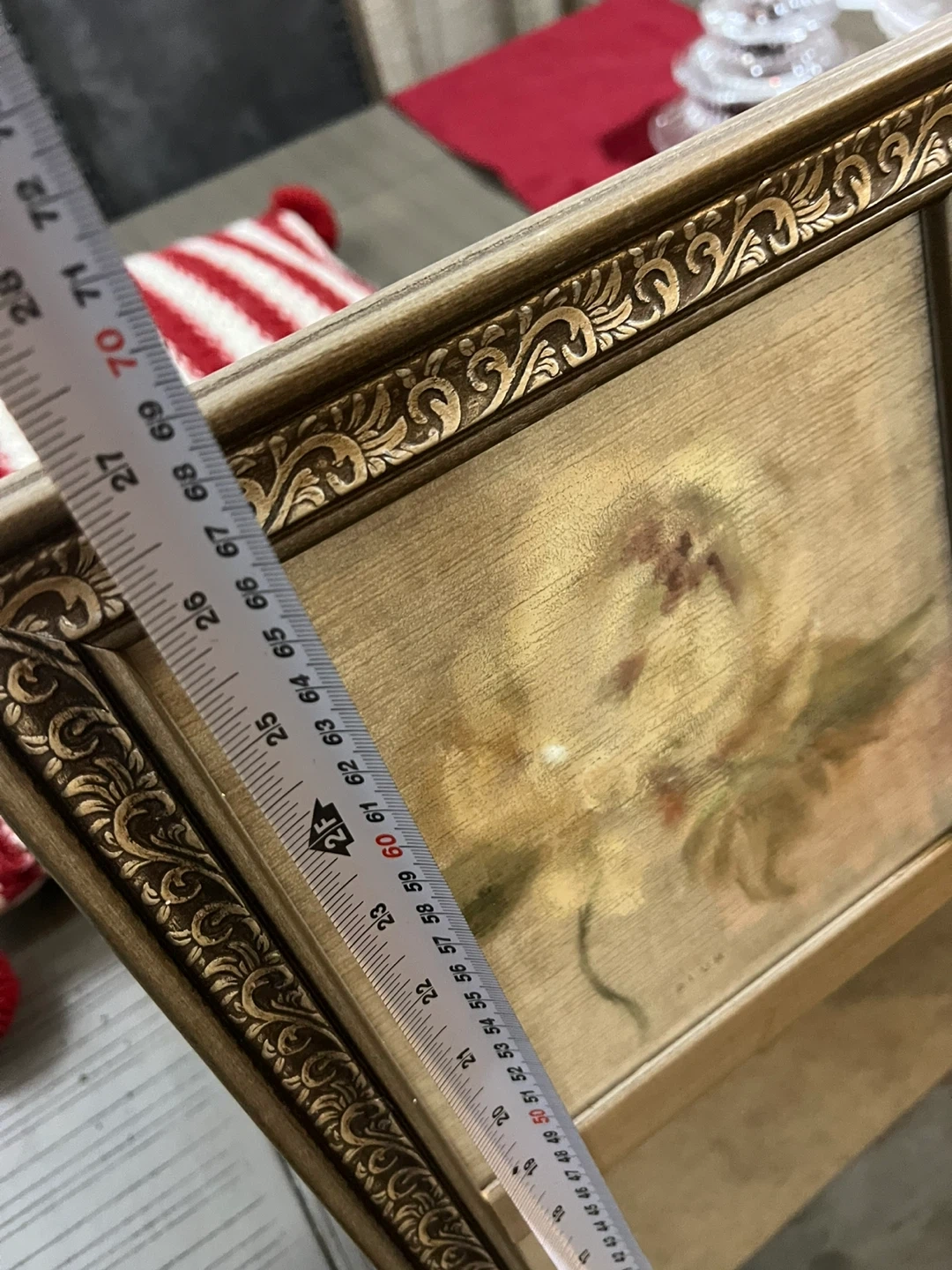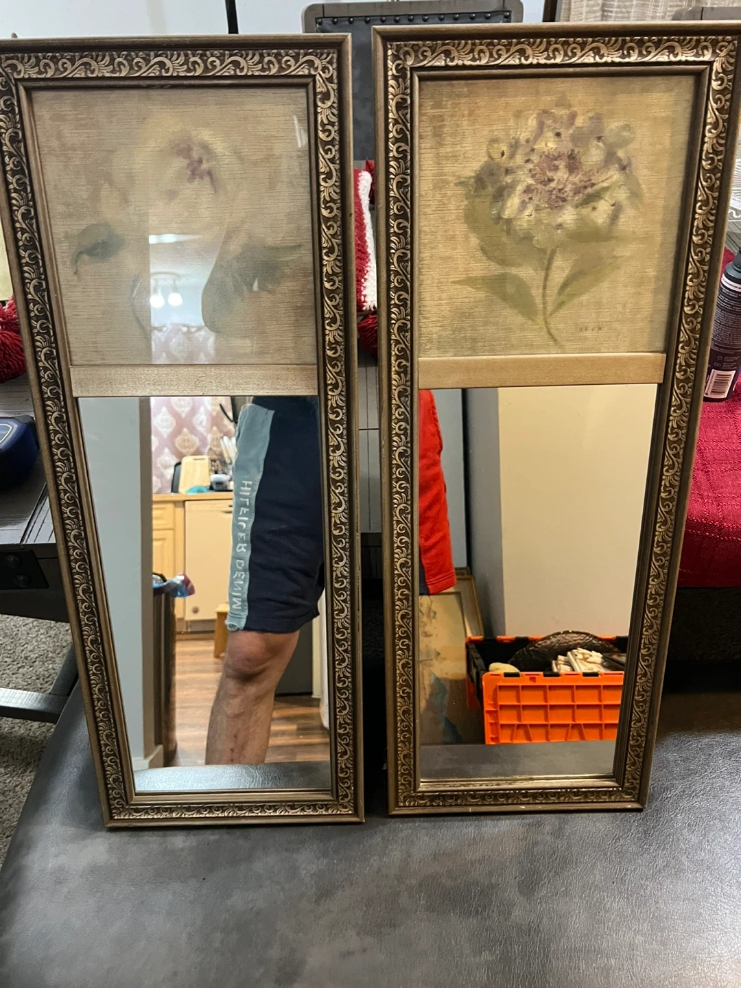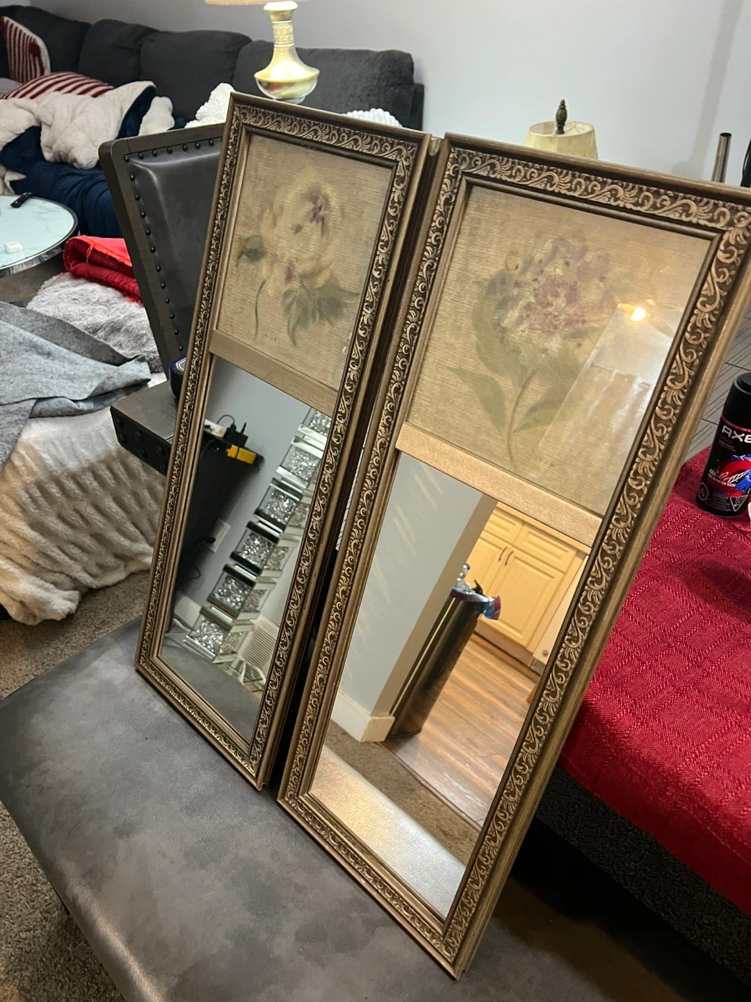 Set of two decorative mirrors featuring framed floral prints. Each mirror has a vintage gold-tone ornate frame. These would add a charming touch to any room!