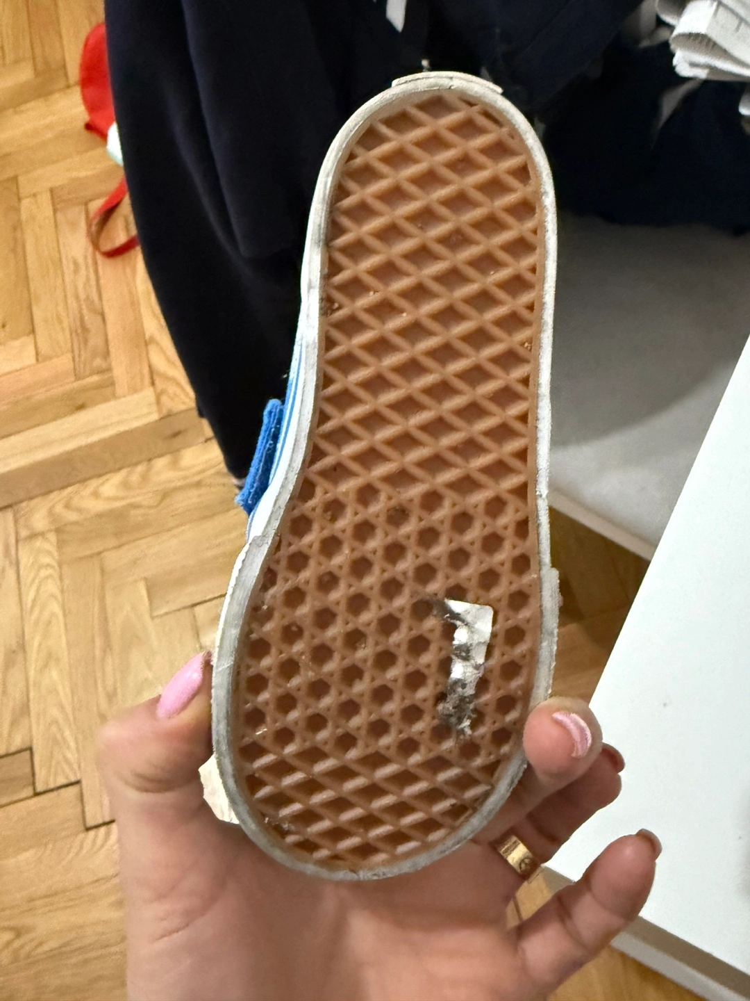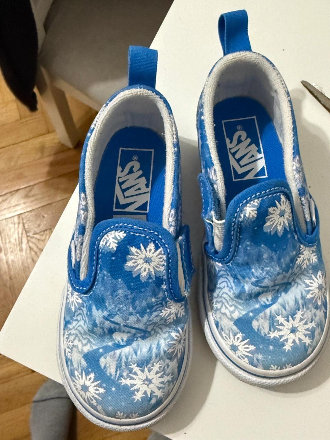 Adorable toddler Vans slip-on shoes. Blue canvas with snowflake pattern. Pre-owned, minor wear. Great for everyday use.