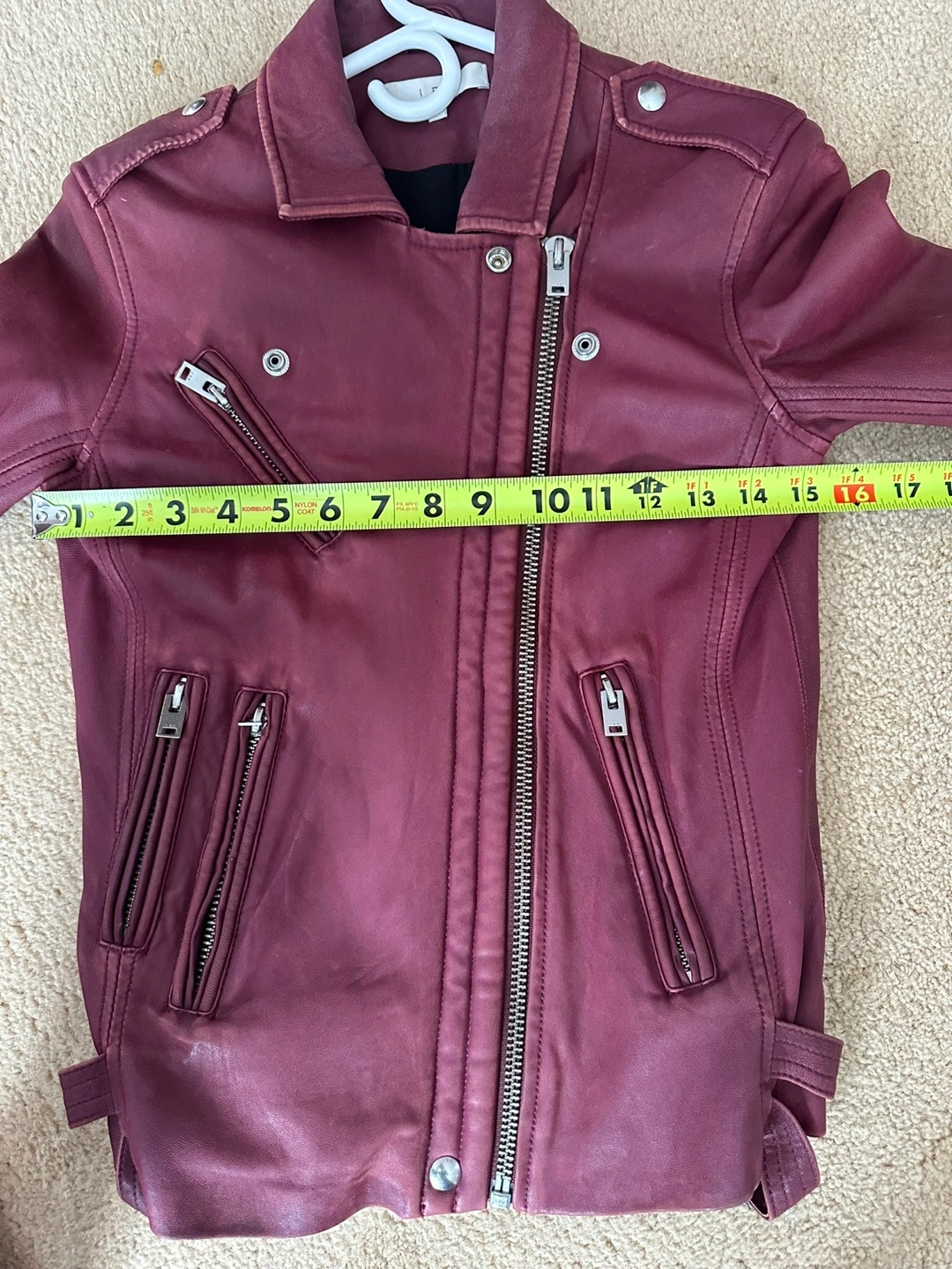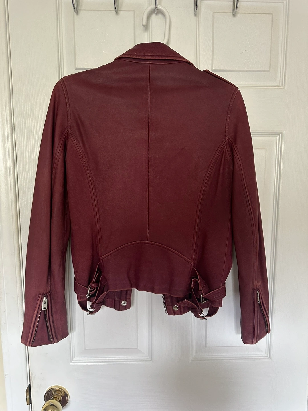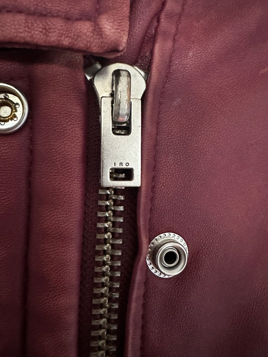 Elevate your casual look with this stunning IRO biker jacket in a beautiful burgundy hue. Crafted from high-quality leather, this short-length jacket features a solid pattern with accents of button, strap, buckle, and zipper.
