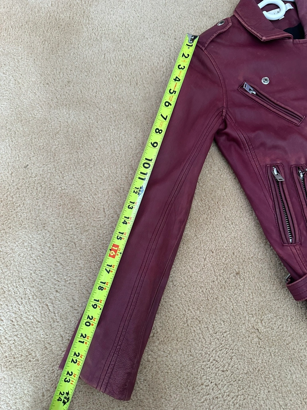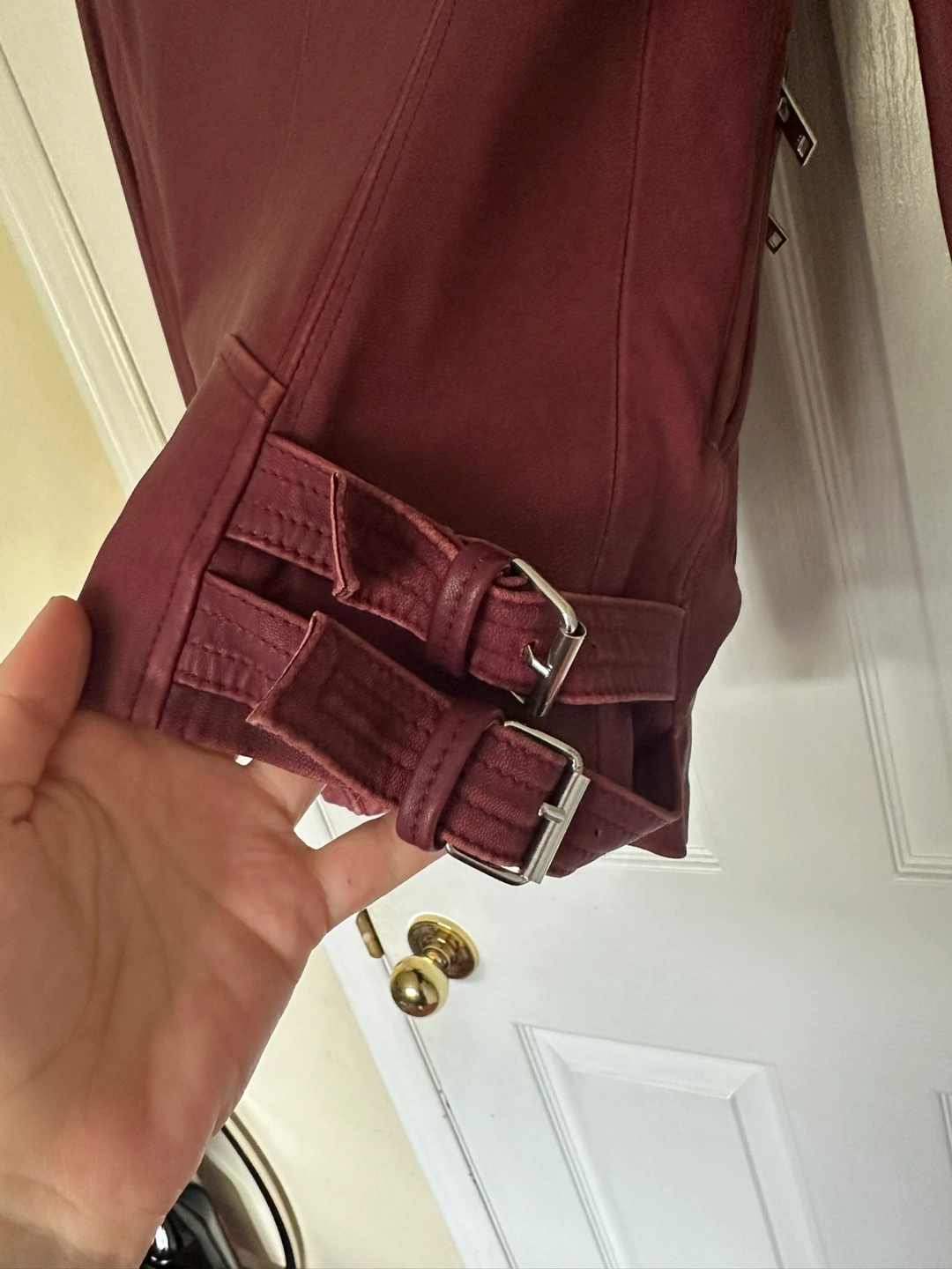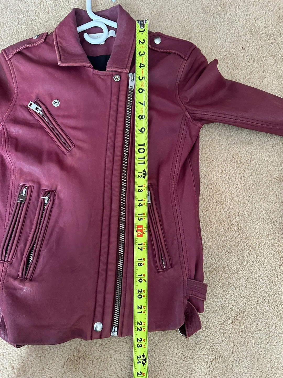 Elevate your casual look with this stunning IRO biker jacket in a beautiful burgundy hue. Crafted from high-quality leather, this short-length jacket features a solid pattern with accents of button, strap, buckle, and zipper.