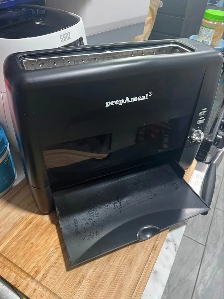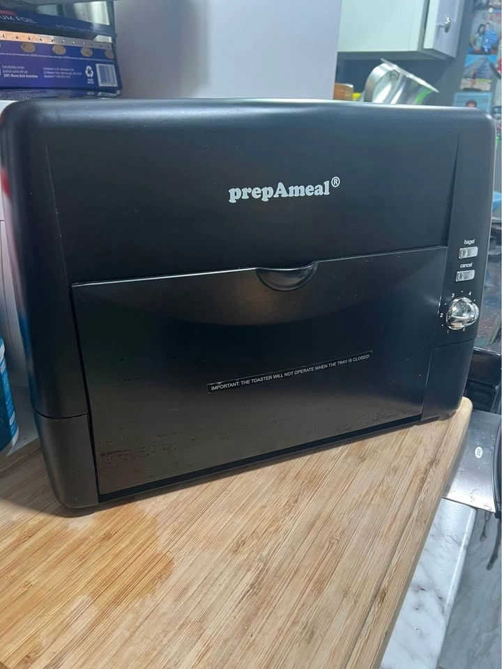 PrepAmeal toaster used 2x. Purchased by mistake, all my appliances are white so it doesn’t match with anything. Brand new but I didn’t keep the box.