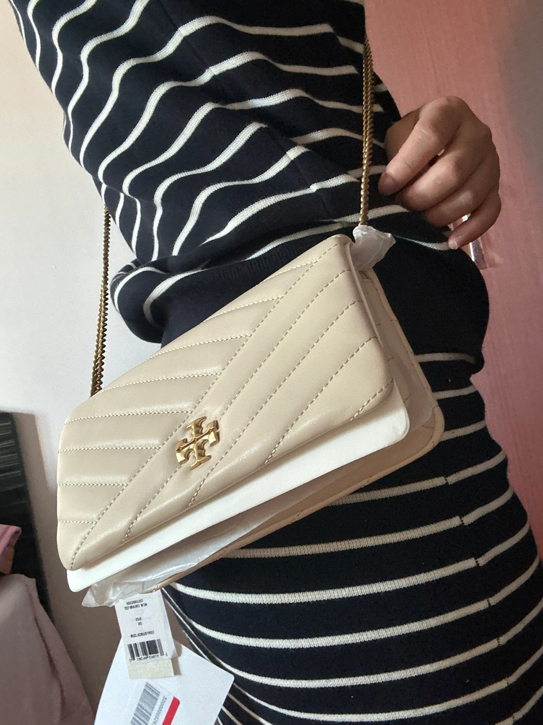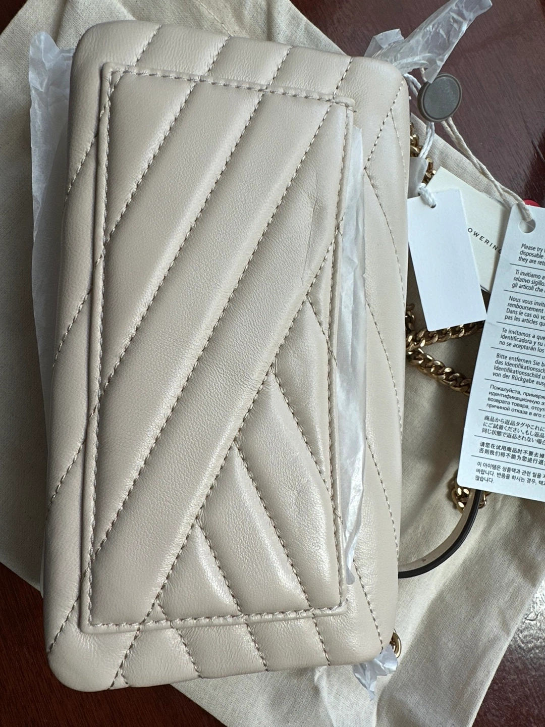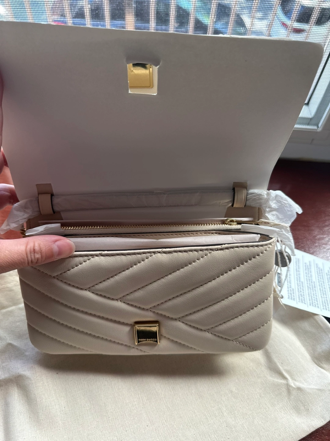 Shoulder bag in a neutral color. It features a gold chain strap and a gold logo. It has a quilted design, adding visual interest. A perfect companion for your next outing, allowing you to stay organized and chic.