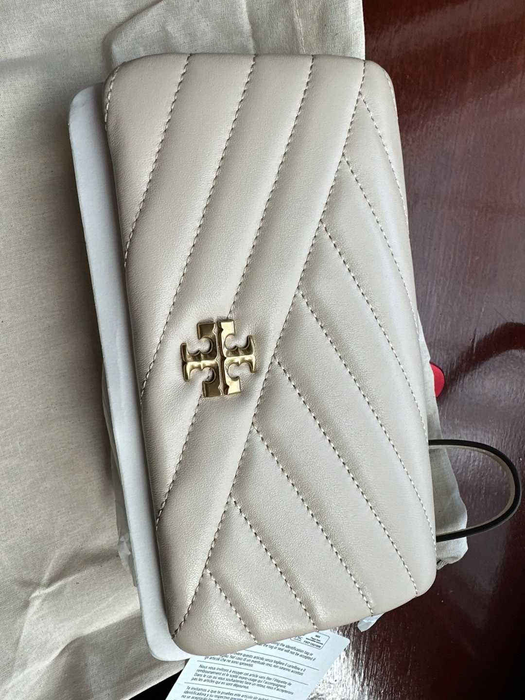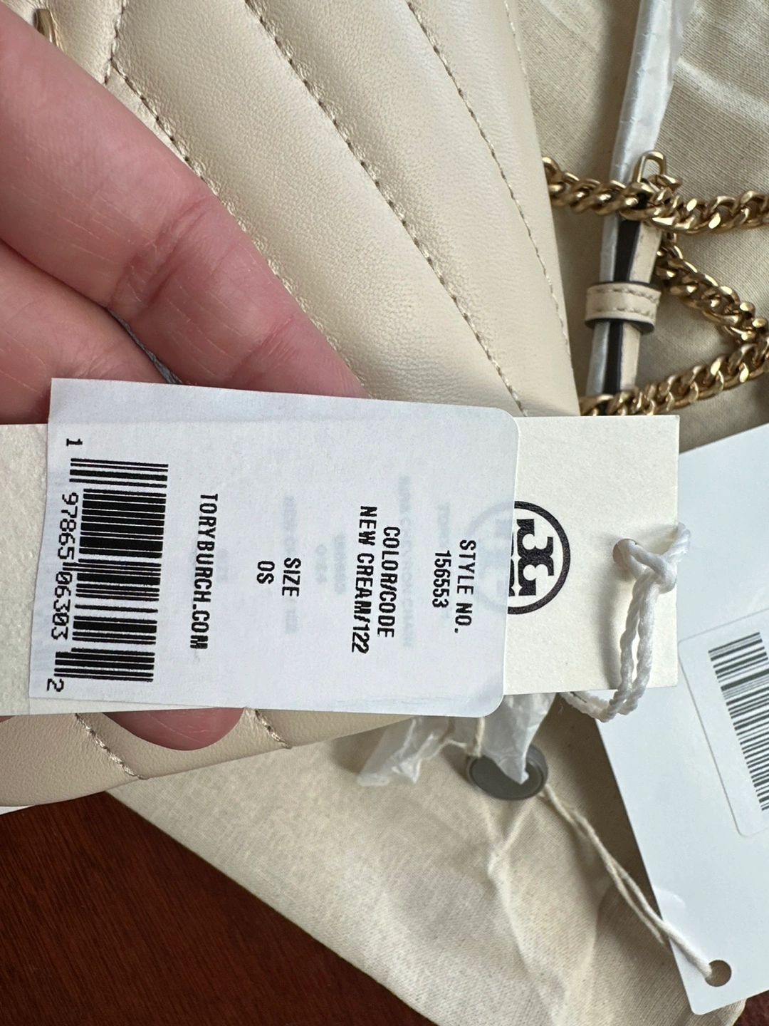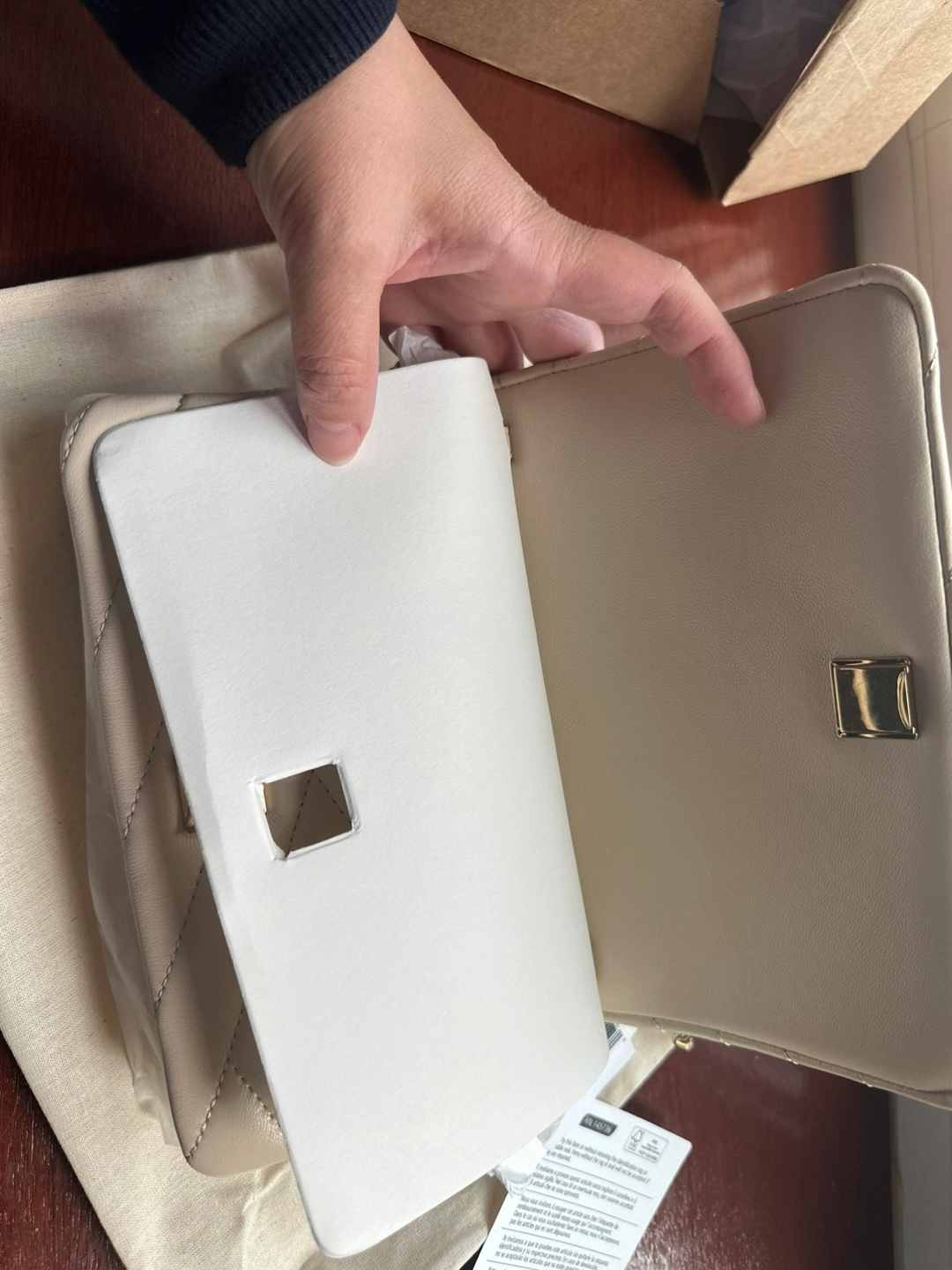 Shoulder bag in a neutral color. It features a gold chain strap and a gold logo. It has a quilted design, adding visual interest. A perfect companion for your next outing, allowing you to stay organized and chic.