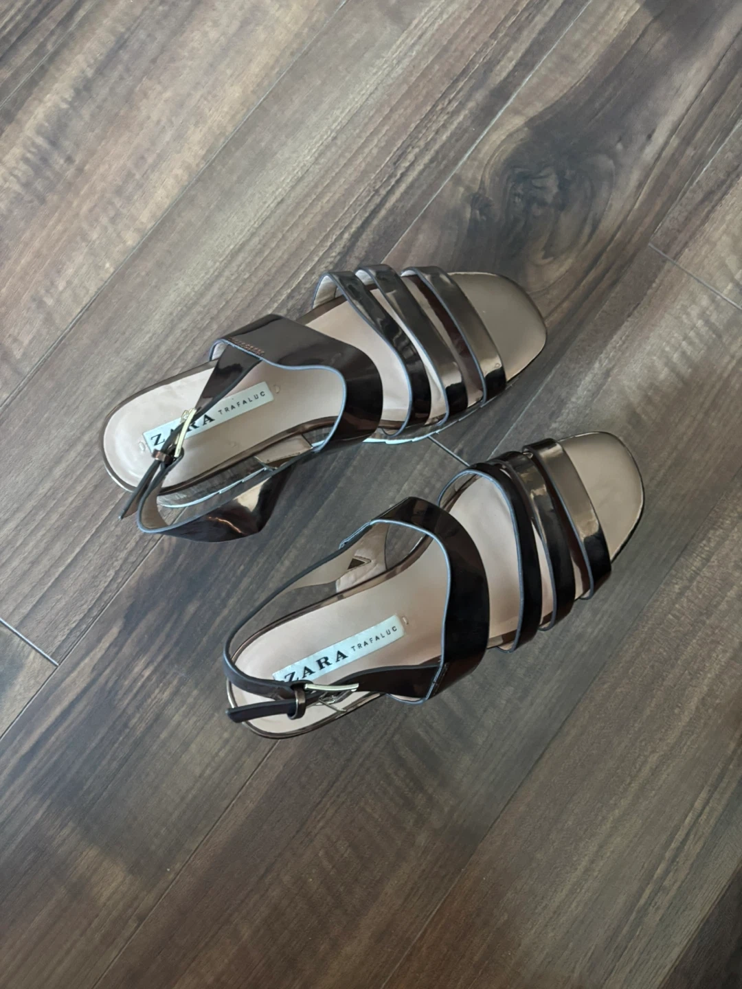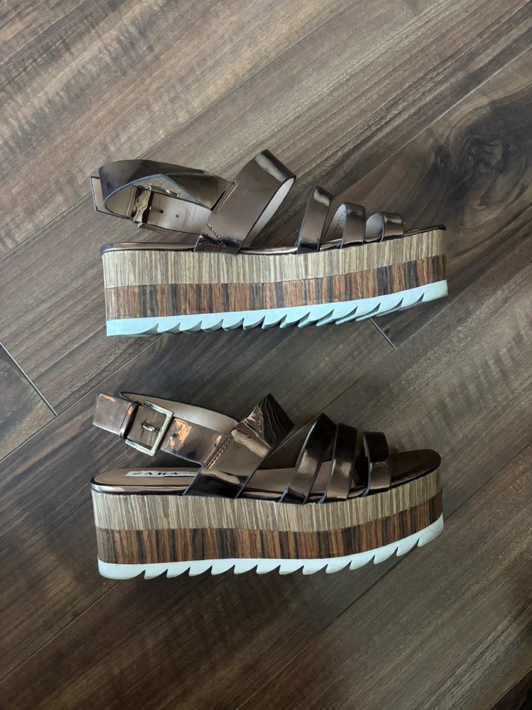 These are ZARA platform sandals in a metallic copper colour. They have a stacked wooden-look platform and strappy upper with an ankle buckle closure. These sandals are stylish and give you a bit of height!