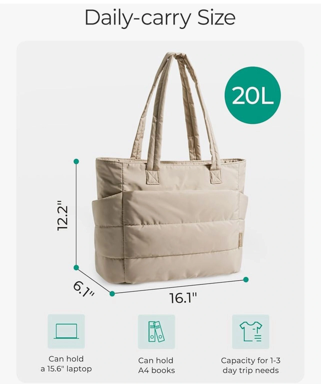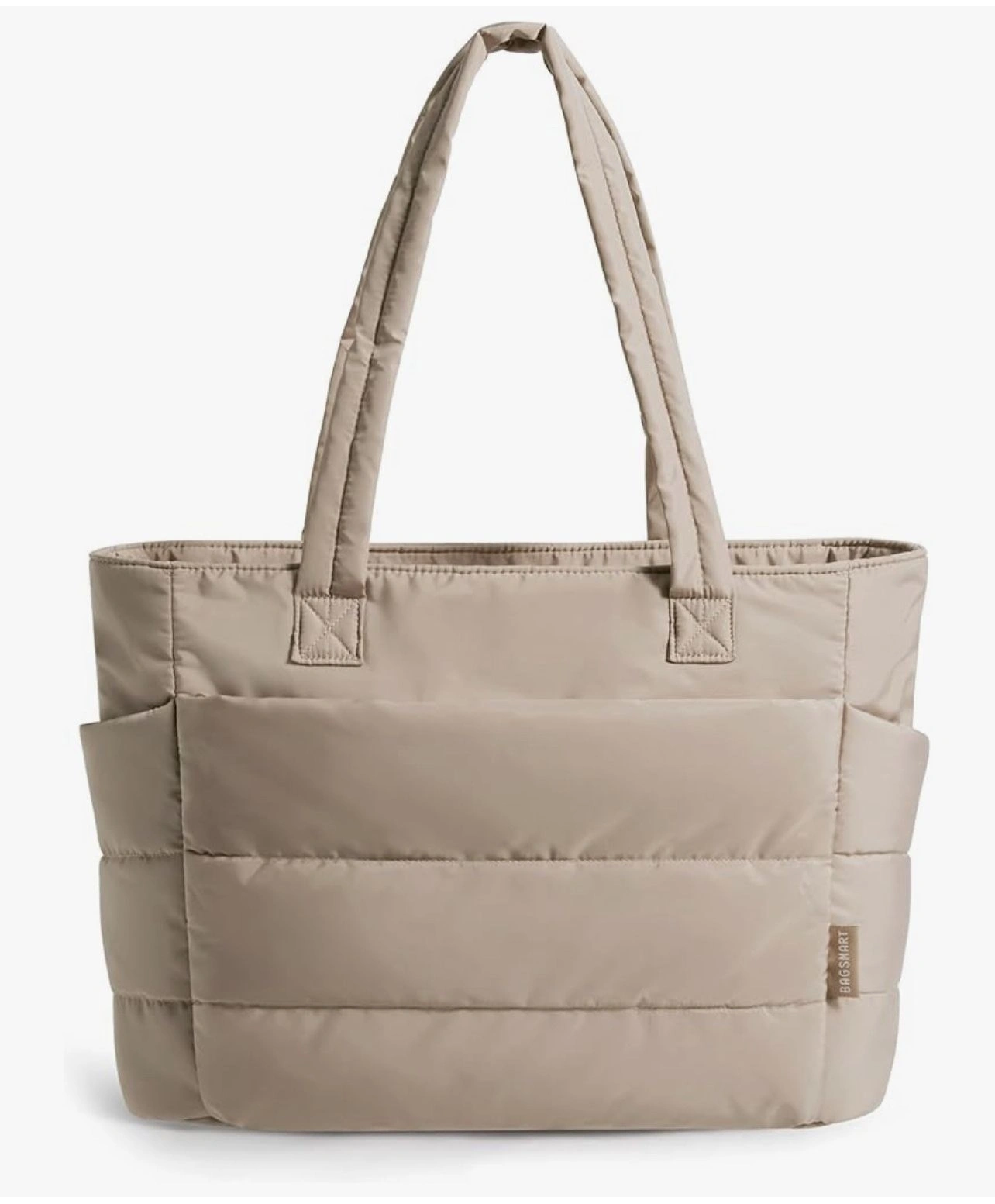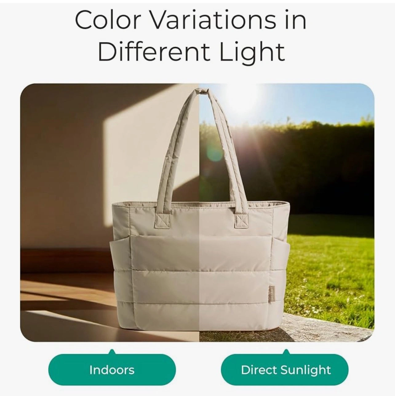 The Trend Era of Puffer Bag is Approaching: "A puffer bag can effortlessly complement various outfits," says Brenda Iris, image consultant, stylist, and founder of Mindful Styling in Minneapolis, Minnesota. Compact Size: Standard Size: 16.1''L x 6.1''Wx 12.2''H. Slim Size - 13.2''L x 5.1''Wx 15.7'H. Capacity 20L. The quilted tote bag suitable daily necessities such as 15.6'' laptops, Umbrella, water cup, power banks, clothes, shoes, etc. The zipper closure design ensures the safety. Ultra Lightweight Material : Weighs only 0.99 pounds. Made of durable, soft and light taslan fabric. The puffer tote bag is easy to carry. Good choice of travel bag. Versatile Tote: It can be used as a work bag, laptop bag, gym bag, beach tote bag, casual shoulder bag, or travel bag. Suitable for work, beach, travel, shopping, gym and more occasion Features: Waterproof, Water resistant, Laptop compartment, Inner pockets Color: Grayish brown Material: Made of durable soft and light Taslan Fabric Style: Tote