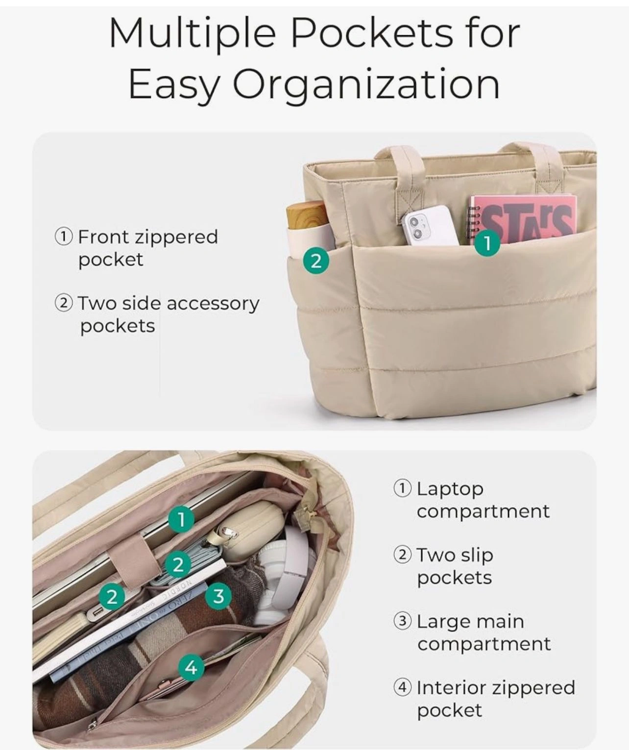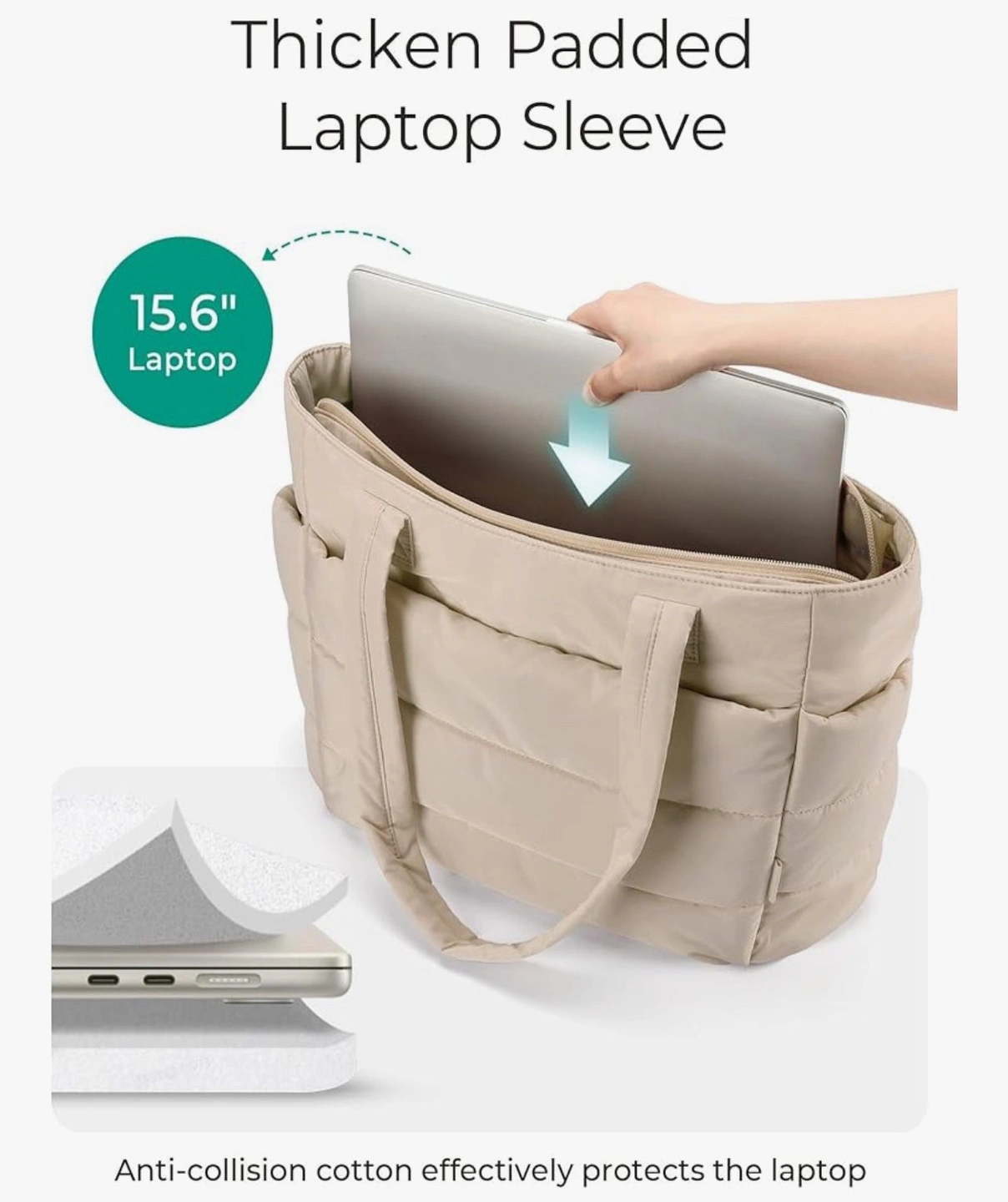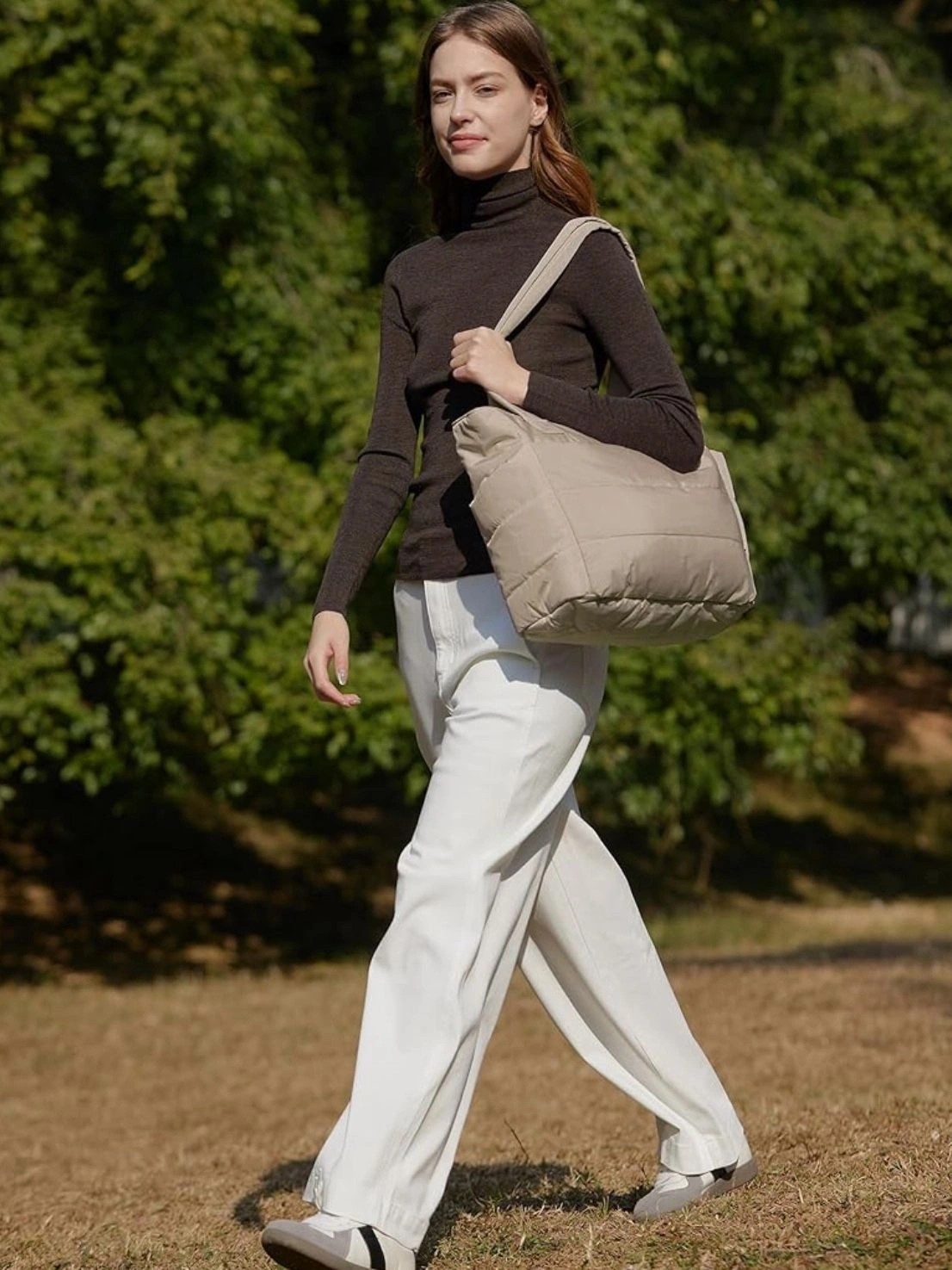 The Trend Era of Puffer Bag is Approaching: "A puffer bag can effortlessly complement various outfits," says Brenda Iris, image consultant, stylist, and founder of Mindful Styling in Minneapolis, Minnesota. Compact Size: Standard Size: 16.1''L x 6.1''Wx 12.2''H. Slim Size - 13.2''L x 5.1''Wx 15.7'H. Capacity 20L. The quilted tote bag suitable daily necessities such as 15.6'' laptops, Umbrella, water cup, power banks, clothes, shoes, etc. The zipper closure design ensures the safety. Ultra Lightweight Material : Weighs only 0.99 pounds. Made of durable, soft and light taslan fabric. The puffer tote bag is easy to carry. Good choice of travel bag. Versatile Tote: It can be used as a work bag, laptop bag, gym bag, beach tote bag, casual shoulder bag, or travel bag. Suitable for work, beach, travel, shopping, gym and more occasion Features: Waterproof, Water resistant, Laptop compartment, Inner pockets Color: Grayish brown Material: Made of durable soft and light Taslan Fabric Style: Tote