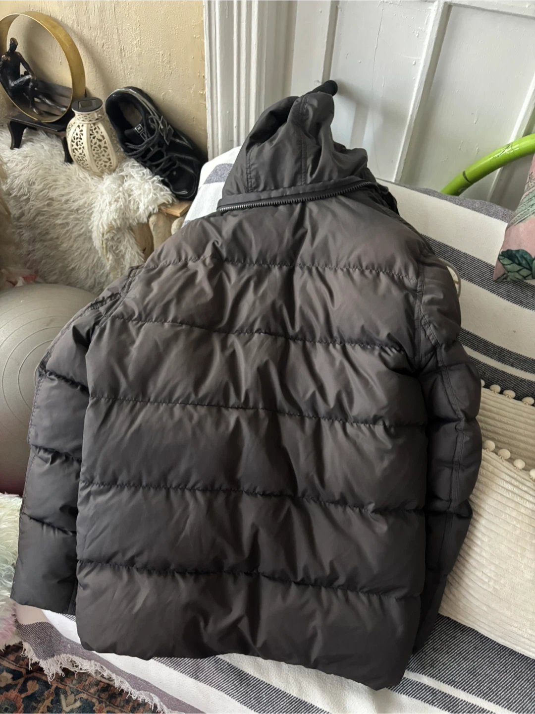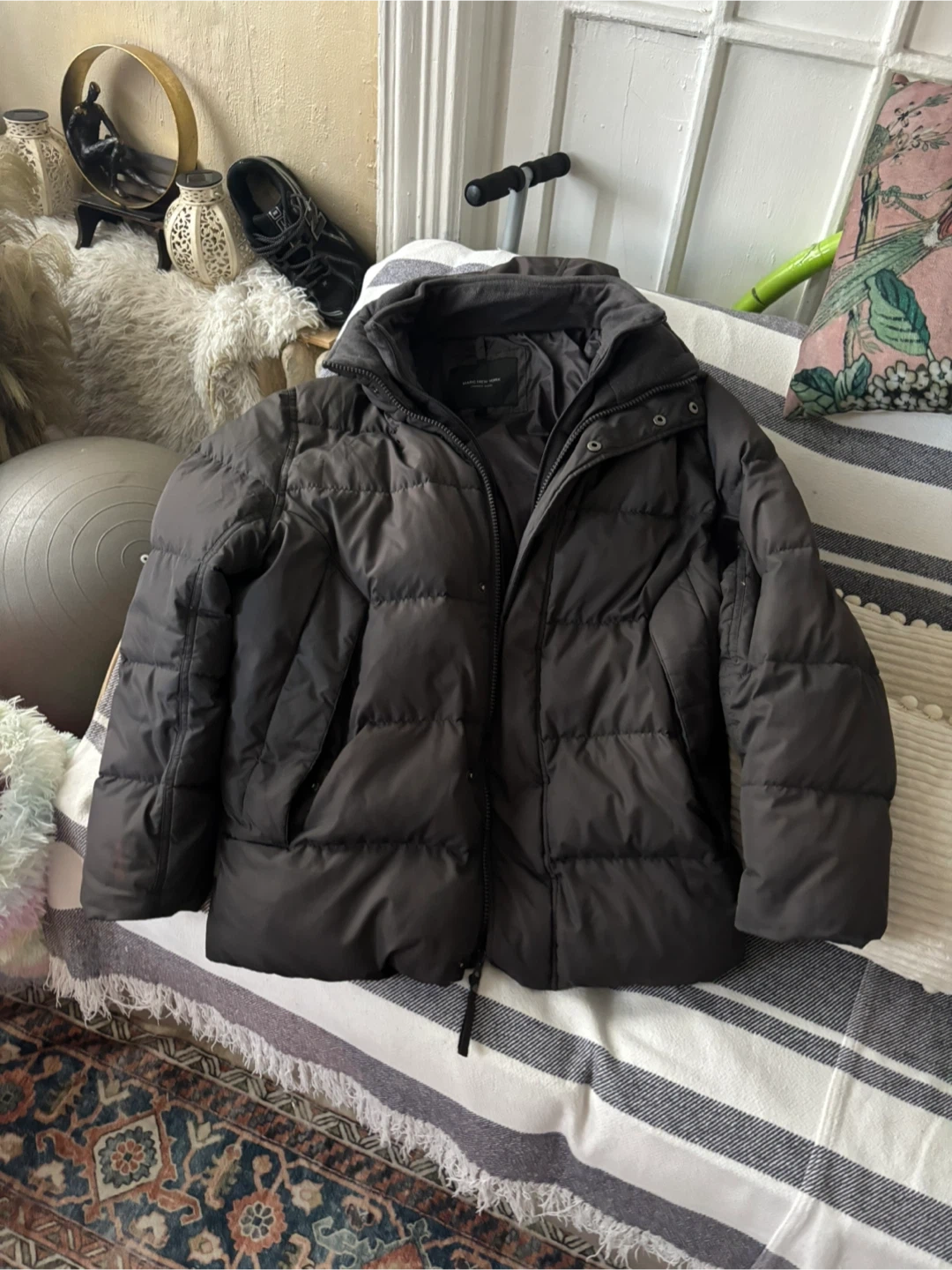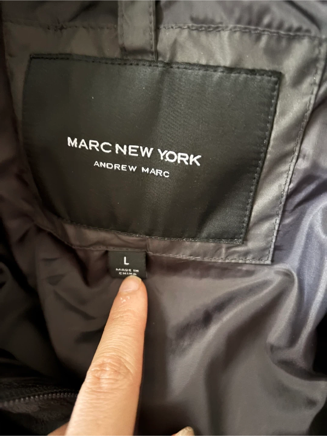 Marc New York Andrew Marc puffer jacket in dark gray. Size large. This jacket features a full zip closure and a hood. It's made in China.