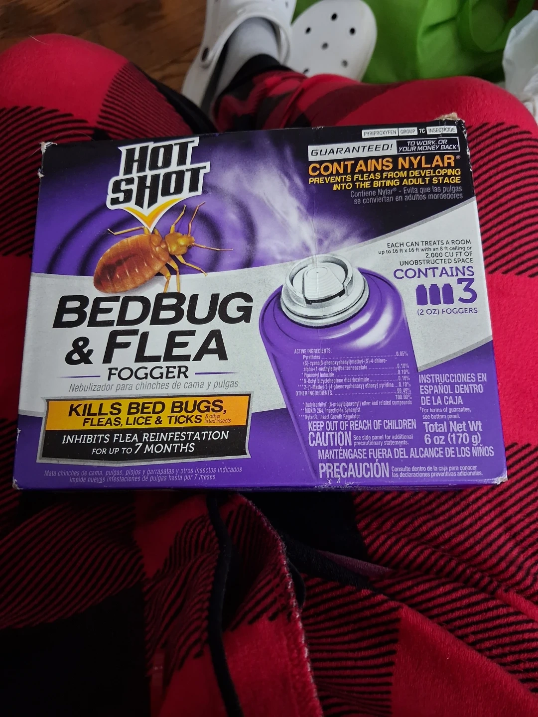 This Hot Shot Bedbug & Flea Fogger contains Nylar to prevent fleas from developing into the biting adult stage. It kills bed bugs, fleas, lice, and ticks. Inhibits flea reinfestation for up to 7 months. Each can treats a room up to 16 ft x 16 ft.
