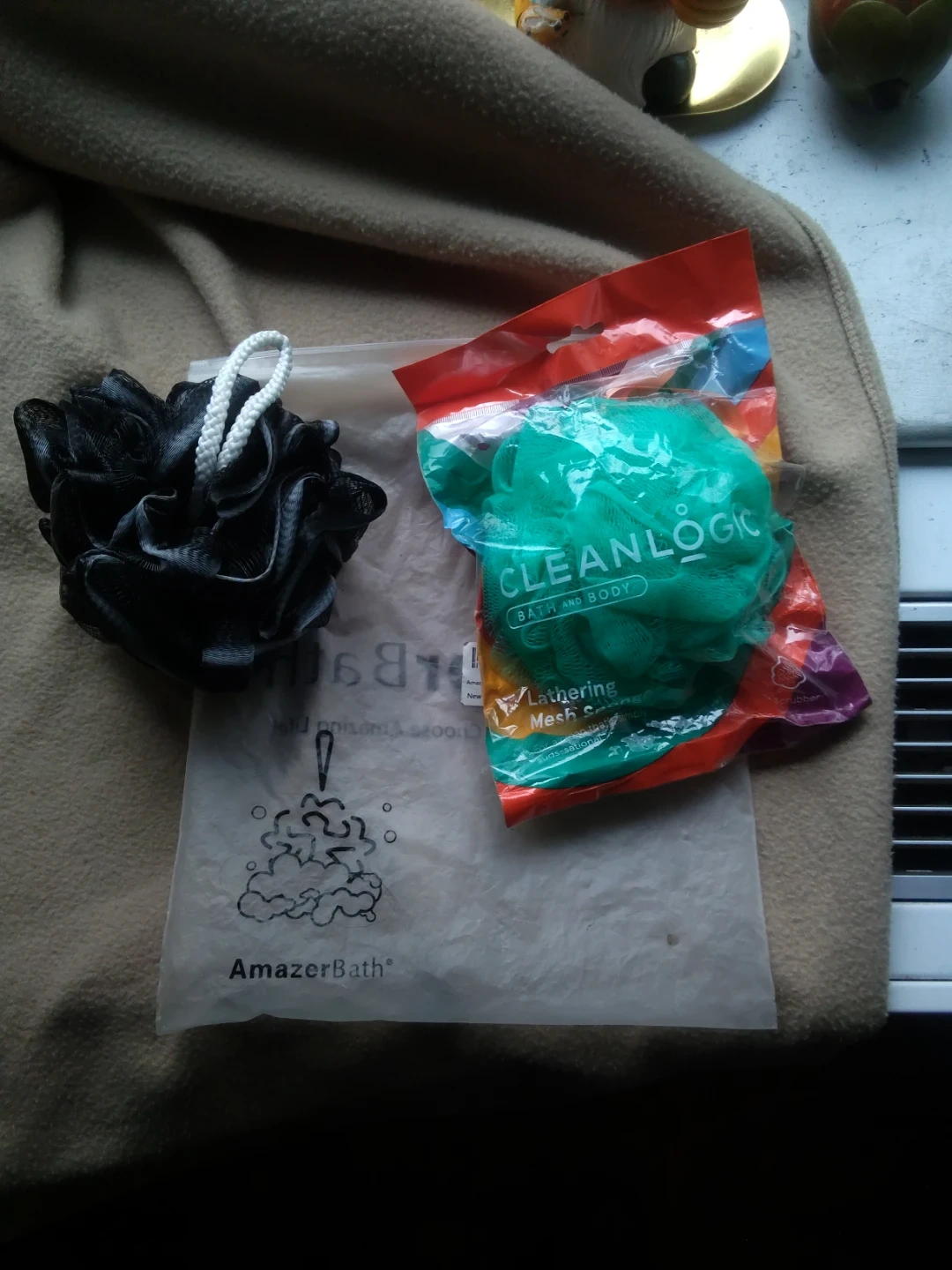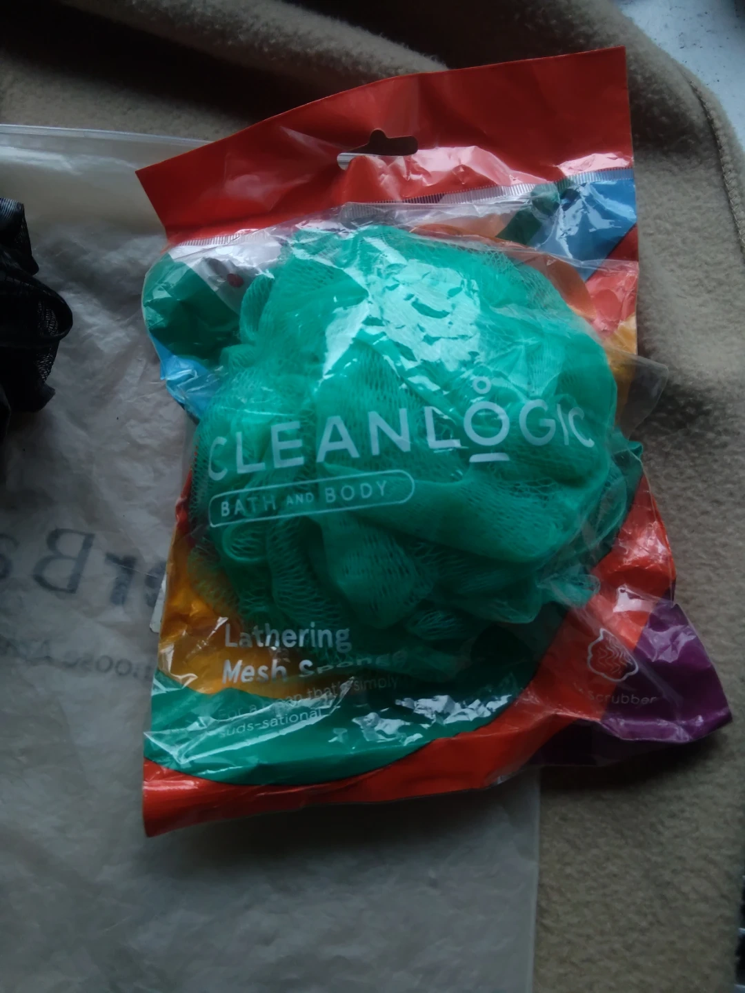 This is a green CleanLogic lathering mesh scrubber for bath and body. It's designed to create rich lather. The scrubber is packaged for sale. Another black pouf is also included, but its brand is not visible.