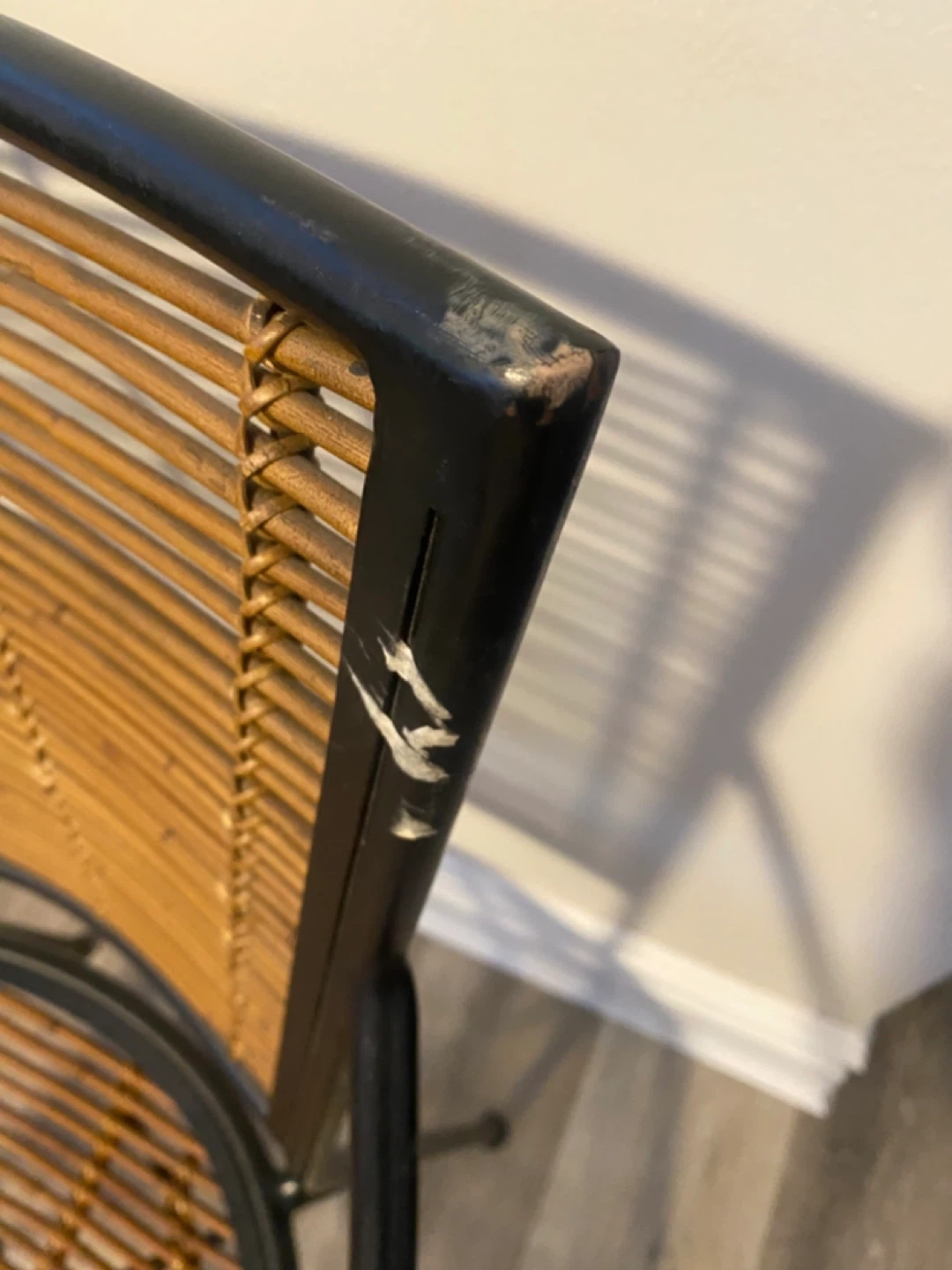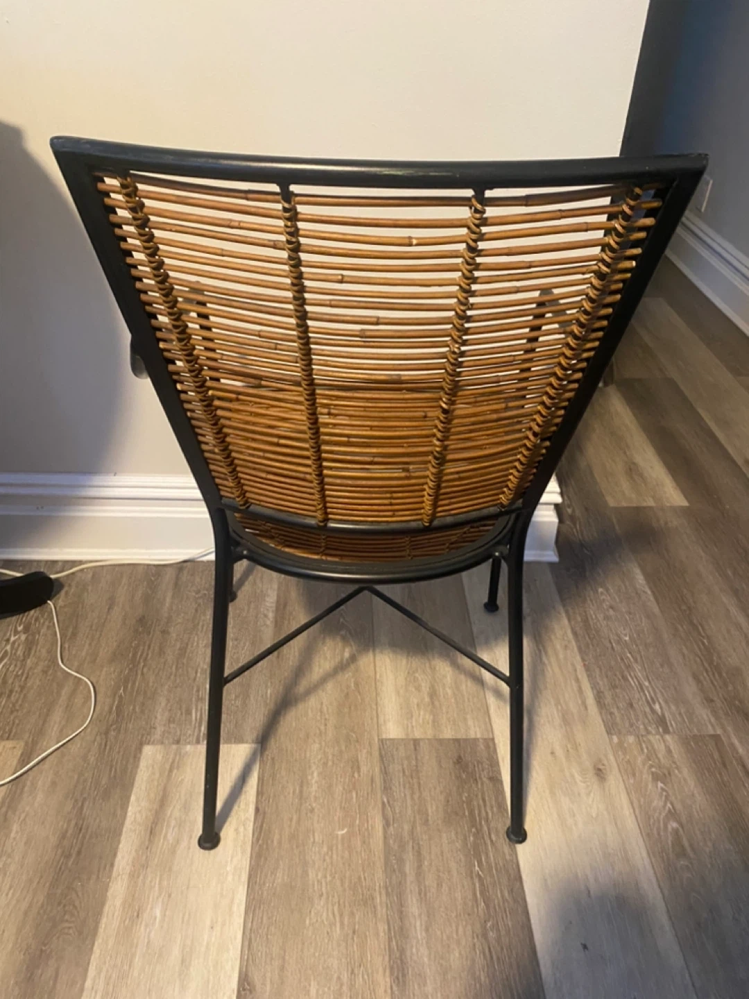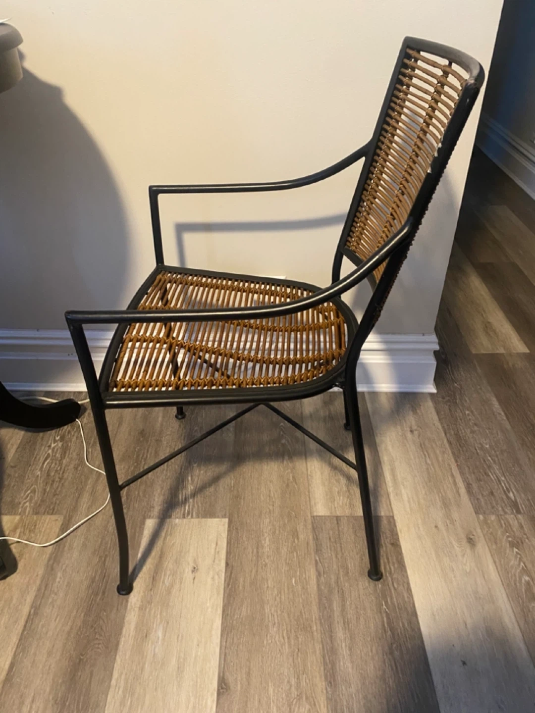 This armchair features a black metal frame with woven rattan seat and back. It's a stylish piece for indoor or outdoor use! The metal frame has some minor scratches and leftover sticky tape, visible in photos. Originally from CB2.
