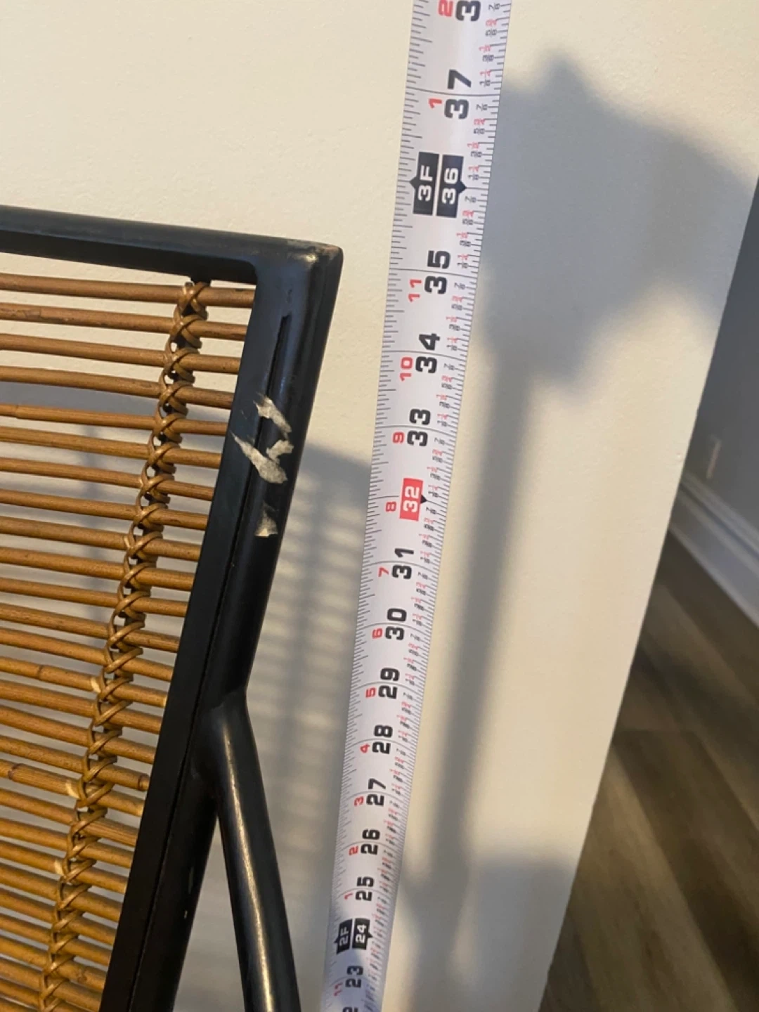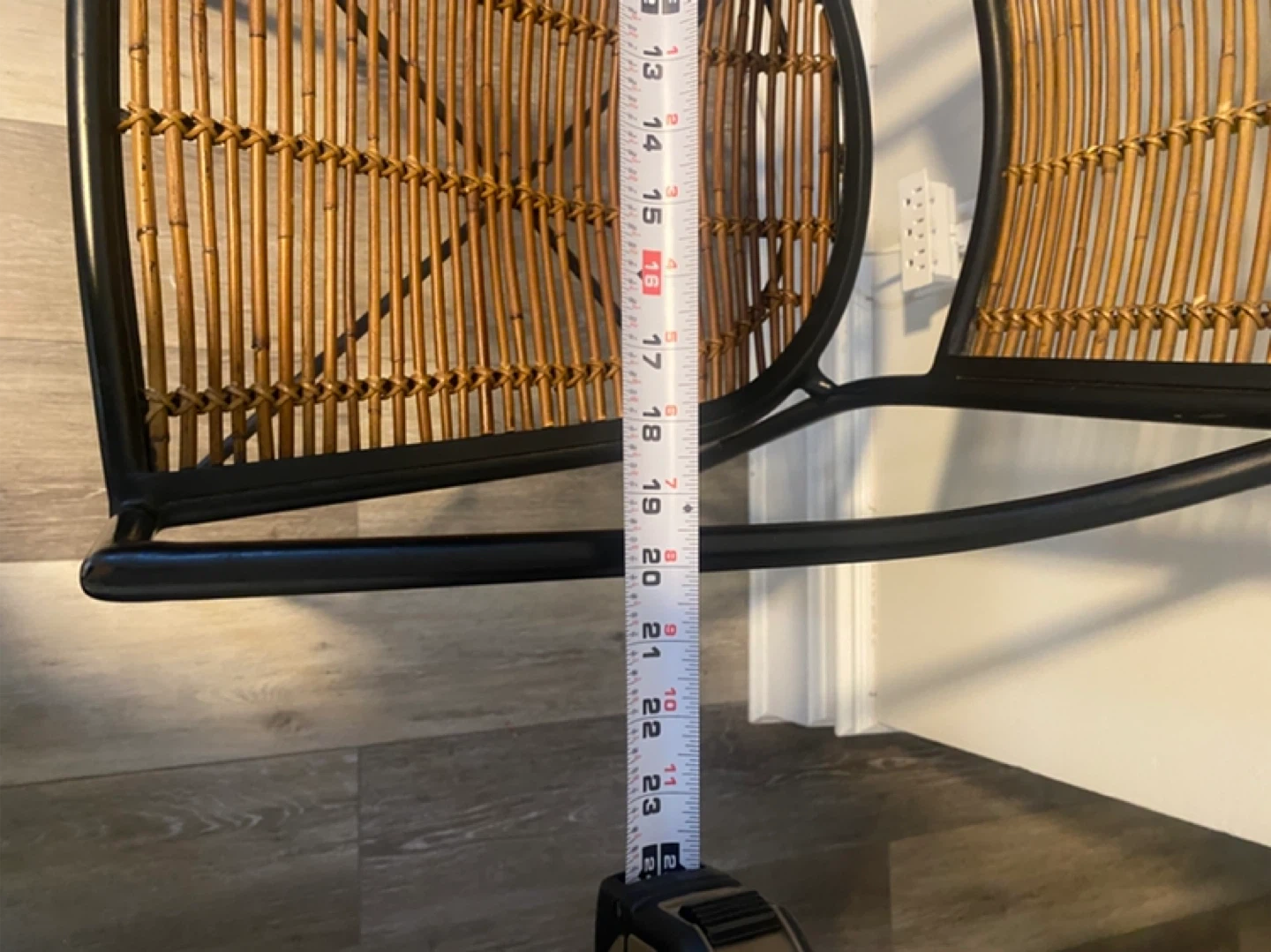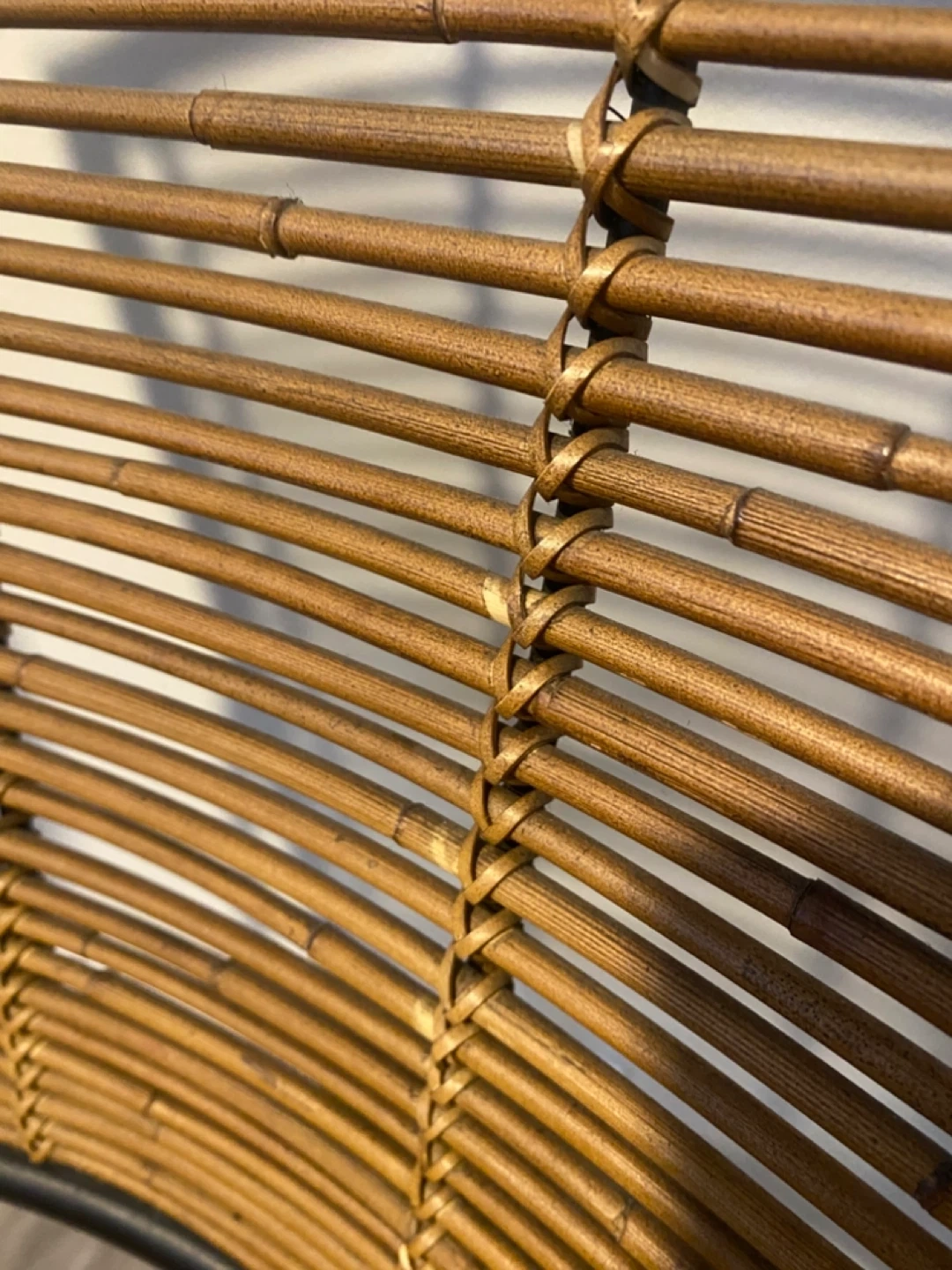 This armchair features a black metal frame with woven rattan seat and back. It's a stylish piece for indoor or outdoor use! The metal frame has some minor scratches and leftover sticky tape, visible in photos. Originally from CB2.