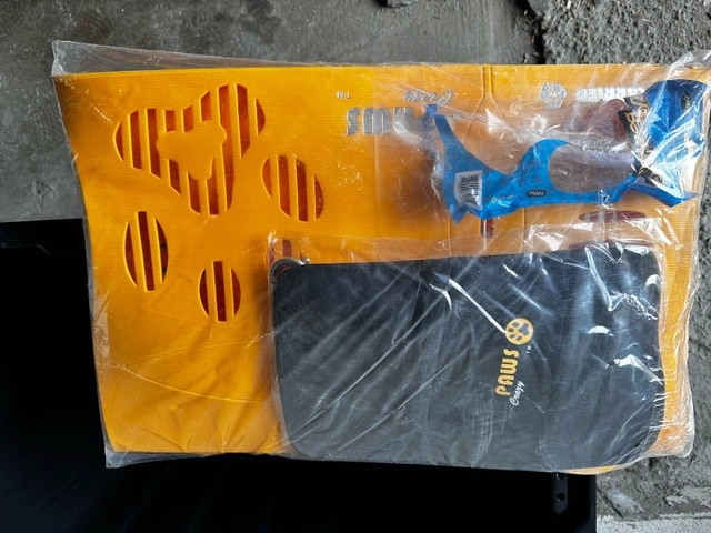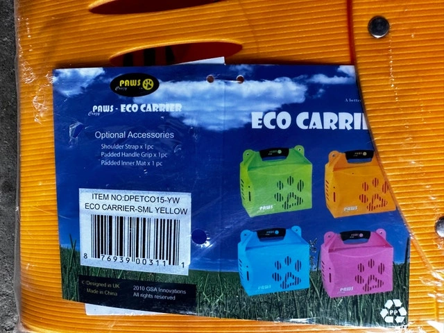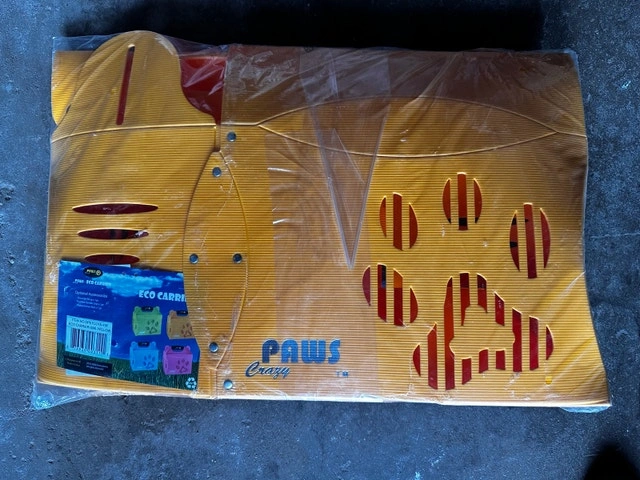 Offering a brand new Paws Eco Carrier, small size, in vibrant yellow. This eco-friendly carrier includes a shoulder strap, padded handle grip, and a padded inner mat for your pet's comfort. Perfect for small dogs or cats! If you're seeing this ad, it's still available.