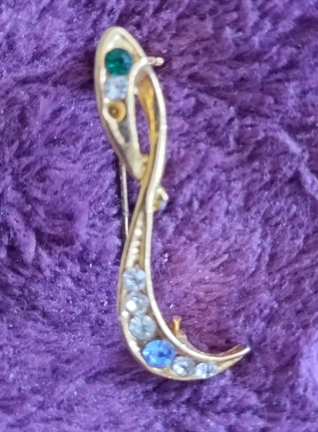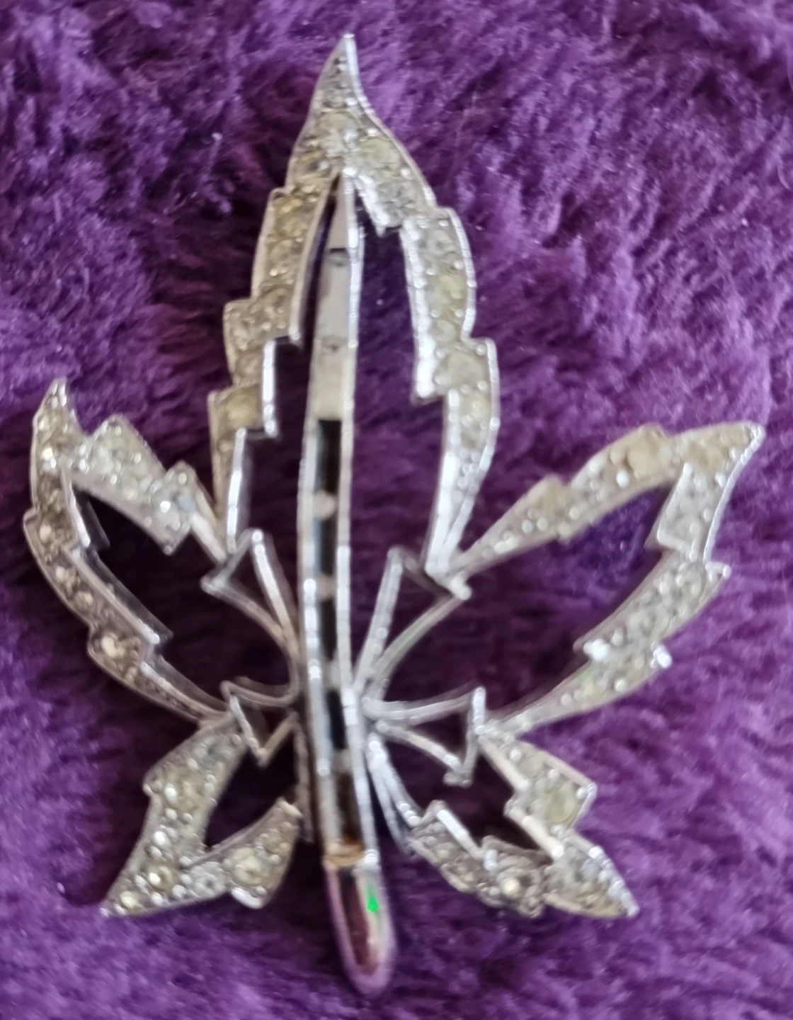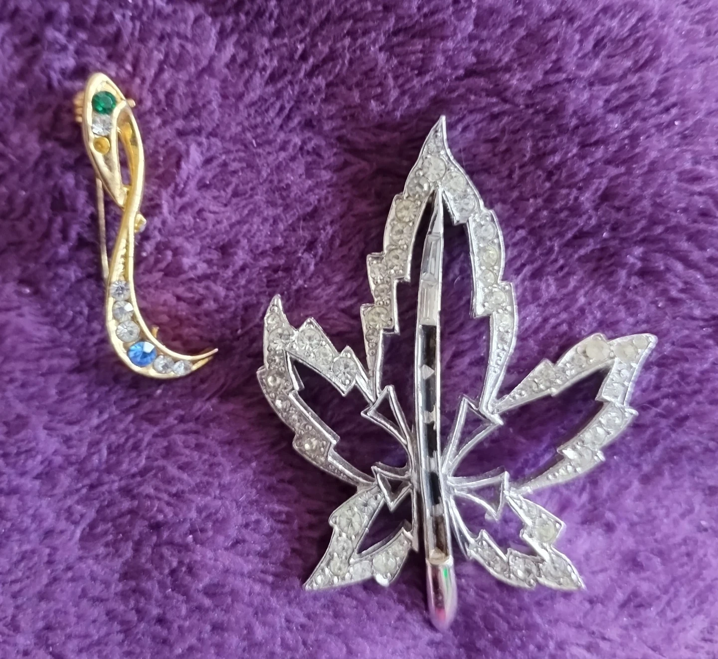 This lot includes a silver-toned brooch shaped like a maple leaf, adorned with black rhinestones. There's also a gold-toned abstract brooch featuring green, blue, and clear rhinestones. Both are pin-back brooches.