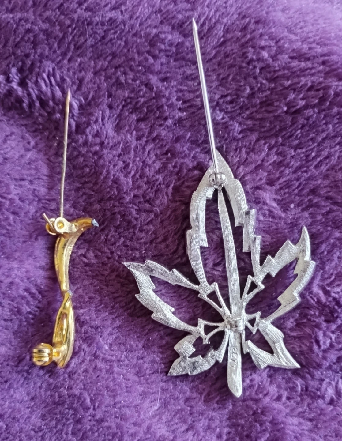 Two brooches: silver maple leaf and gold abstract
